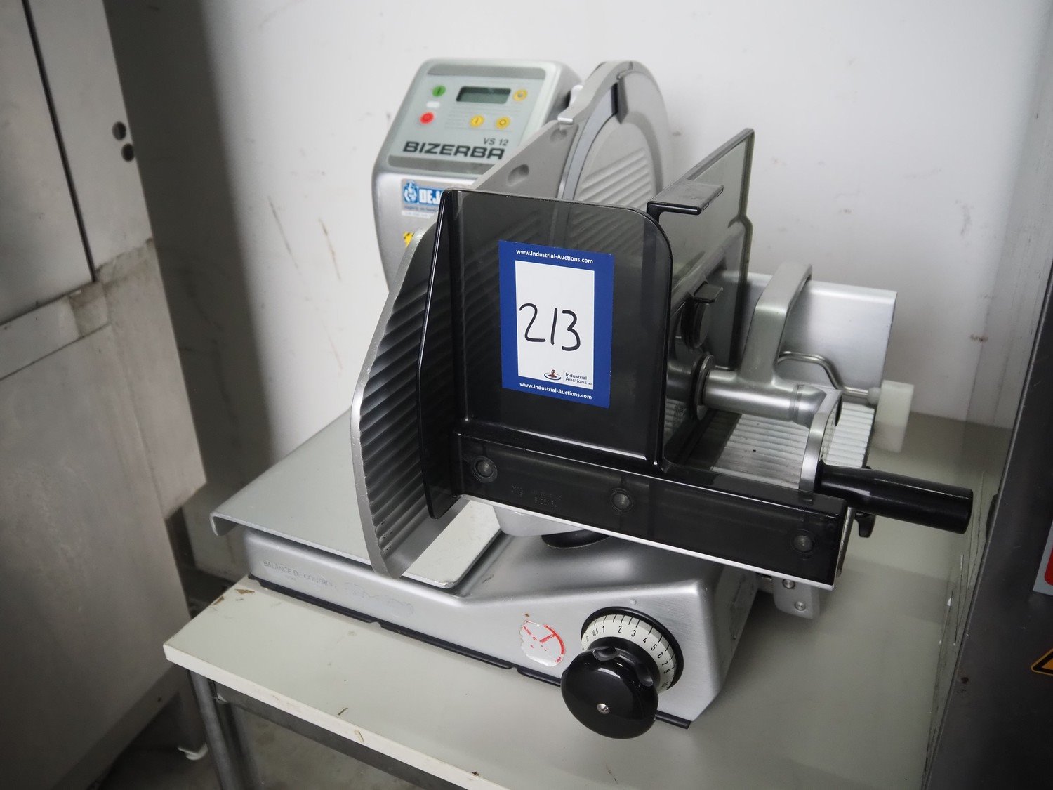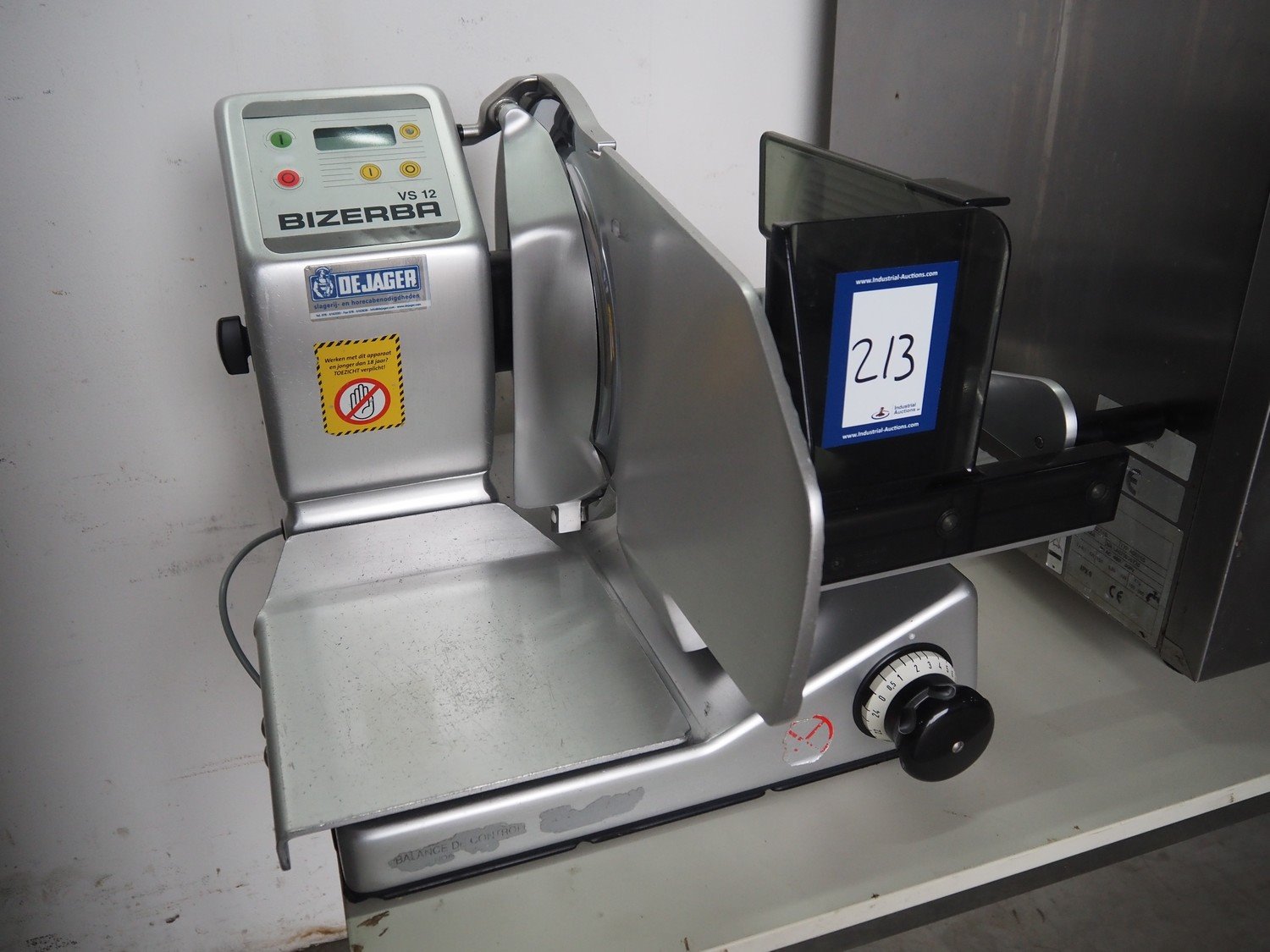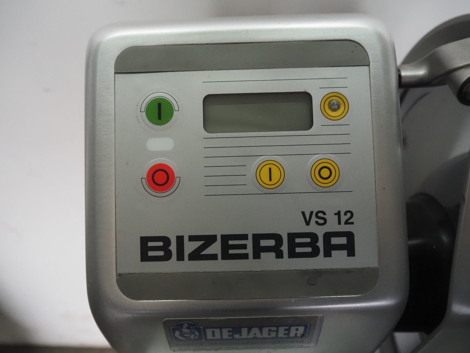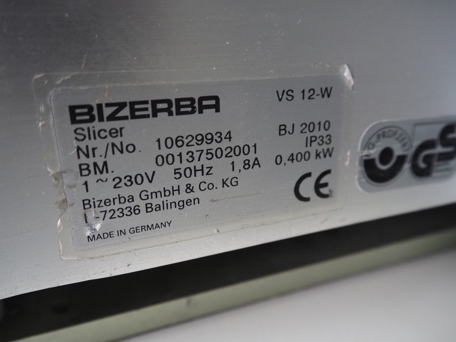 Bizerba slicer, model: VS 12-W, number; 10629934, year of construction: 2010, 230 V, 1 Ph, 50 Hz, 1.8 A, 0.400 kW, dimensions: 600 mm x 600 mm x 450 mm. Including knife sharpener.