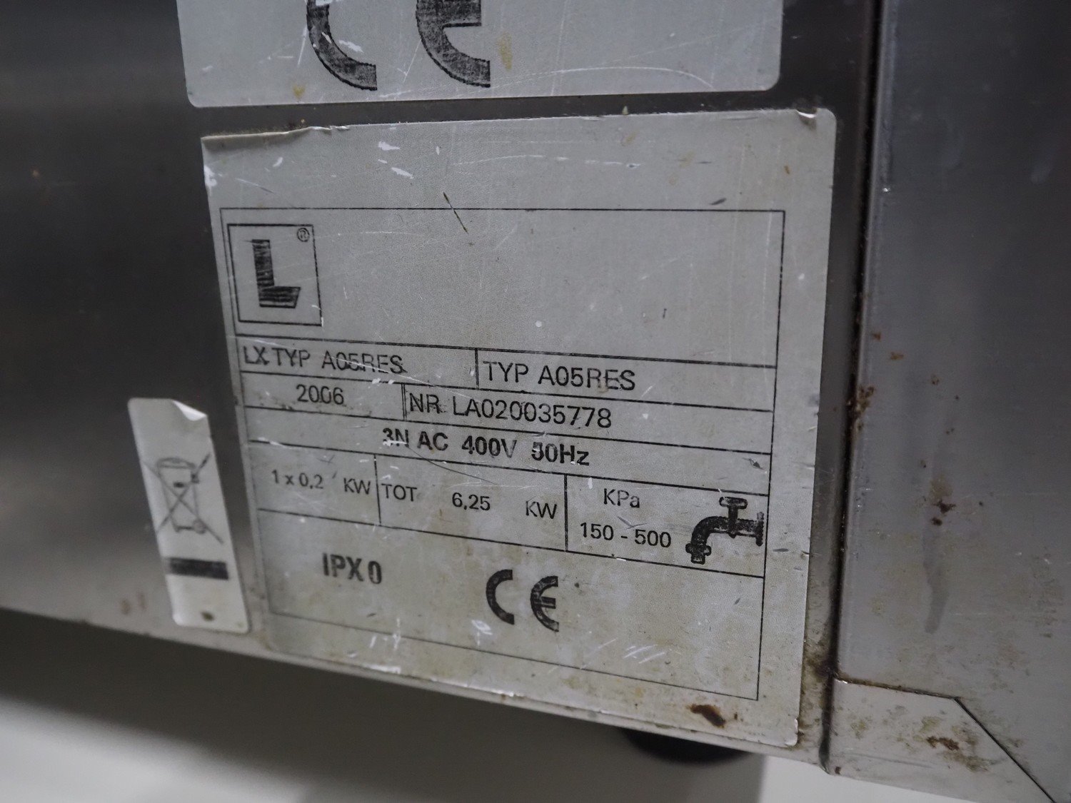 Alphatech combi steamer, type: A05RES, number: LA020035778, year of construction: 2006, 400 V, 3 Ph, 50 Hz, 6.25 kW, 6 floors, floor dimensions: 500 m x 360 mm, total dimensions: 800 mm x 600 mm x 600 mm.