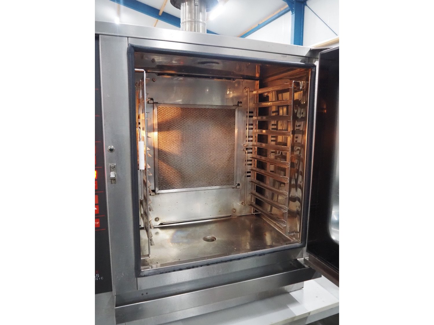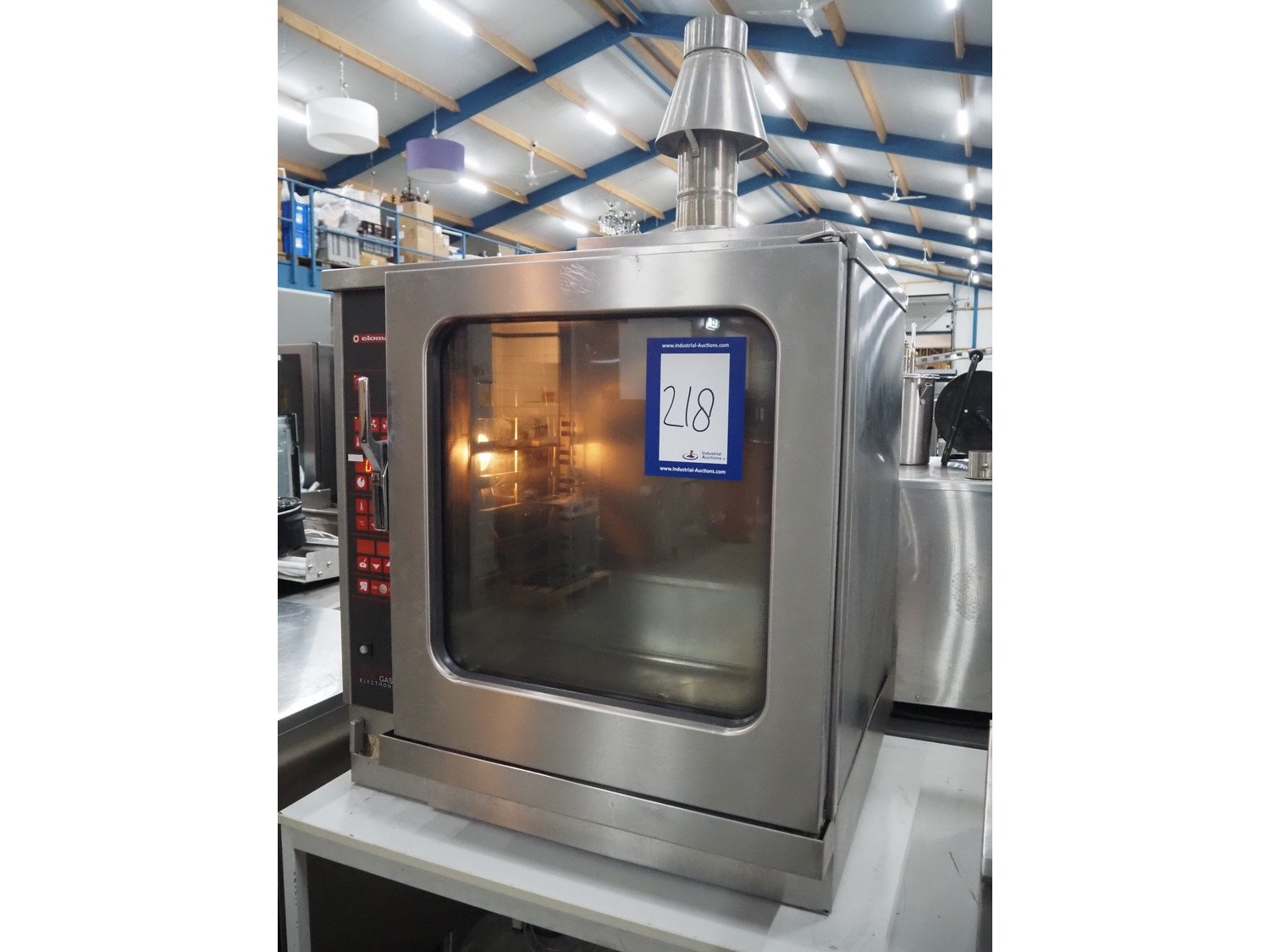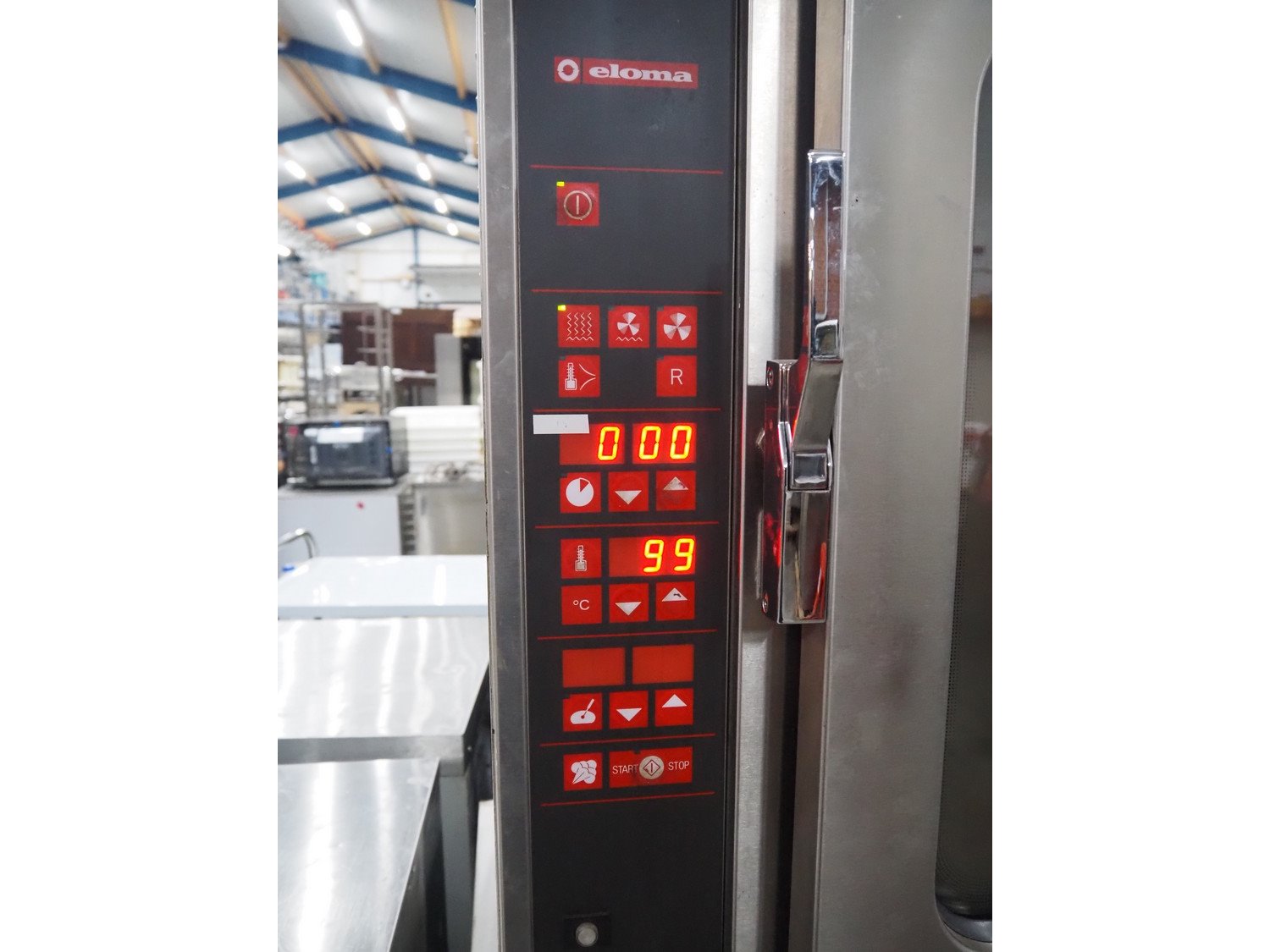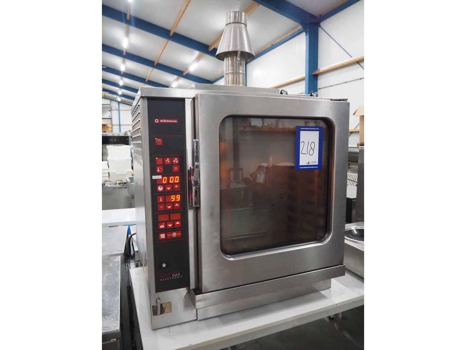 Eloma GmbH combi steamer, type: MMD 10-11 GAS, machine number: 144007 430, year of construction: 1996, 220 V, 1 Ph, 50 Hz, 0.3 kW, 10 floors, floor dimensions: 530 mm x 300 mm, total dimensions: 950 mm x 790 mm x 1500 mm.