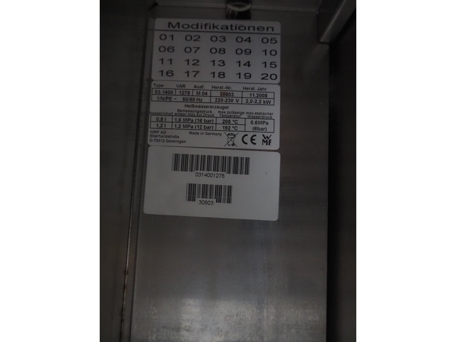 WMF coffee machine, type: 03.1400, number: 30803, year of construction: 11.2008, 220/230 V, 1 Ph, 50/60 Hz, 2.0/2.2 kW, dimensions: 600 mm x 330 mm x 680 mm.