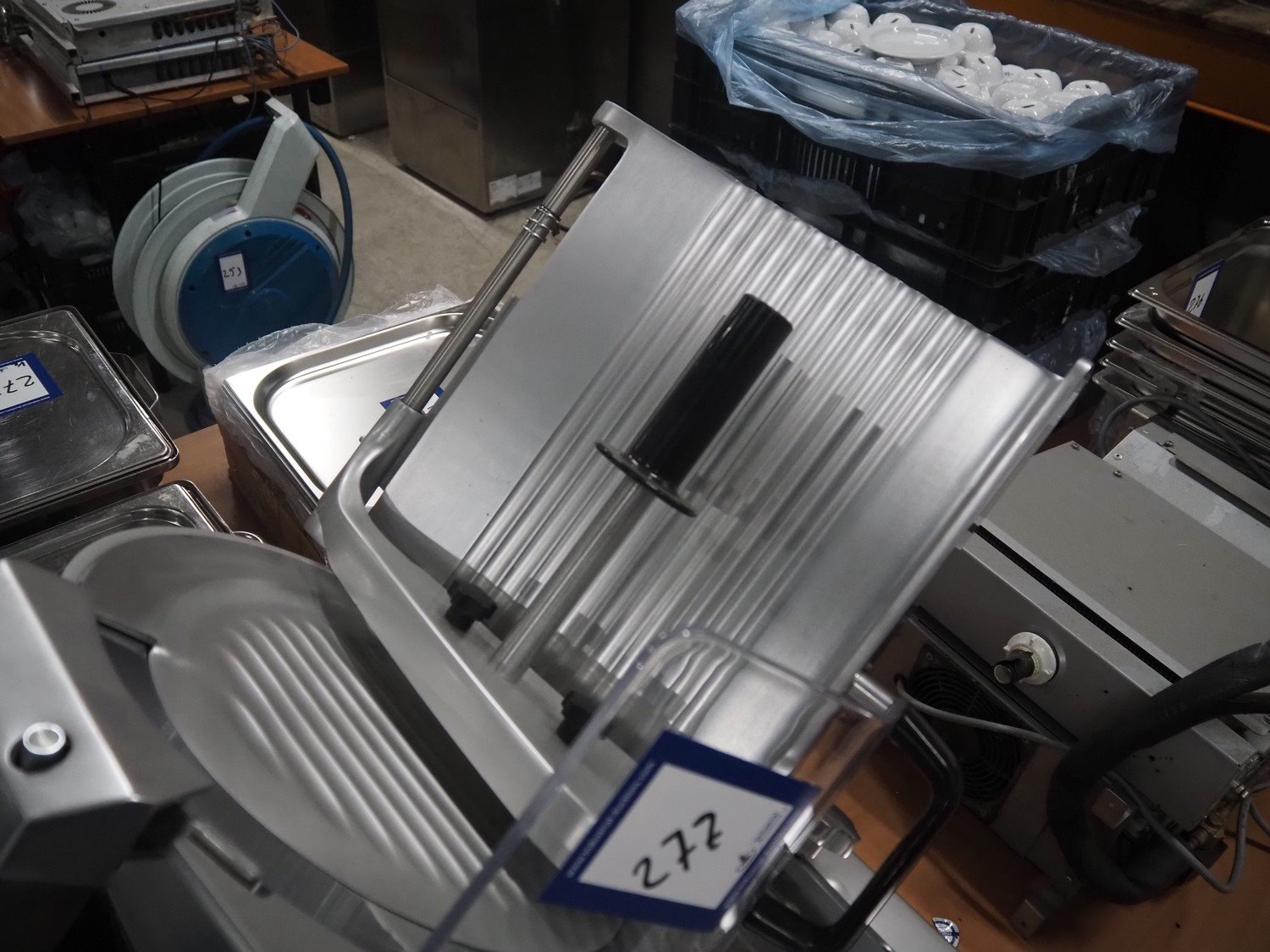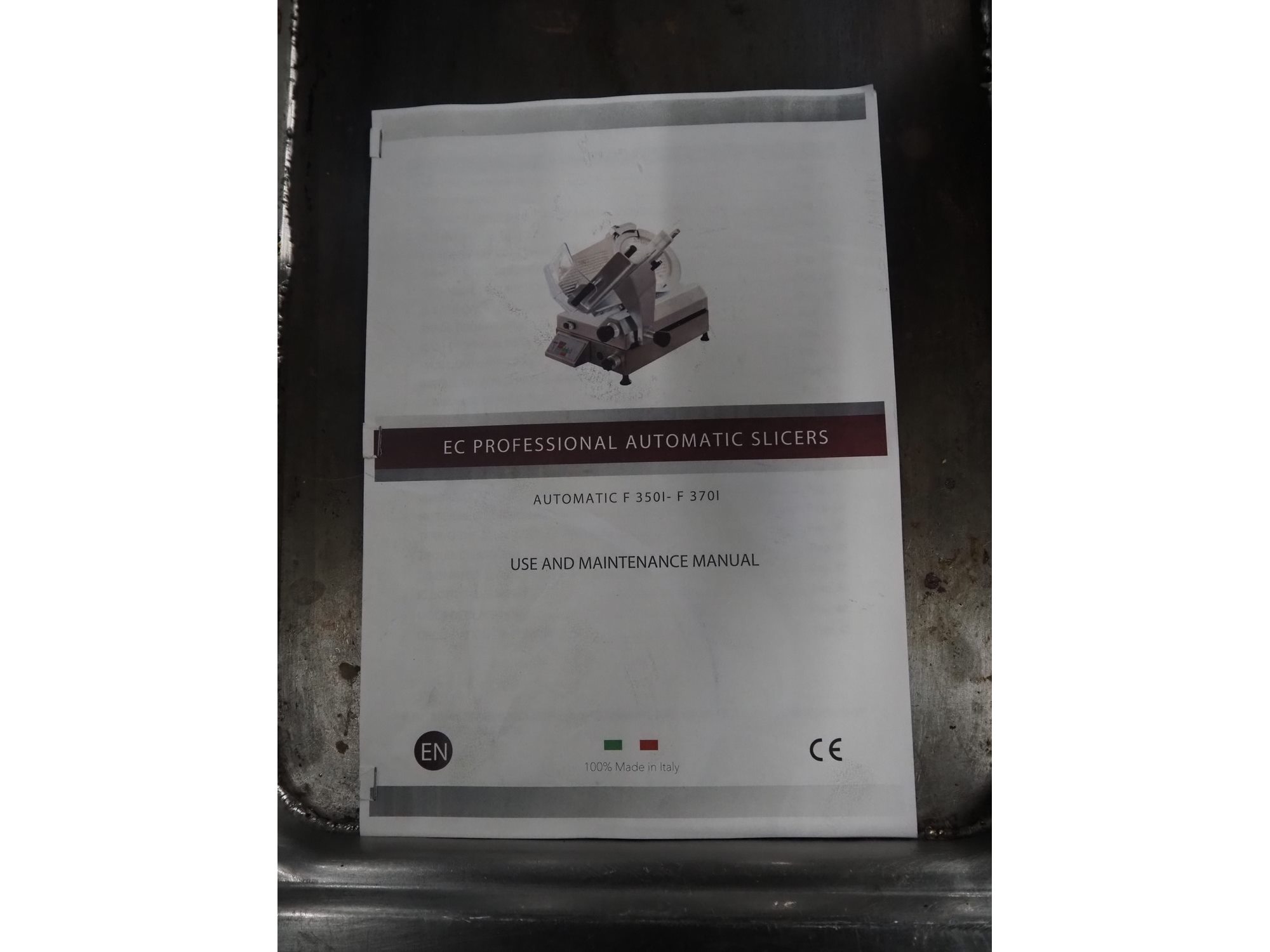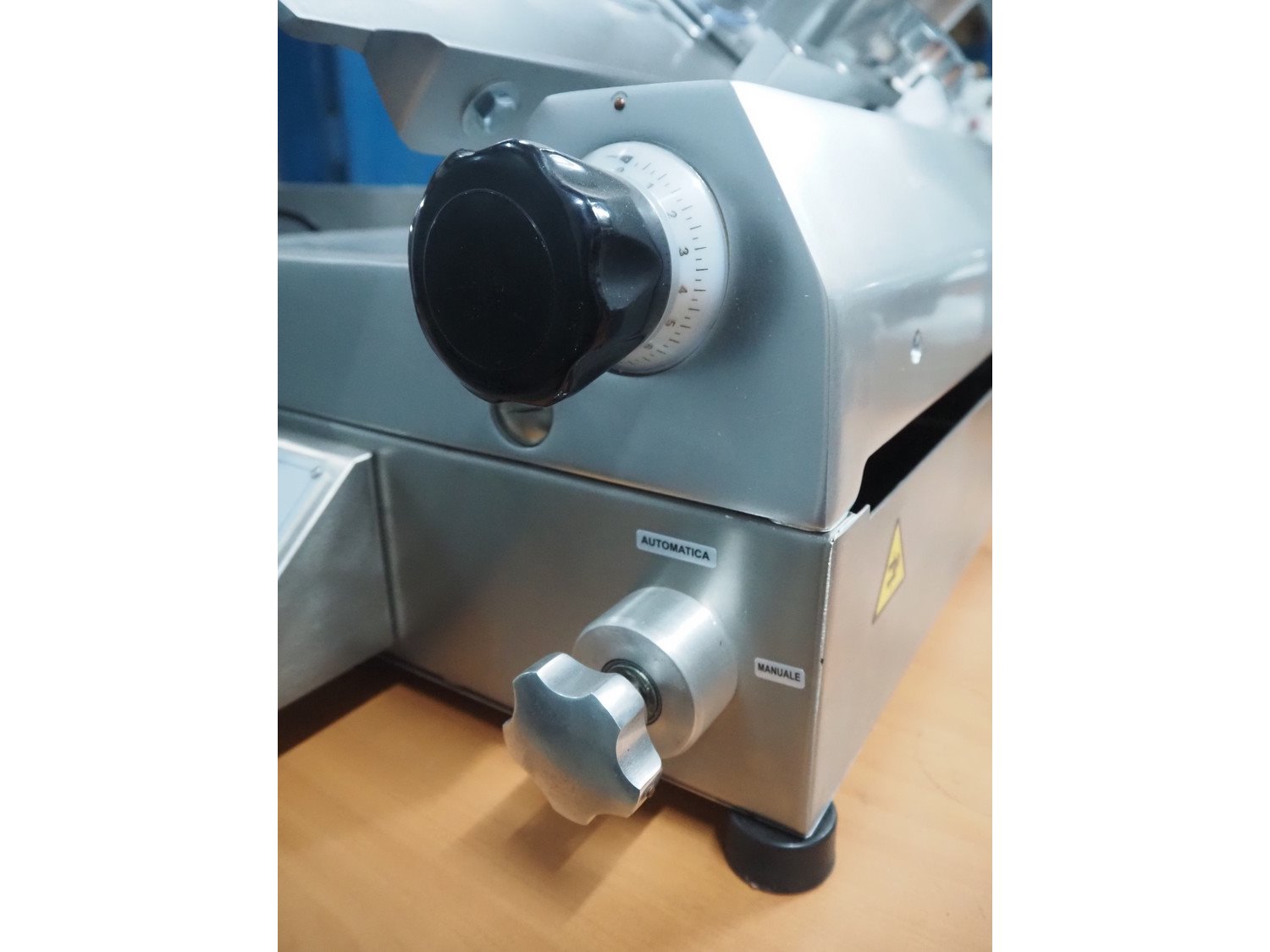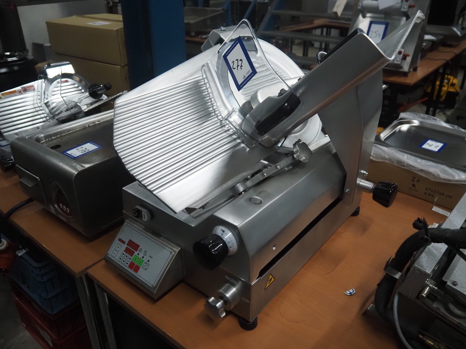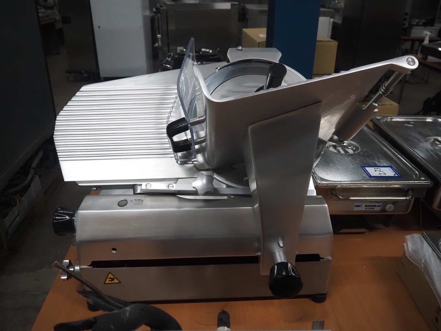 Saro Gastro-Products GmbH slicer, type: F 350 I, number: 22010221, year of construction: 2022, 230 V, 50 Hz, 0.370 kW, dimensions: 750 mm x 500 mm x 650 mm.