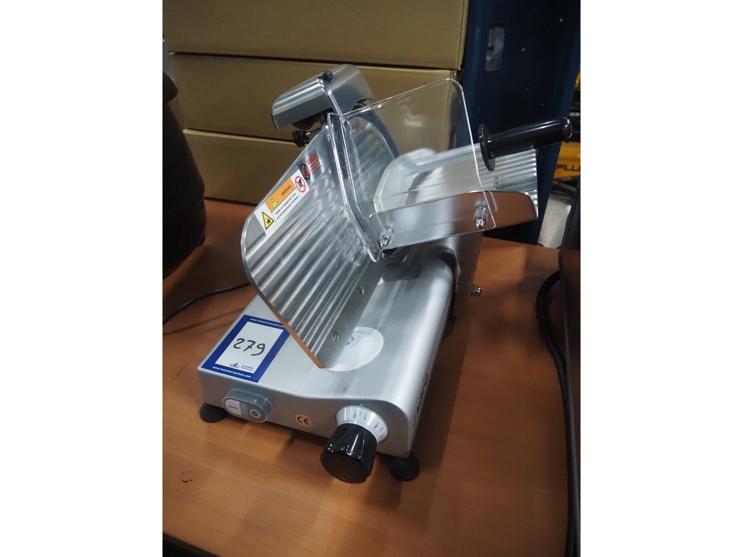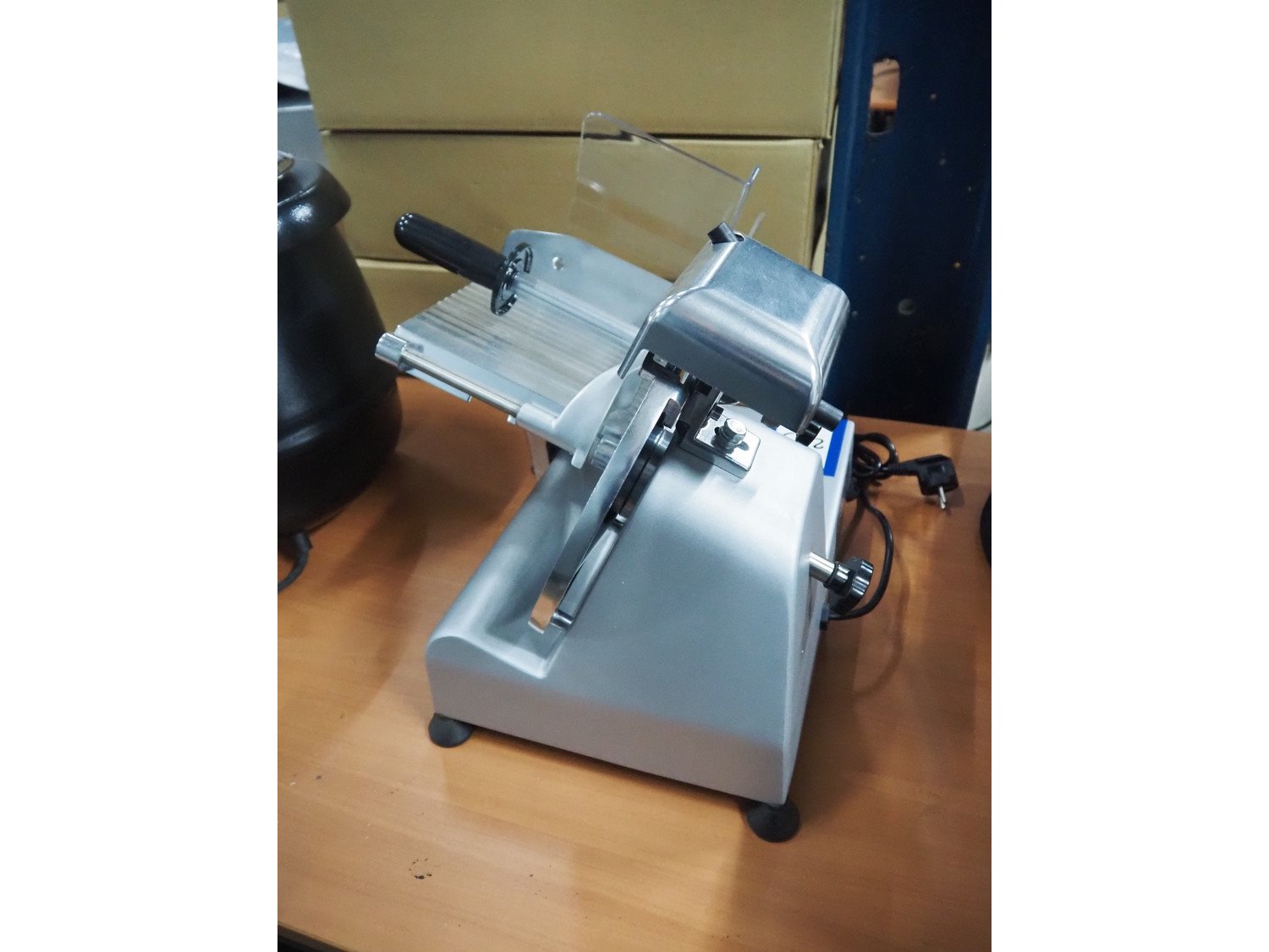 Saro Gastro-Products GmbH slicer, type: IVORNO/418-1003, serial number: 210820020, year of construction: 10.08.2021, 230 V, 1 Ph, 50 Hz, 1 A, 0.23 kW, dimensions: 500 mm x 400 mm x 360 mm.