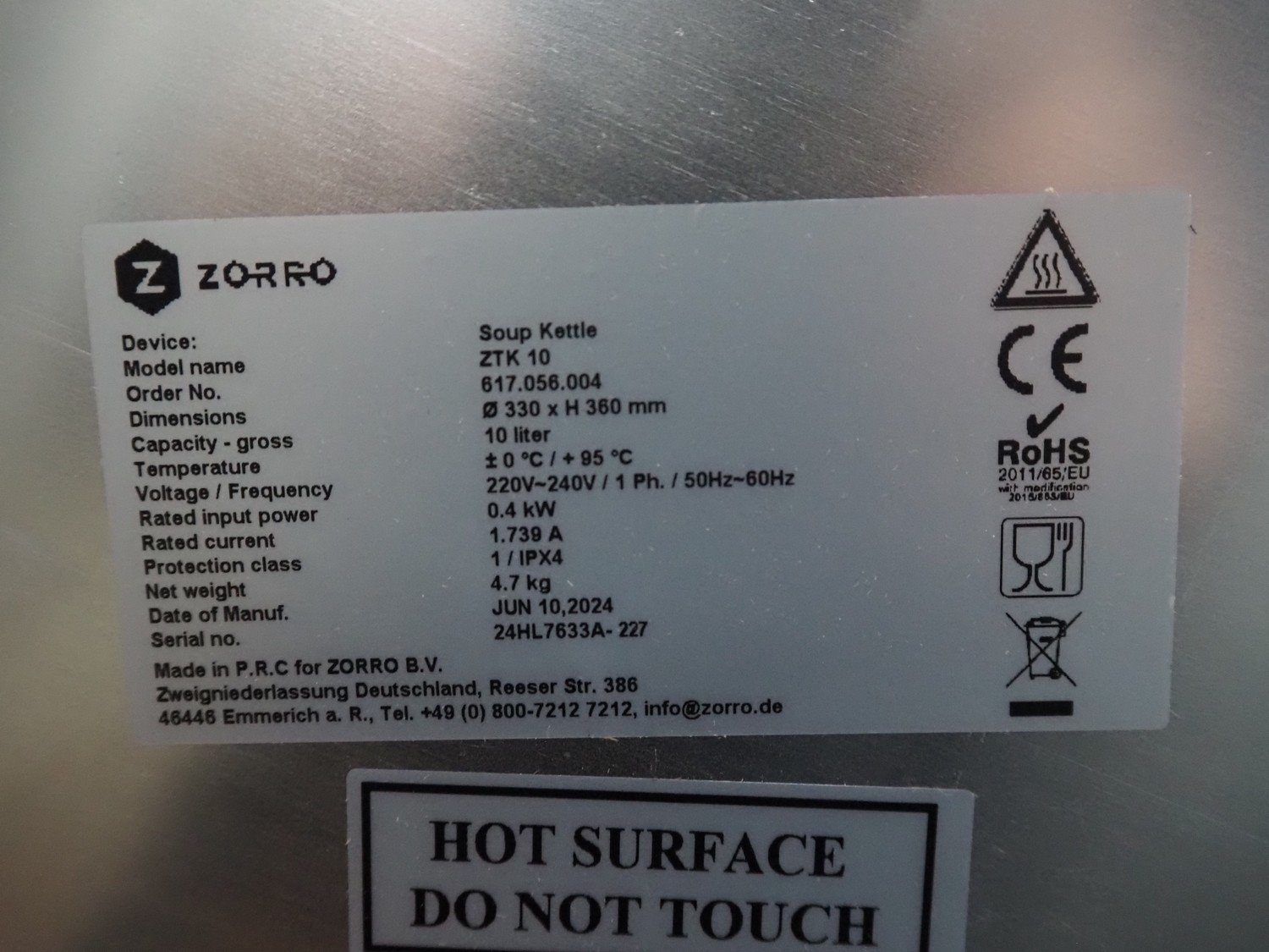 Zorro B.V. soup kettle, model: ZTK 10, serial number: 24HL7633A-227, year of construction: June 10.2024, 220-240 V, 1 Ph, 50/60 Hz, 1.739 A, 0.4 kW, capacity: 10 liter, dimensions: 300 mm x 300 mm x 350 mm.