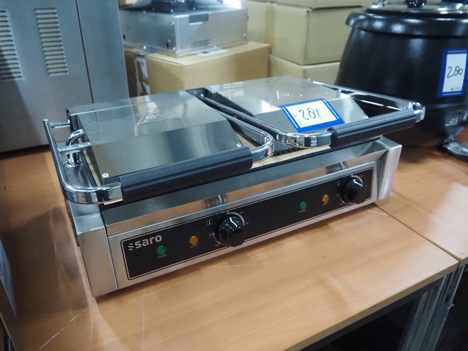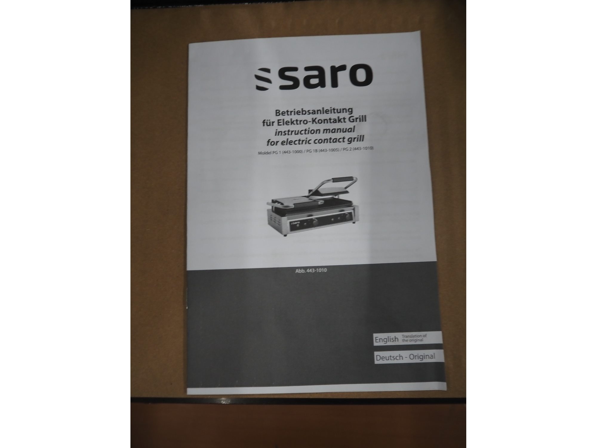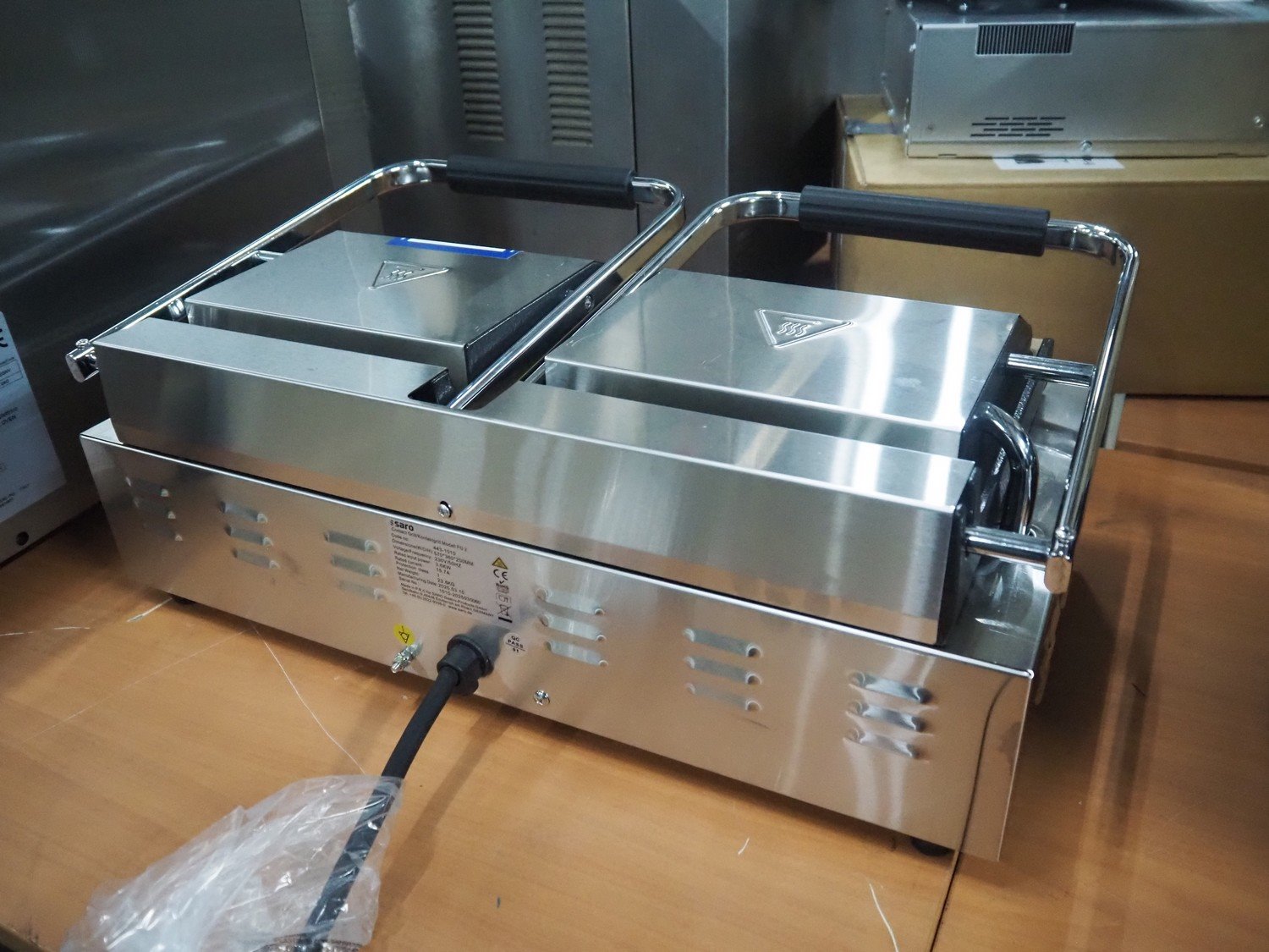 Saro Gastro-Products GmbH contact grill, model: PG 2, serial number: 1010-2025030060, year of construction: 2025.03.10, 230 V, 50 Hz, 15.7 A, 3.6 kW, weight: 23.6 kg, dimensions: 600 mm x 380 mm x 230 mm.