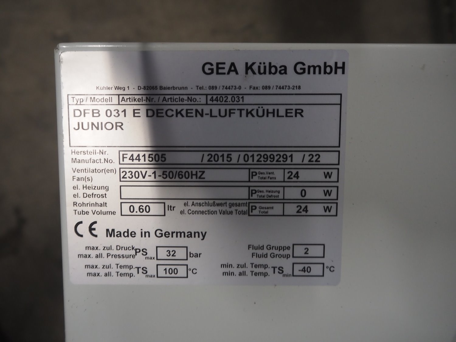 Gea Küba GmbH evaporator, model: DFB 031 E DECKEN-LUFTKÜHLER JUNIOR, number: F441505, year of construction: 2015, 230 V, 50/60 Hz, 24 W, dimensions: 530 mm x 510 mm x 230 mm.