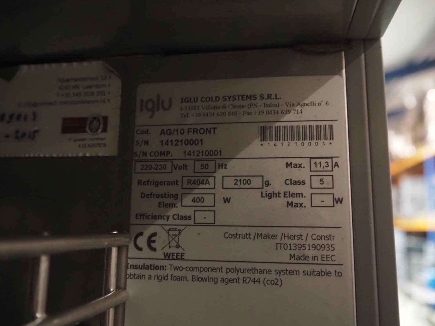 Iglu Cold Systems S.R.L. shock freezer, model: AG10/Front, serial number: 141210001, 220-230 V, 50 Hz, 11.3 A, 400 W, refrigerant: R404A/2.1 kg, 10 floors, floor dimensions: (10x) 520 mm x 410 mm, total dimensions: 820 mm x 910 mm x 1900 mm. Defect.