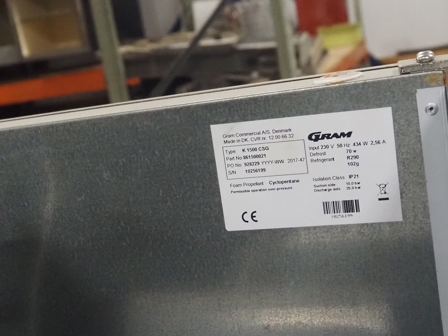 Gram drive-in refrigerator, type: K 1500 CSG, serial number: 10256199, 230 V, 50 Hz, 2.56 A, 434 W, refrigerant: R290 / 120 gram, inside dimensions: 850 mm x 720 mm x 1900 mm, total dimensions: 1030 mm x 920 mm x 2330 mm.