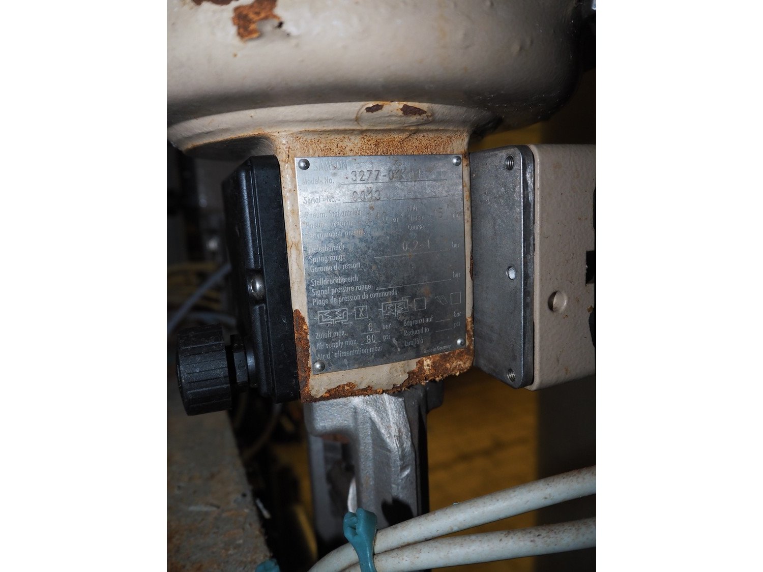 2 Samson valves with pneumatic diaphragm actuators and electropneumatic positioners, type valves: 3277, type positioner: 3730-2, dimensions valves: DN15, dimensions actuators: (2x) 300 mm x 200 mm x 450 mm.