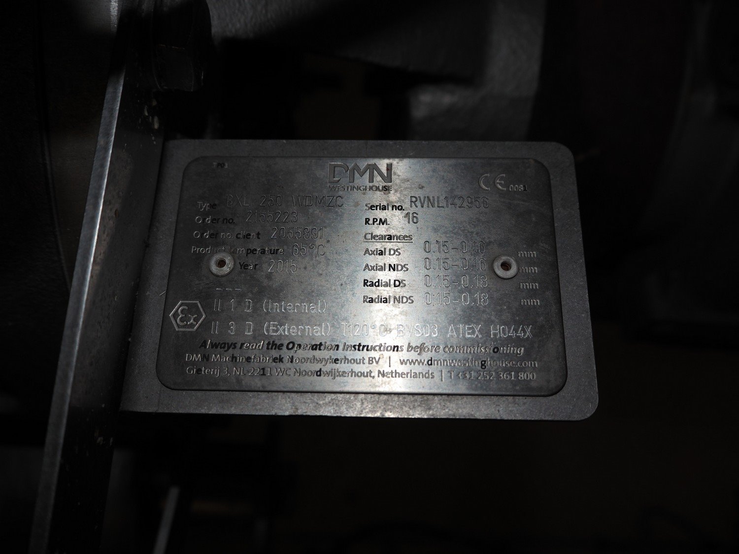 DMN Westinghouse dairy blow through rotary valve, type: BXL 250 WDMZC, serial number: RVNL142956, year of construction: 2015, Axial DS: 0.15-0.16 mm, Axial NDS: 0.15-0.16 mm, Radial DS: 0.15-0.18 mm, Radial NDS: 0.15-0.18 mm, product temperature: 65 °C, 16 rpm, dimensions: 1800 mm x 600 mm x 550 mm. rotor is damaged.