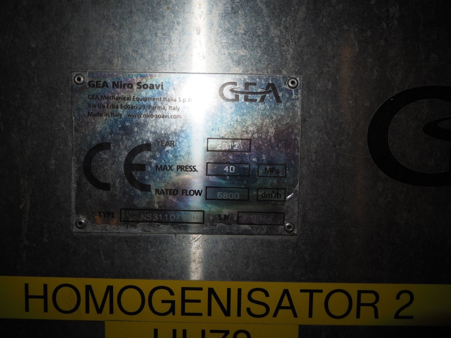 Gea Niro Soavi homogenizer, type: NS3110/90H, serial number: 9344, year of construction: 2012, maximum pressure: 40 MPa, rated flow: 5800 dm³/h, dimensions: 2600 mm x 1600 mm x 1550 mm.