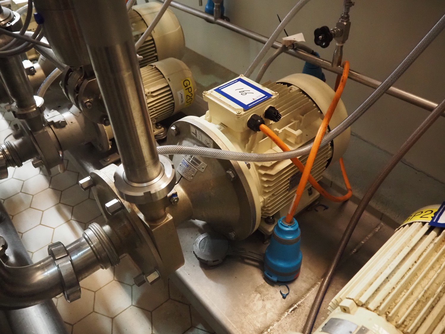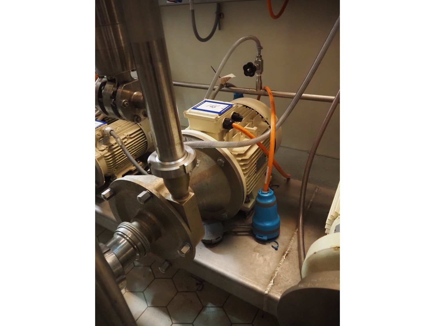 Fristam centrifugal pump, type: FP 742/195 VB, serial number: 0444730120, year of construction: 2021, Q: 15.5 m³/h, H: 40 m, P: 5.5 kW, n: 2900 l/min, dimensions: 700 mm x 400 mm x 450 mm.