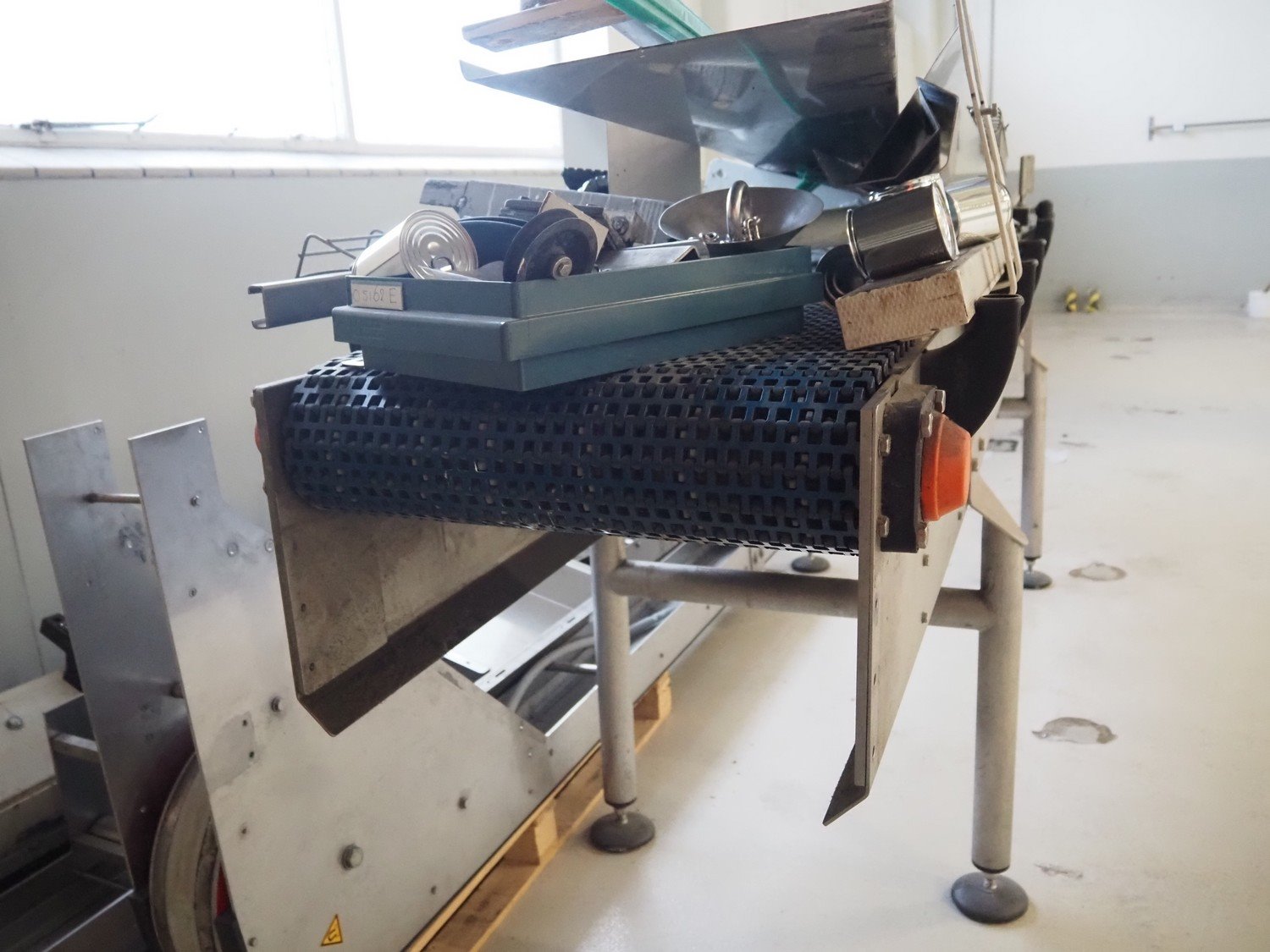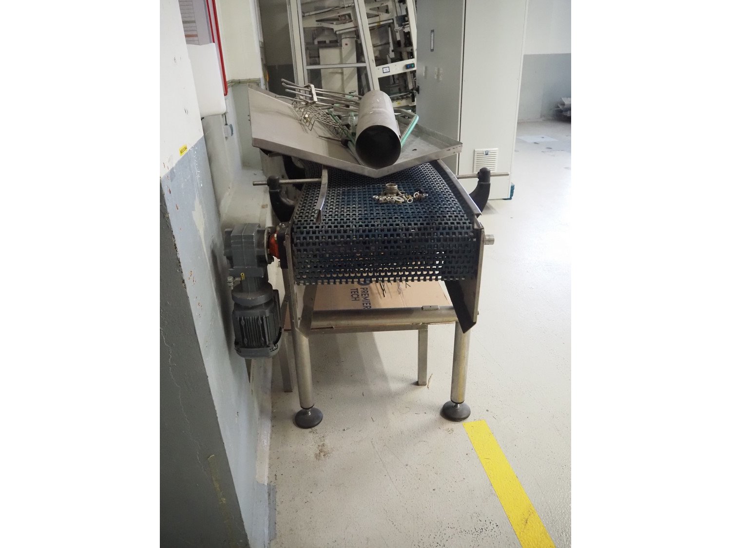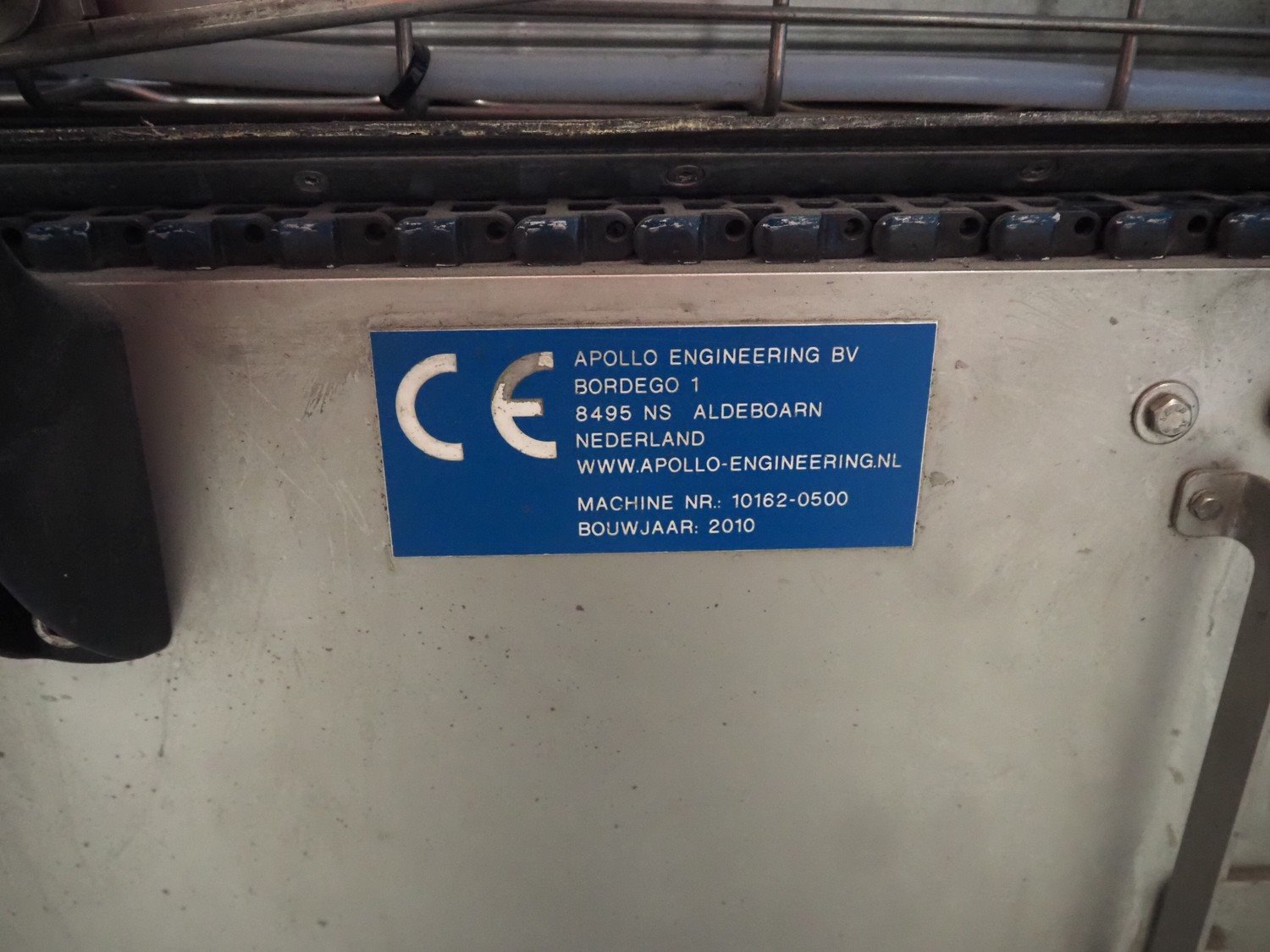 Apollo Engineering BV transport belt and 45° curve conveyor, machine number: 10162-0500, year of construction: 2010, plastic mesh belt, belt width: 510 mm, total dimensions: 3050 mm x 850 mm x 1300 mm and 2350 mm x 800 mm x 850 mm.