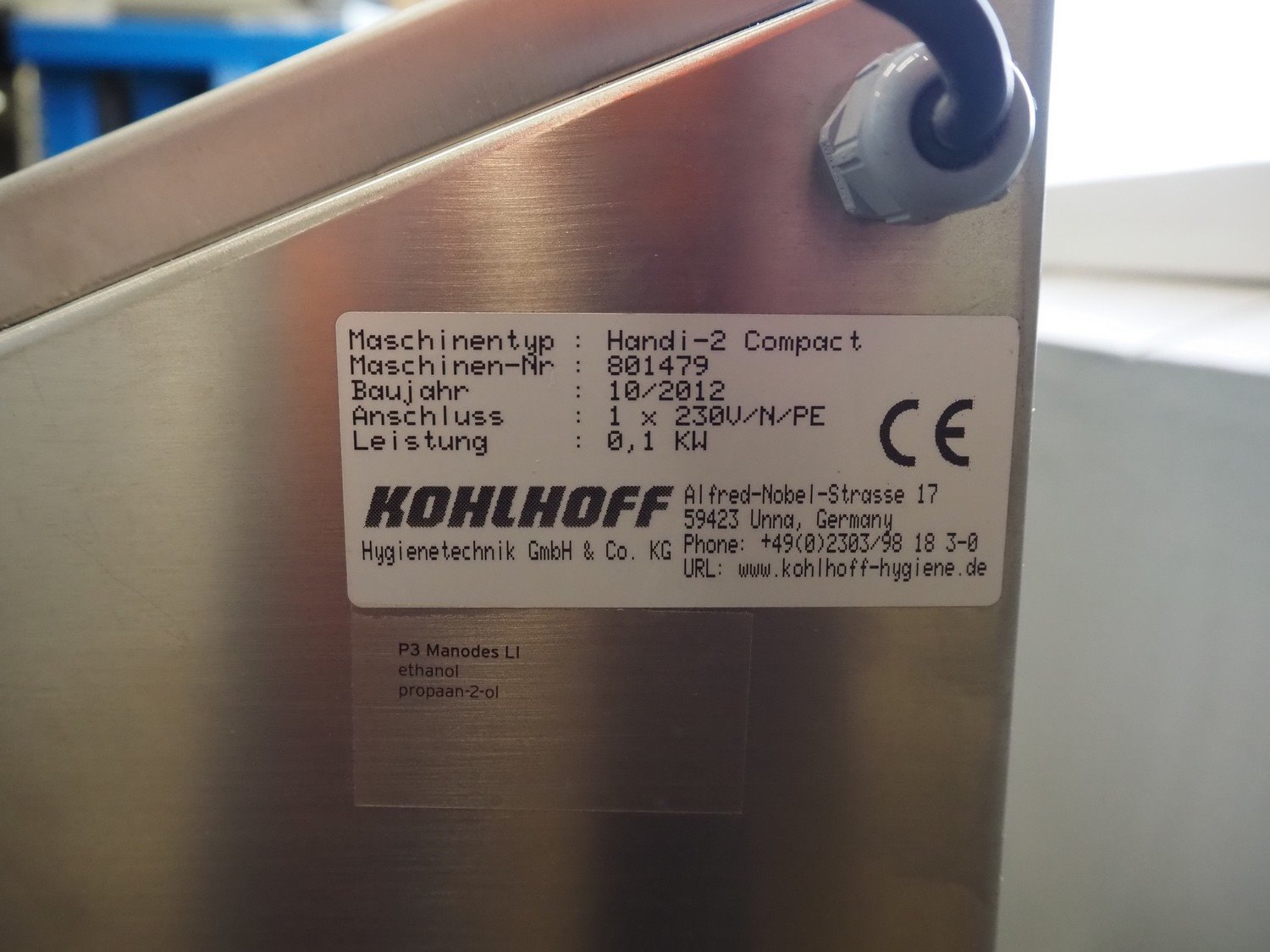 Kohlhoff Hygienetechnik GmbH & Co. KG hand disinfection station, machine type: Handi-2 Compact, machine number: 801479, year of construction: 10/2012, 1x230 V, 0.1 kW, dimensions: 400 mm x 300 mm x 920 mm.