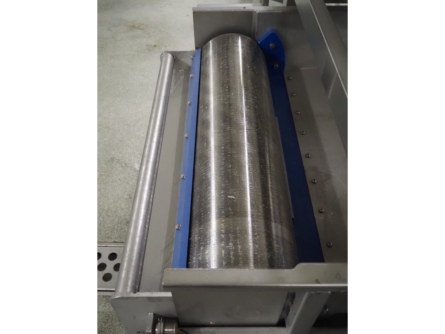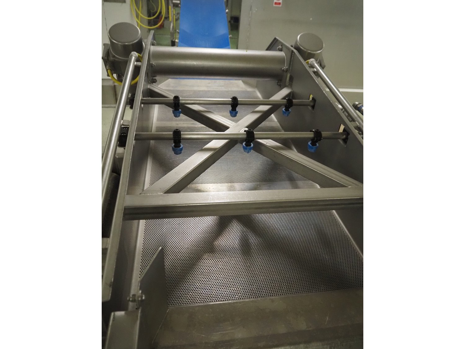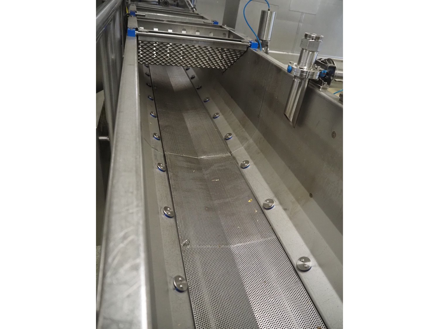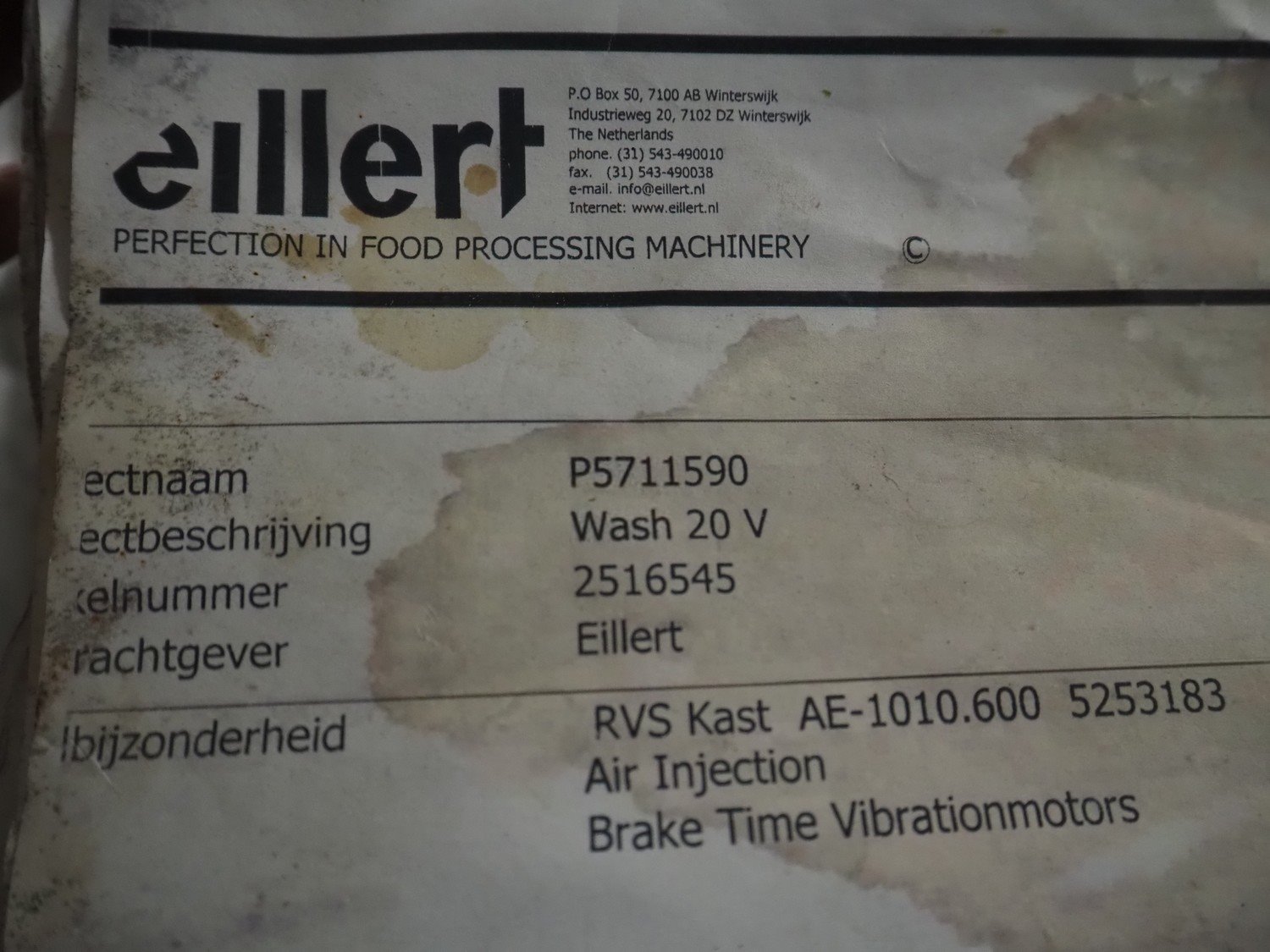 Eillert vegetable washer with outfeed vibrating gutter, model: WASH-20, year of construction: 2015, gutter width: 600 mm, sieve width: 900 mm, sieve: 0.5 mm, 2 Packo Inox centrifugal pumps, total dimensions: 4900 mm x 1500 mm x 1850 mm.