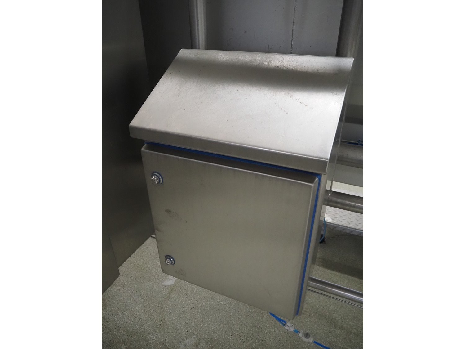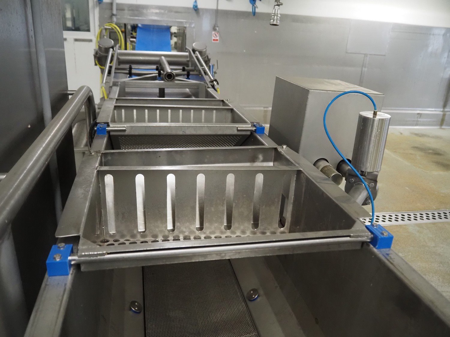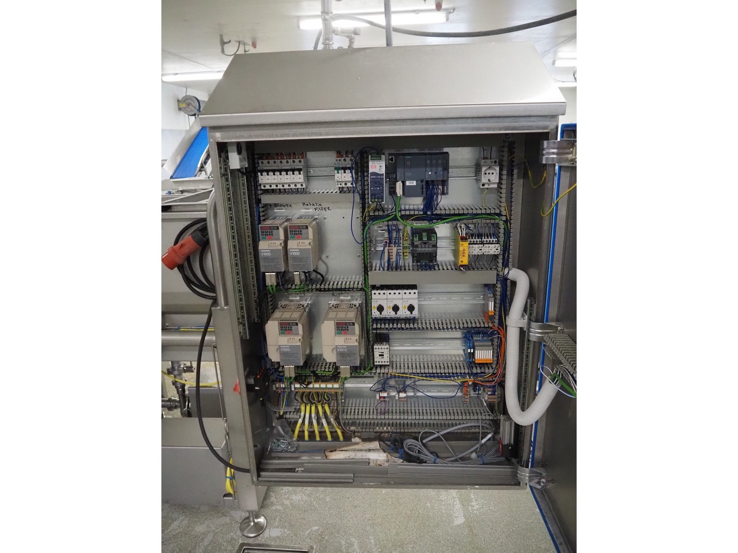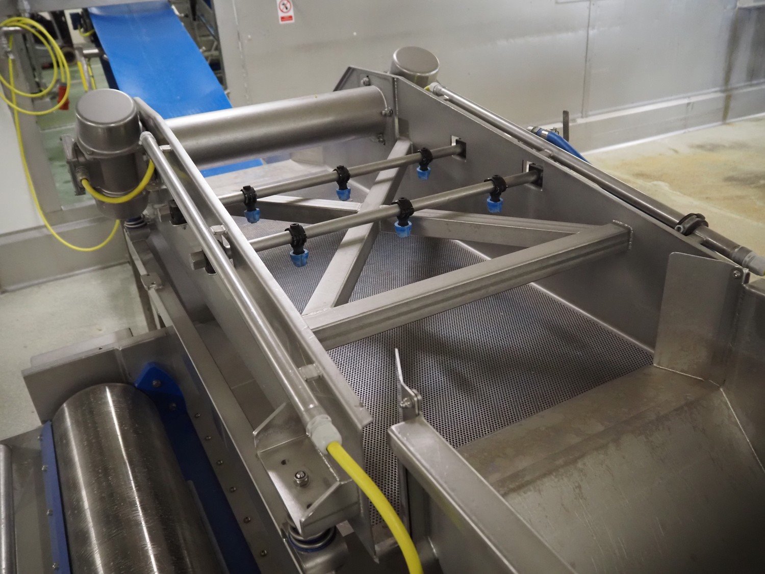 Eillert vegetable washer with outfeed vibrating gutter, model: WASH-20, year of construction: 2015, gutter width: 600 mm, sieve width: 900 mm, sieve: 0.5 mm, 2 Packo Inox centrifugal pumps, total dimensions: 4900 mm x 1500 mm x 1850 mm.