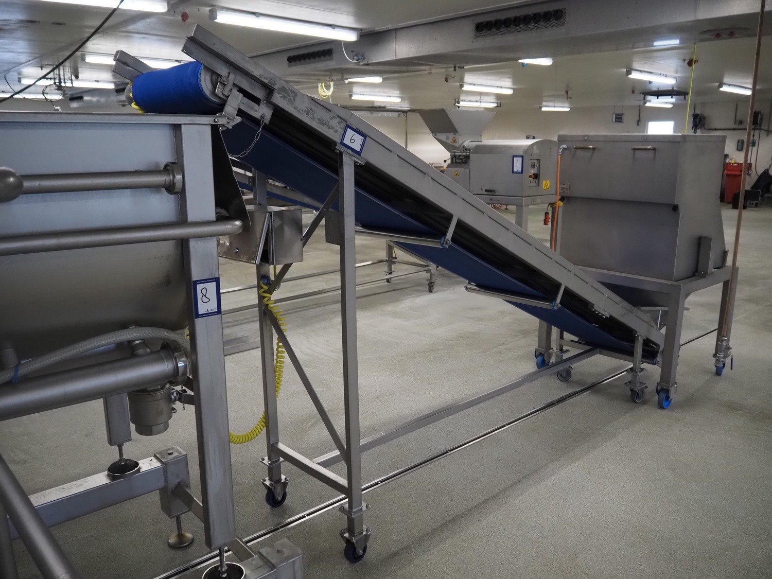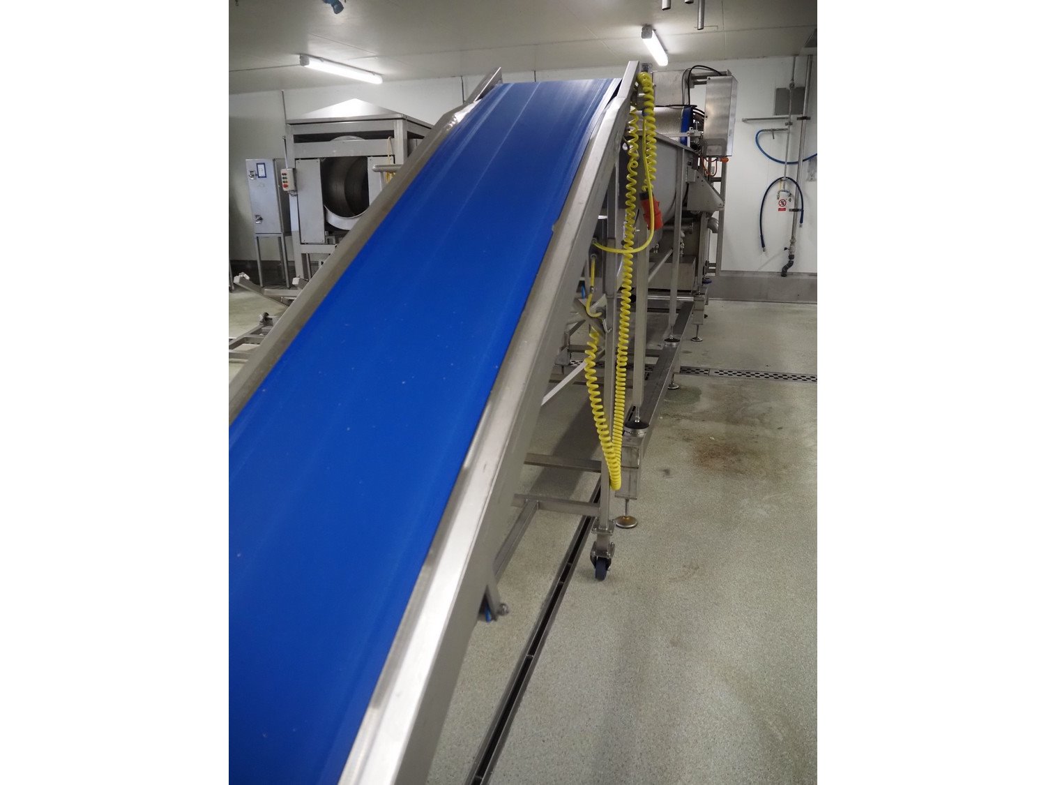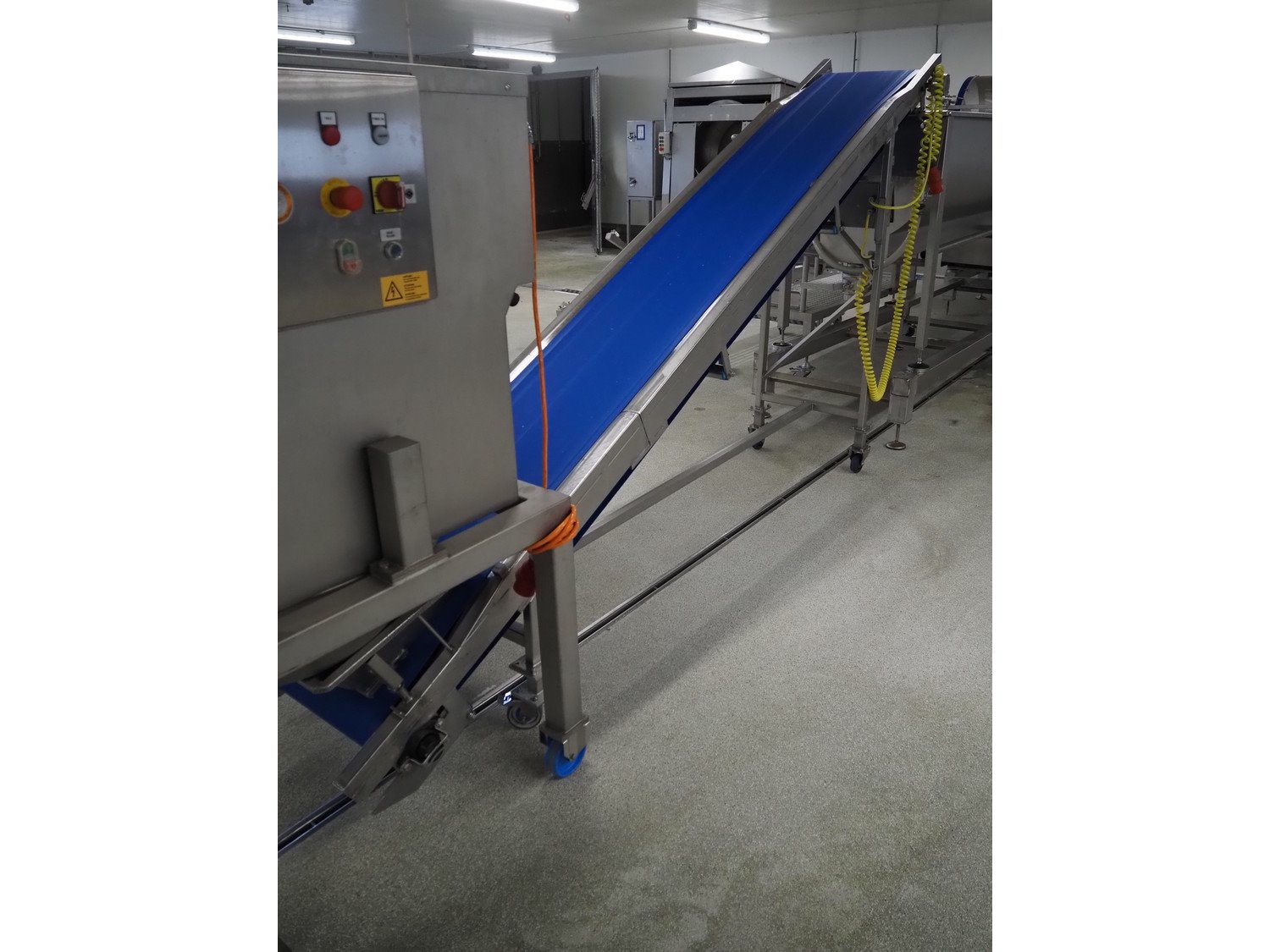 Mobile elevating belt, s/s frame, plastic belt, belt width: 500 mm, elevating height: 1850 mm, total dimensions: 3500 mm x 600 mm x 1950 mm.