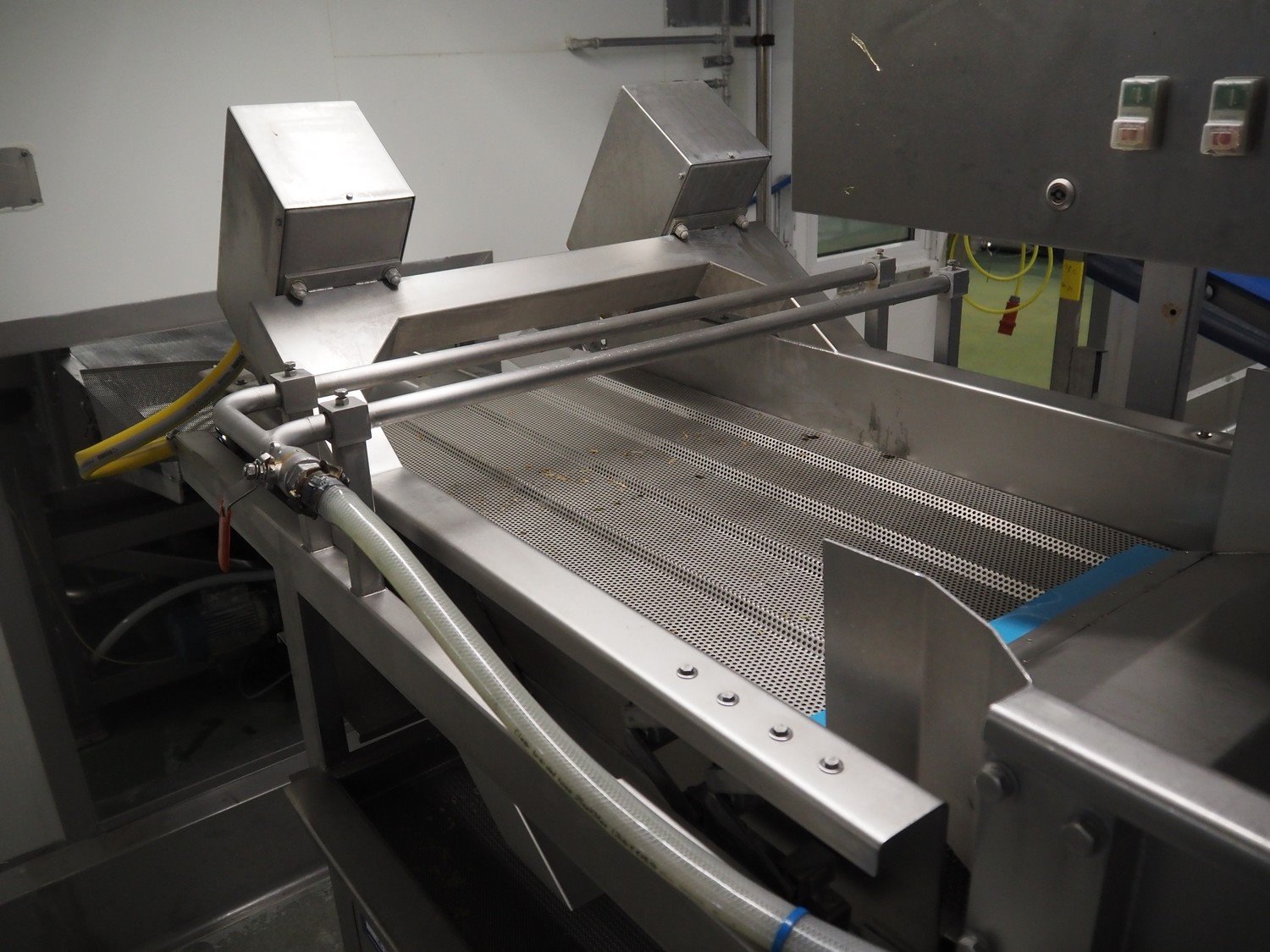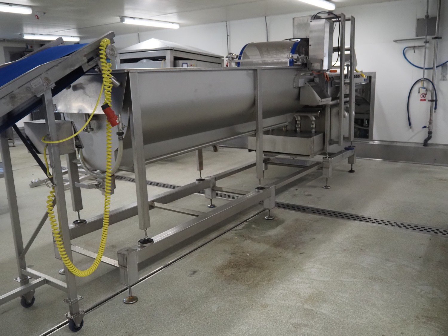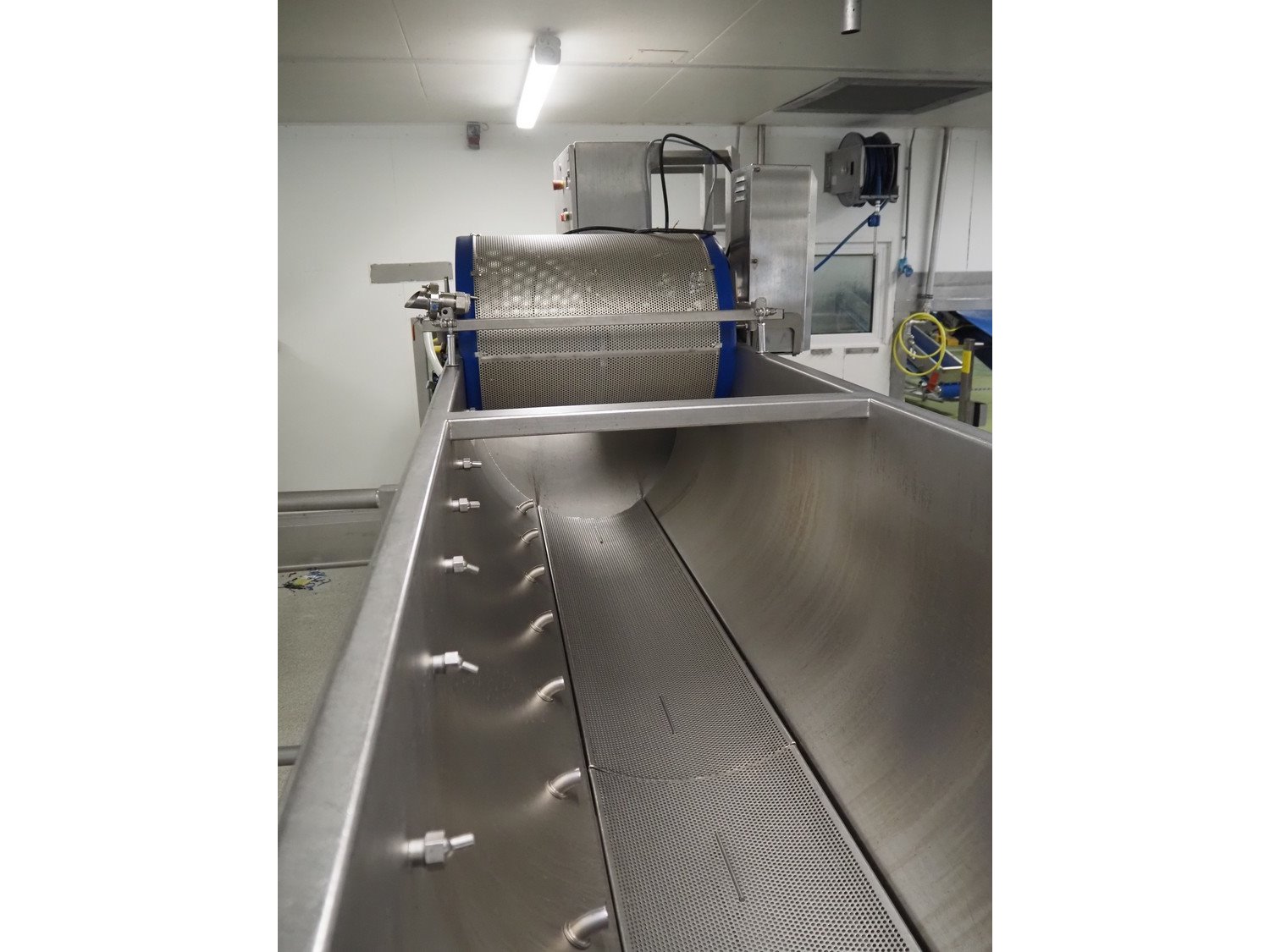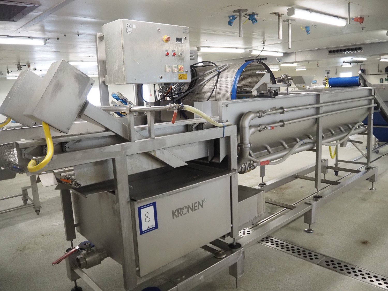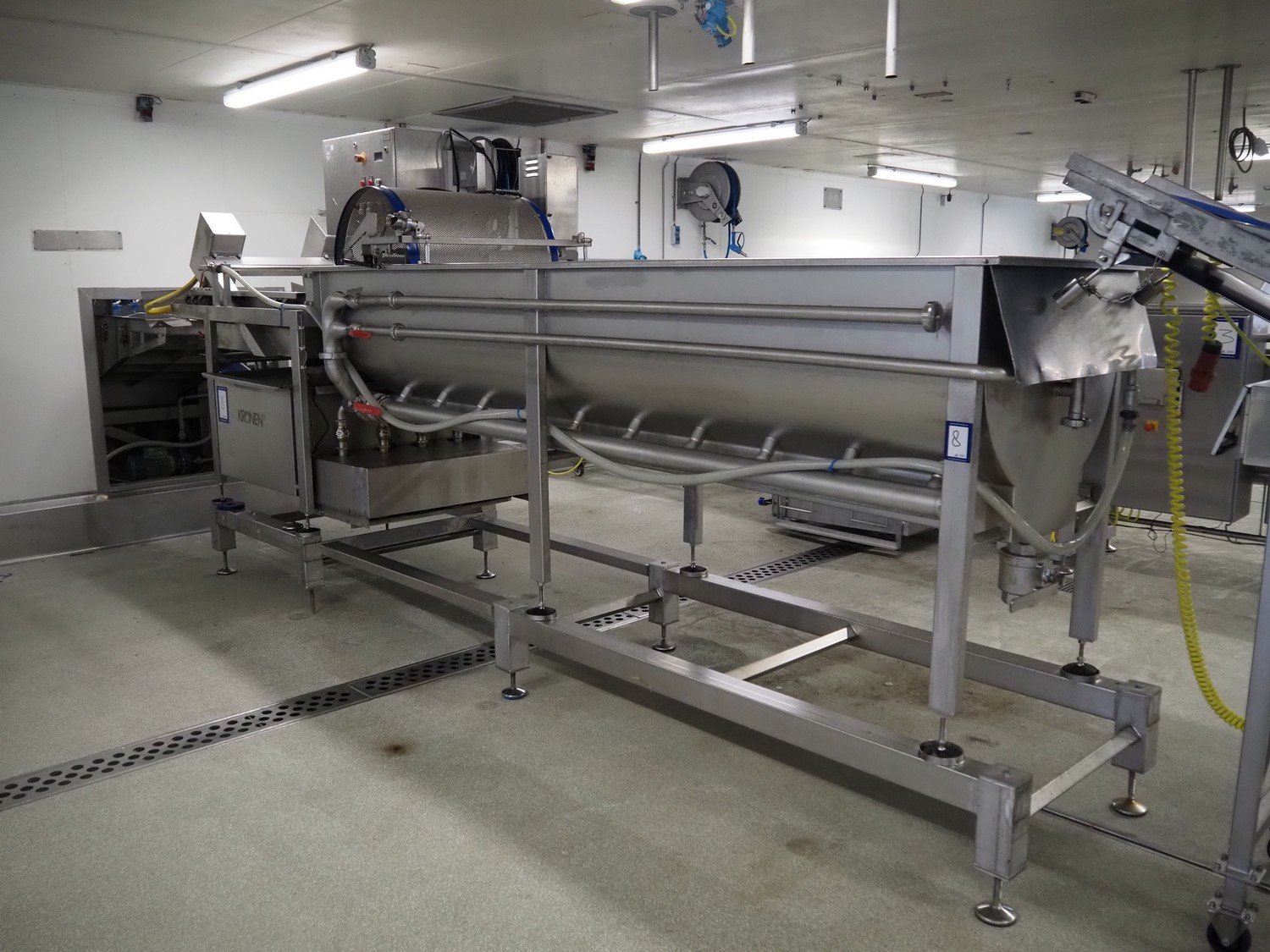 Kronen vegetable washer with outfeed vibrating gutter, type: GEWA 5000 D, serial number: 179, year of construction: 2001, 400 V, 3 Ph, 50 Hz, 11 kW, gutter width: 800 mm, total dimensions: 5200 mm x 1400 mm x 2400 mm.