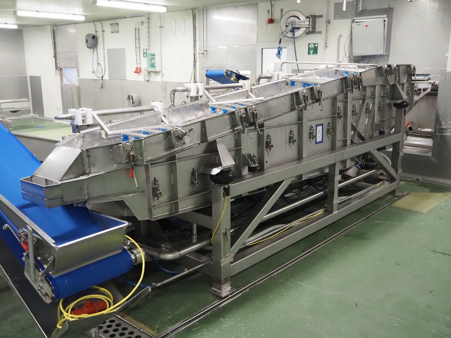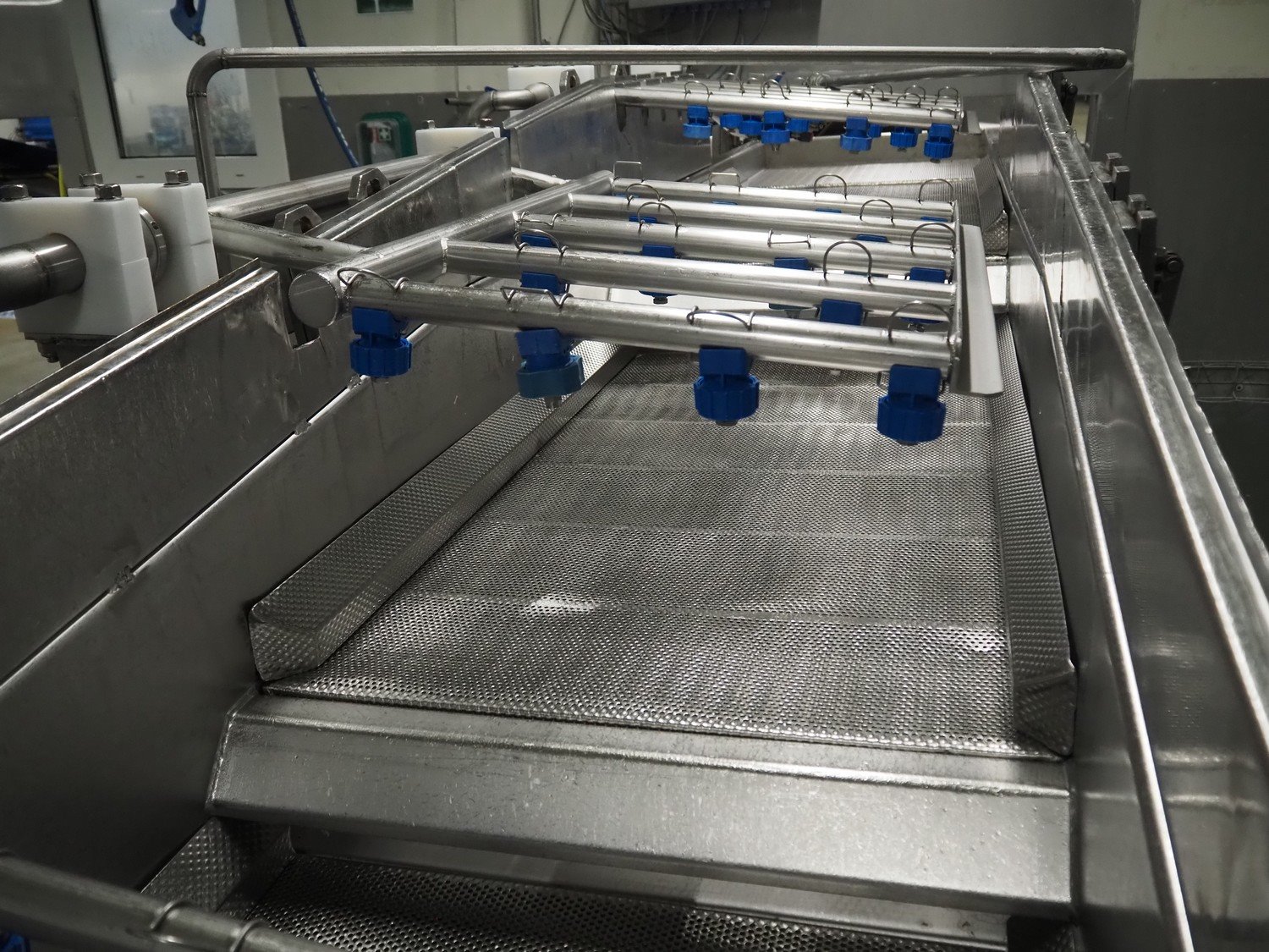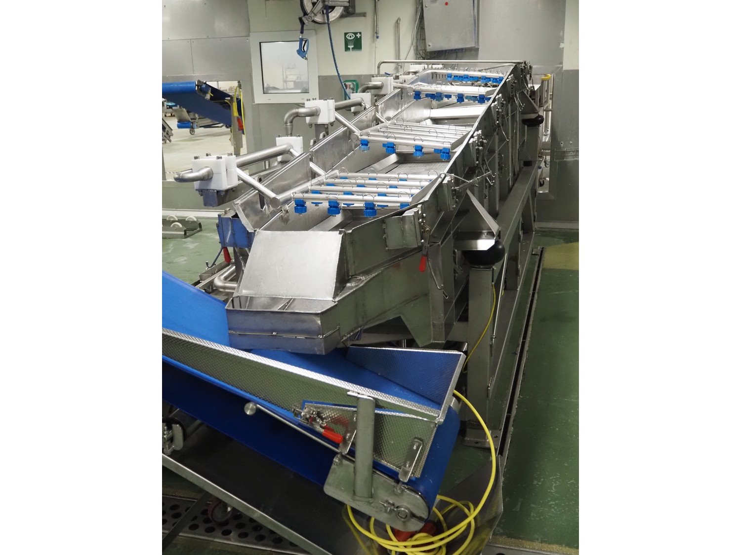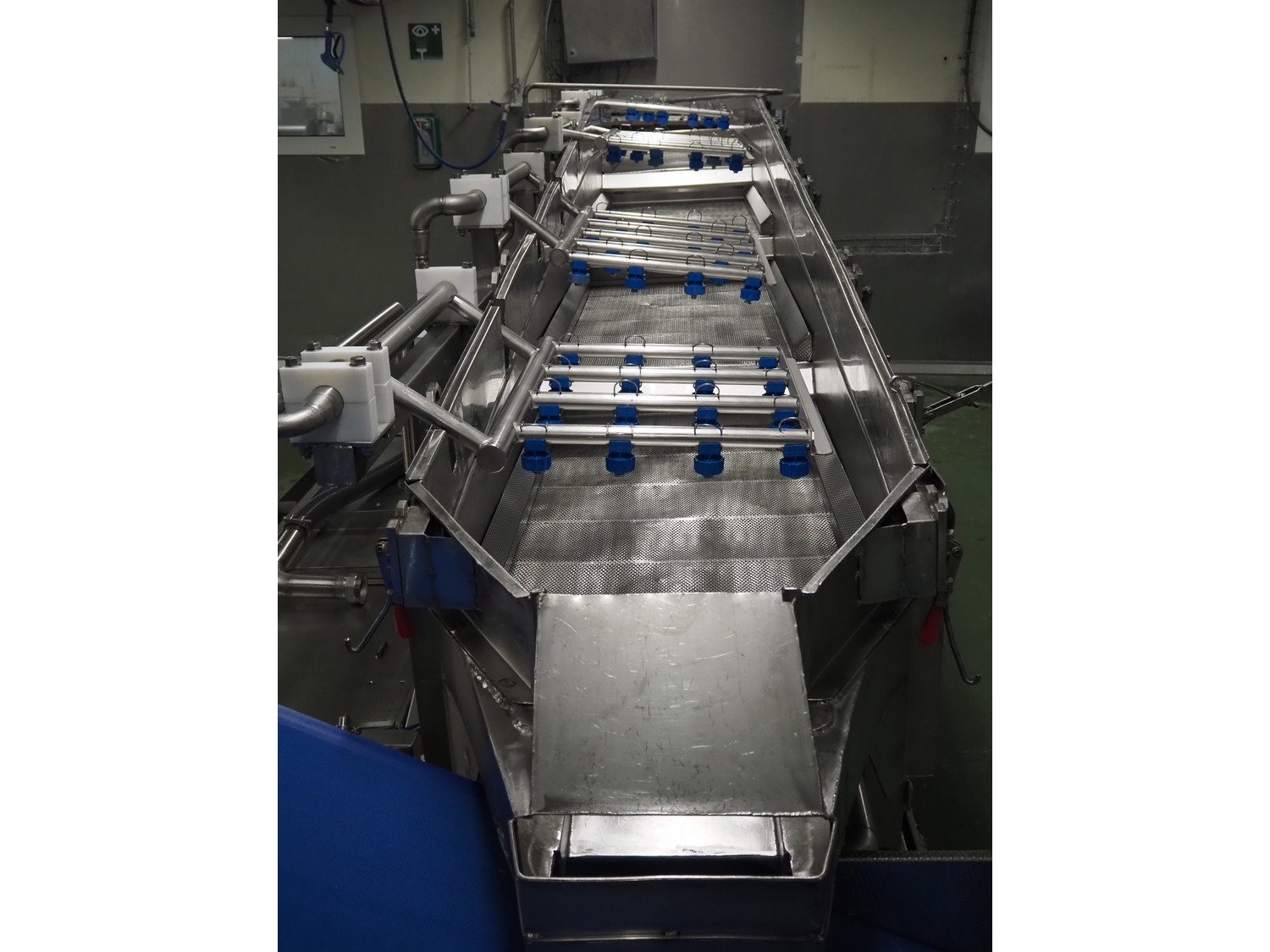 Superior vibrating washing gutter with sieves and spraying heads, type: W.O.W.V. 5200 - 7.5, year of construction: 1991, sieve width: 700 mm, infeed height: 1400 mm, outfeed height: 900 mm, total dimensions: 6300 mm x 1800 mm x 1700 mm, s/s trolley with covers for vibrating gutter, dimensions trolley: 1000 mm x 500 mm x 1000 mm, 2 switch cabinets, dimensions: 600 mm x 600 mm x 220 mm and box with additional spraying nozzles.