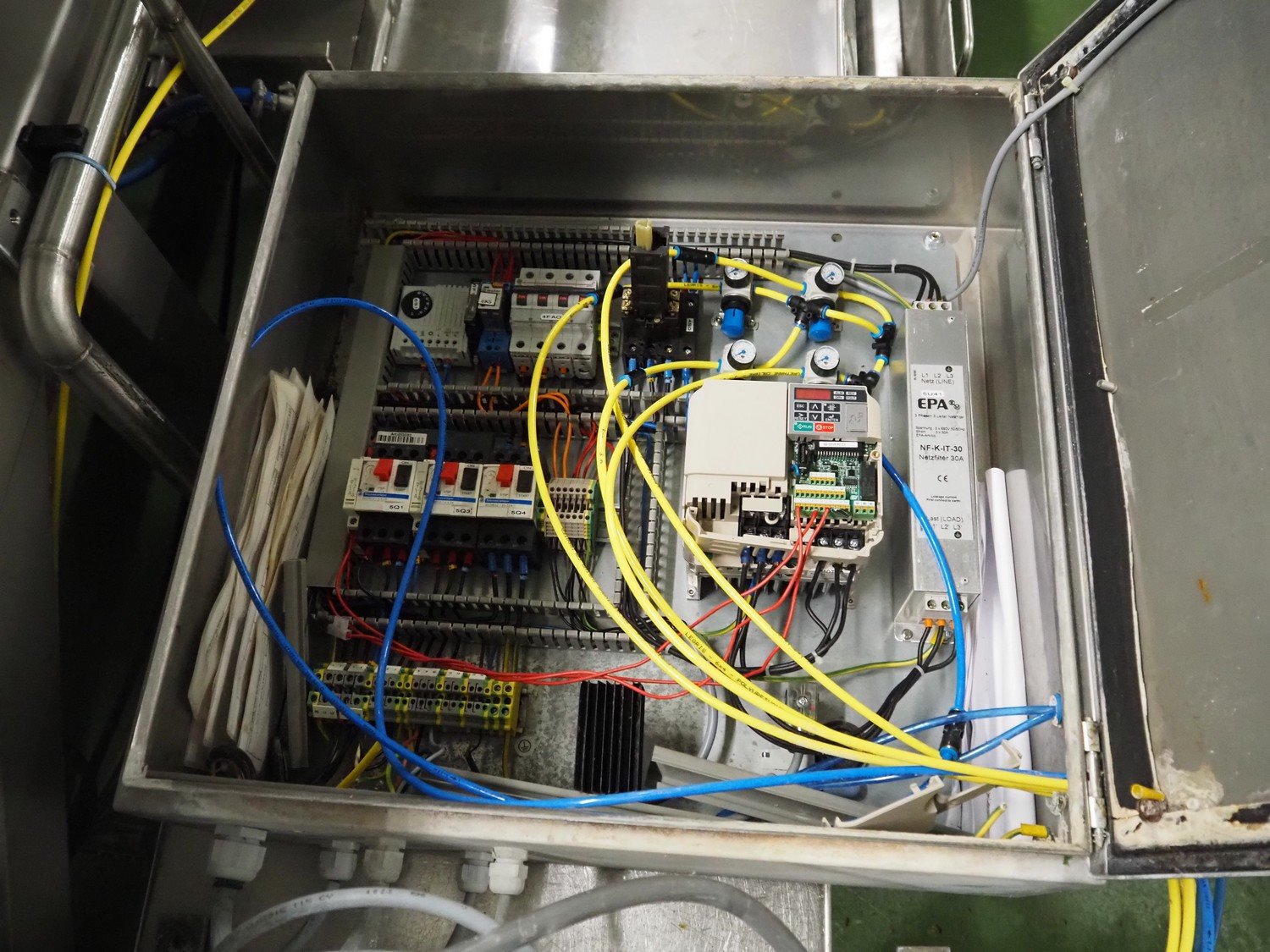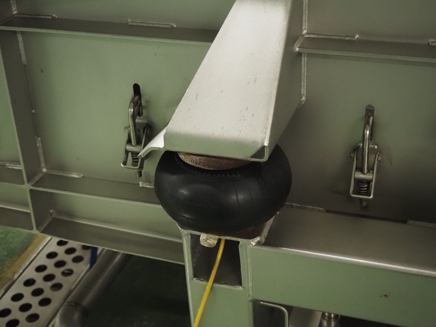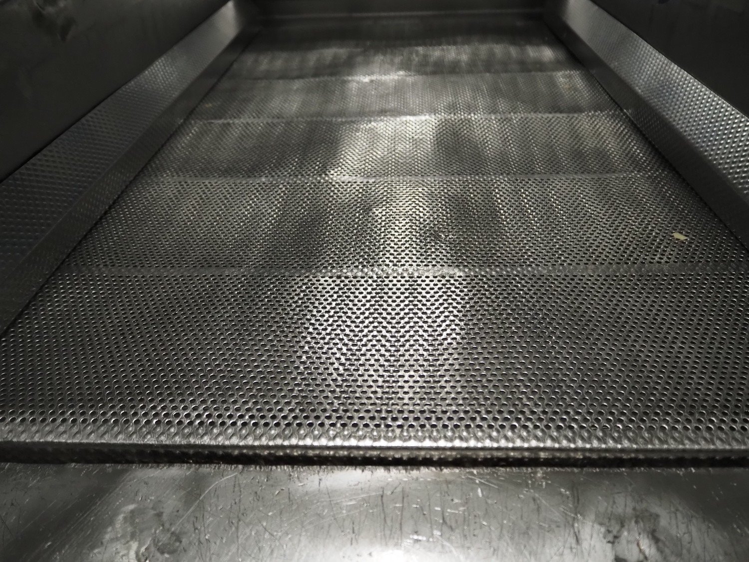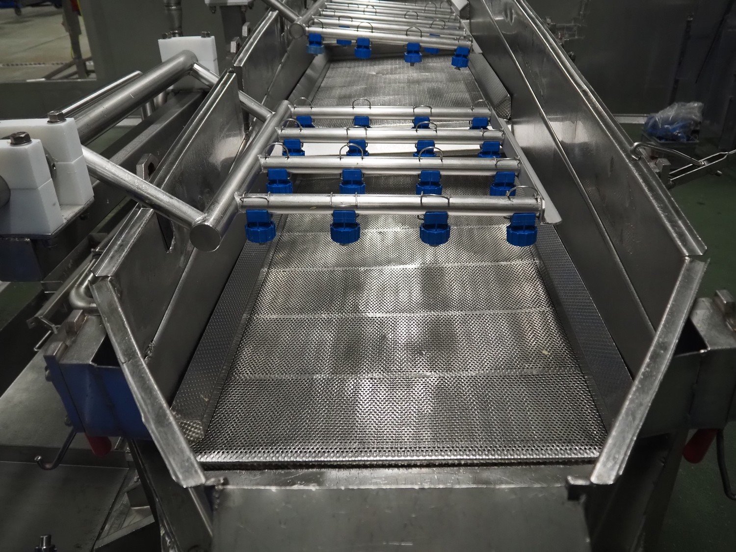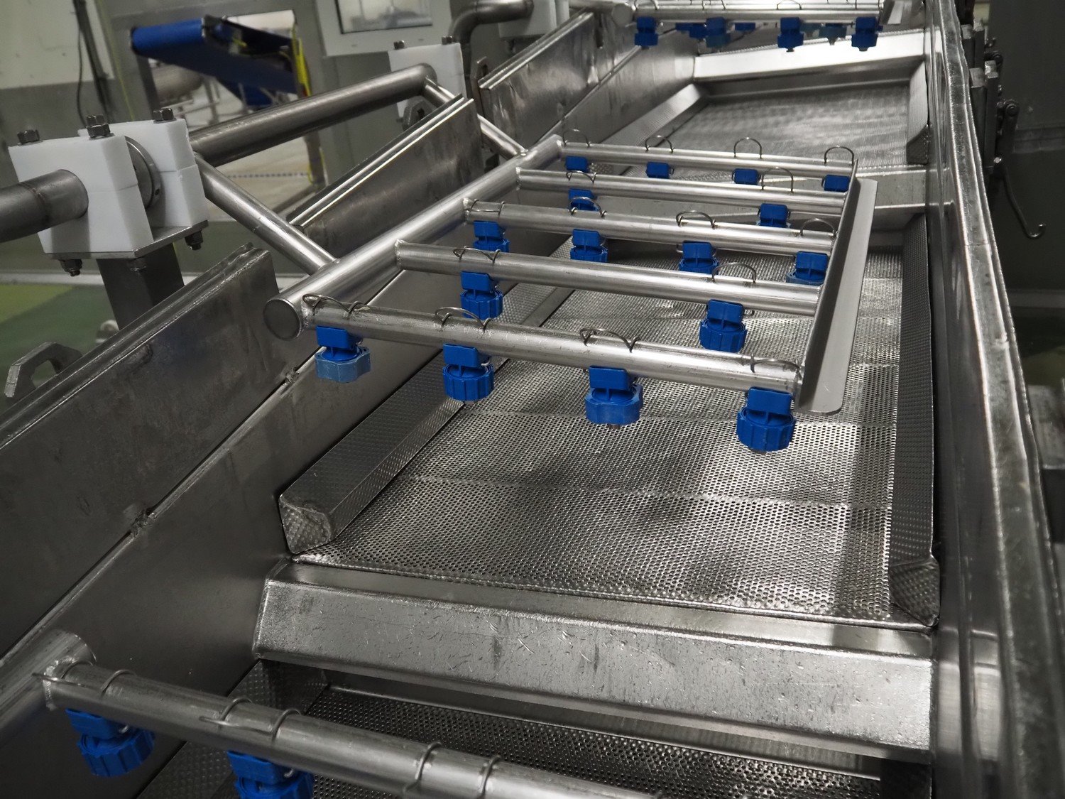 Superior vibrating washing gutter with sieves and spraying heads, type: W.O.W.V. 5200 - 7.5, year of construction: 1991, sieve width: 700 mm, infeed height: 1400 mm, outfeed height: 900 mm, total dimensions: 6300 mm x 1800 mm x 1700 mm, s/s trolley with covers for vibrating gutter, dimensions trolley: 1000 mm x 500 mm x 1000 mm, 2 switch cabinets, dimensions: 600 mm x 600 mm x 220 mm and box with additional spraying nozzles.
