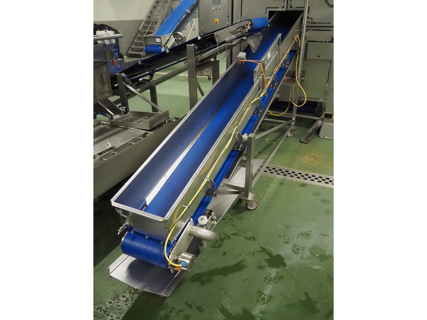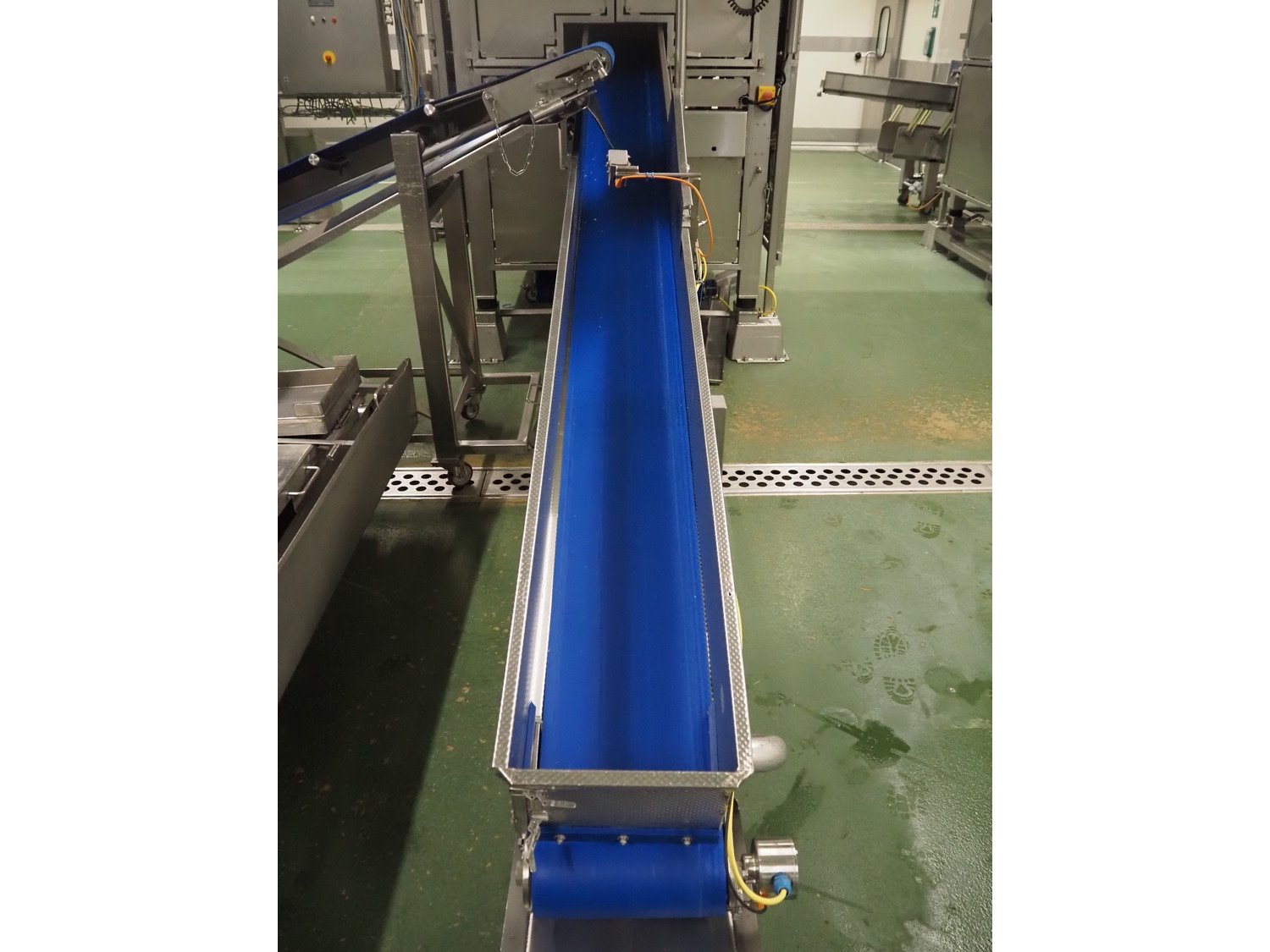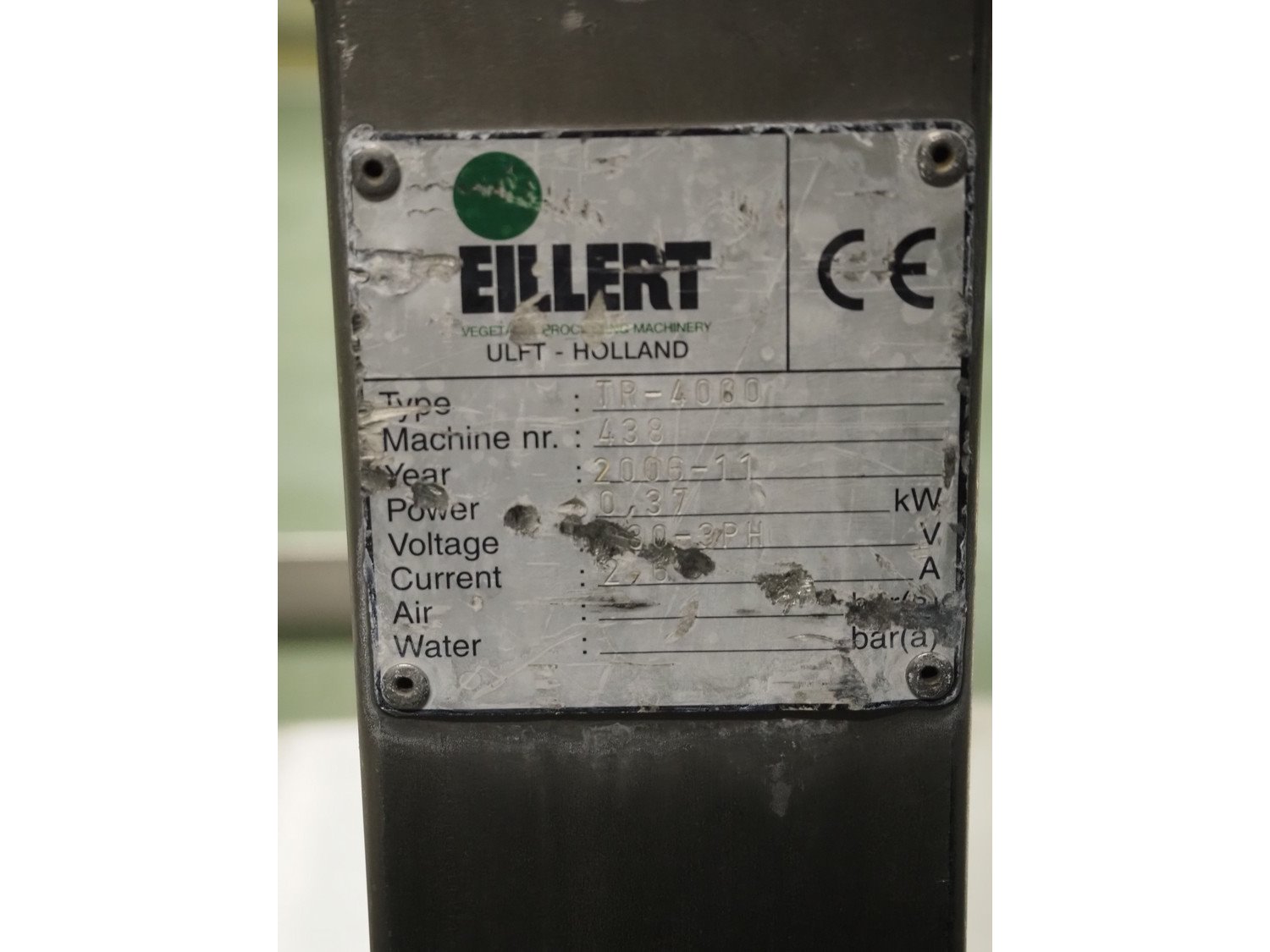 Eillert retractable elevating buffer belt, type: TR-4000, machine number: 438, year of construction: 2006, 230 V, 3 Ph, 2.6 A, 0.37 kW, s/s frame, plastic belt, belt width: 300 mm, elevating height: 1600 mm, total dimensions: 4000 mm x 600 mm x 1900 mm.