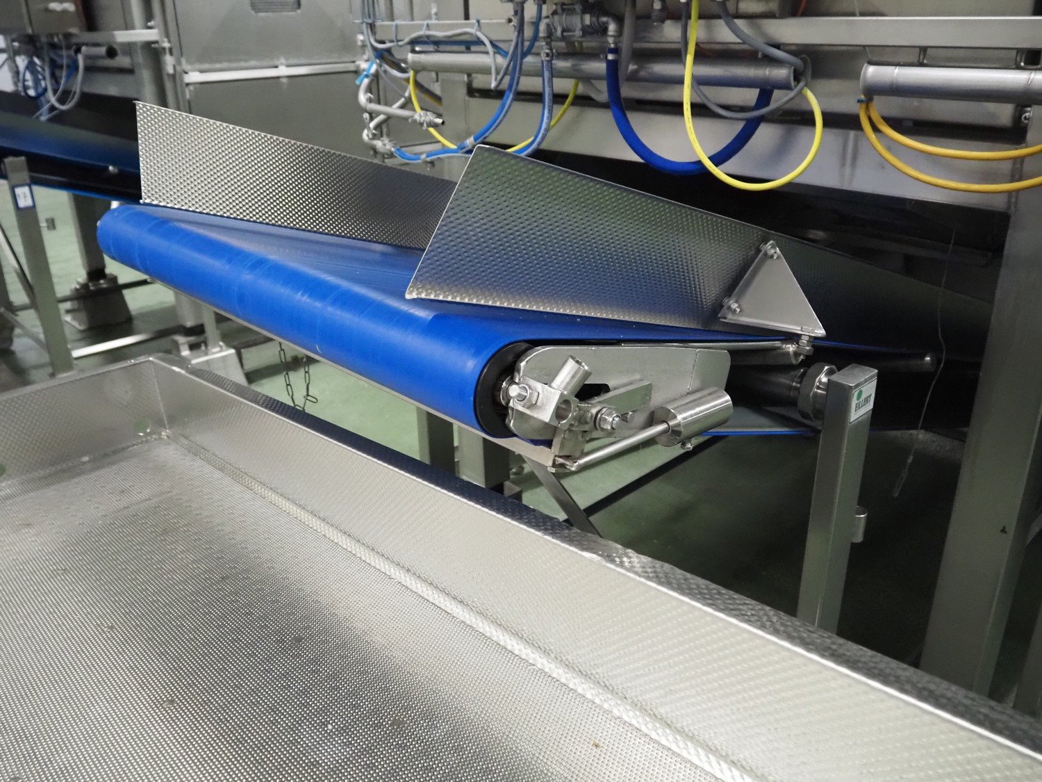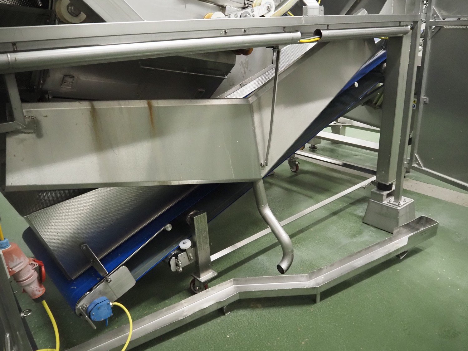 Eillert mobile elevating belt, type: TR-3200, machine number: 441, year of construction: 2006, 230 V, 3 Ph, 2.6 A, 0.37 kW, s/s frame, plastic belt, belt width: 900 mm, elevating height: 1300 mm, total dimensions: 3300 mm x 1000 mm x 1450 mm.