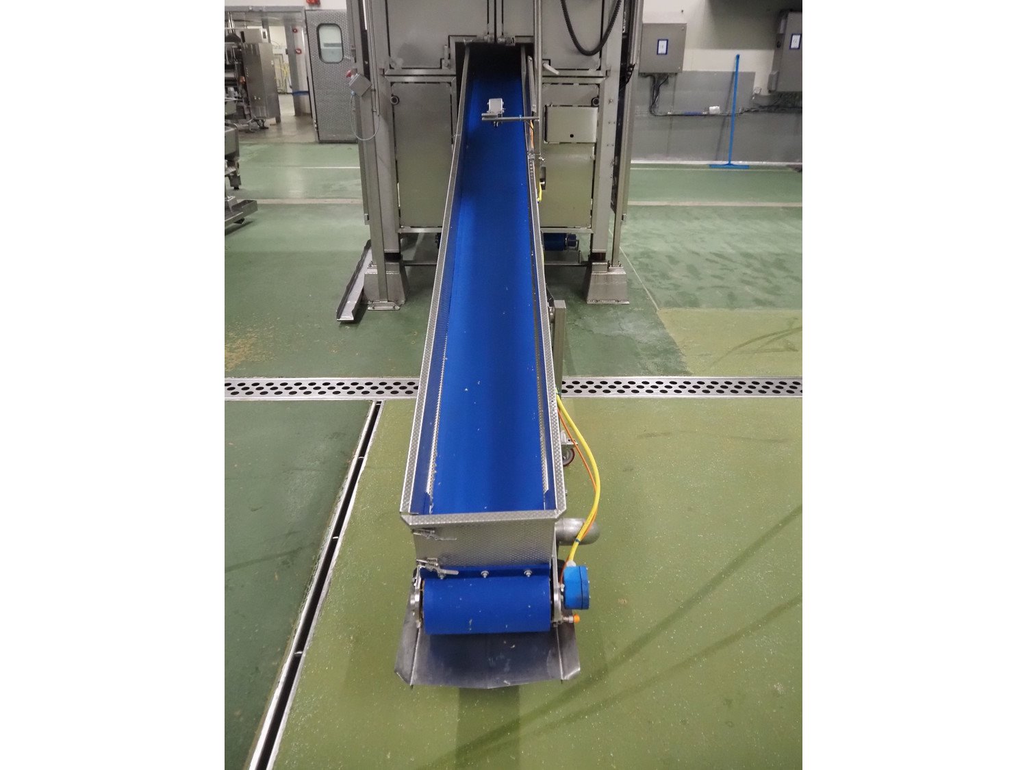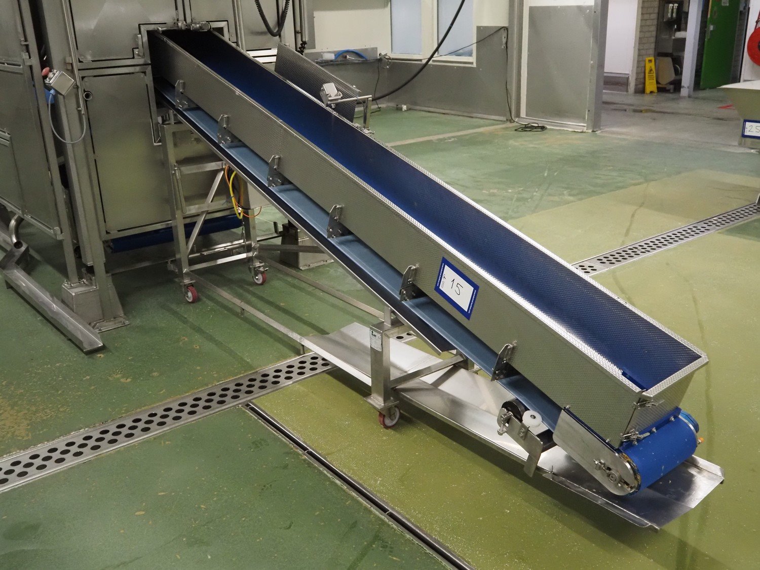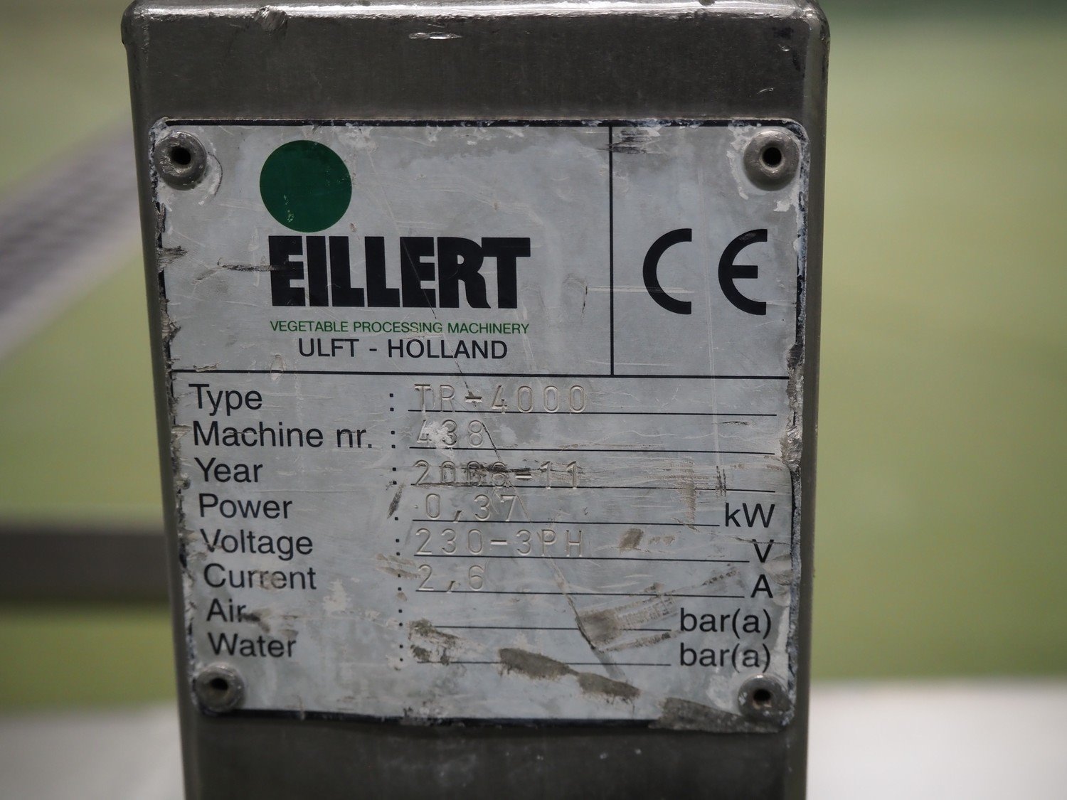 Eillert retractable elevating buffer belt, type: TR-4000, machine number: 438, year of construction: 2006, 230 V, 3 Ph, 2.6 A, 0.37 kW, s/s frame, plastic belt, belt width: 300 mm, elevating height: 1600 mm, total dimensions: 4000 mm x 600 mm x 1900 mm.