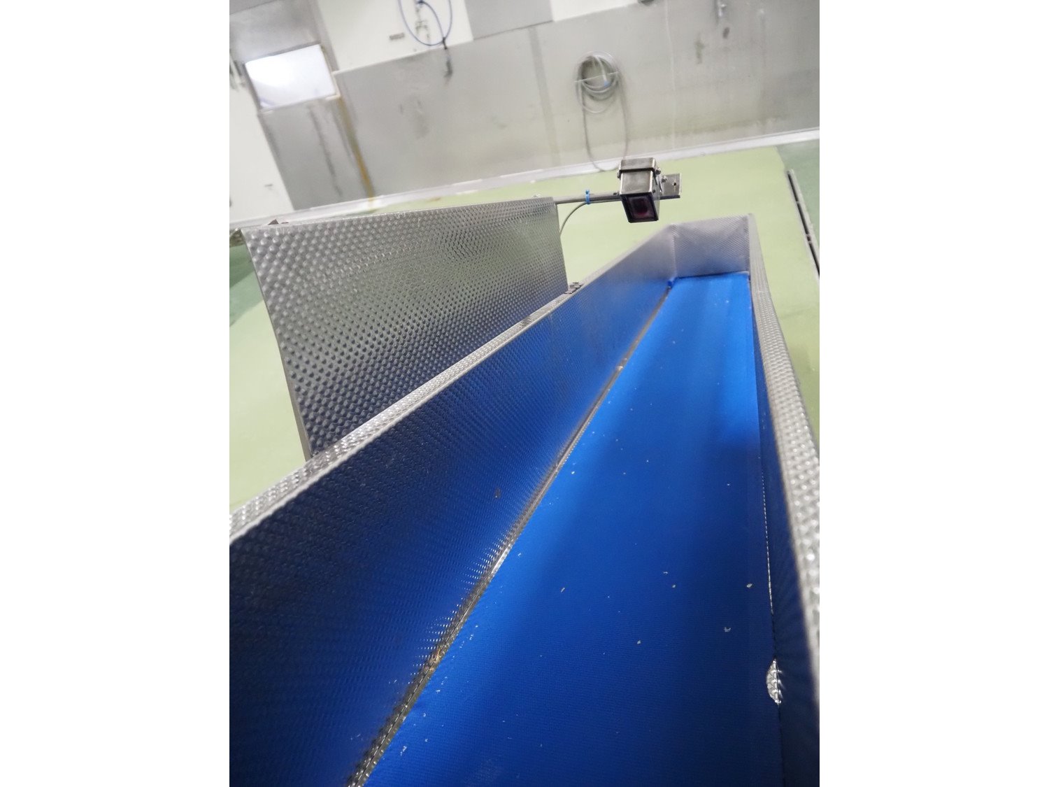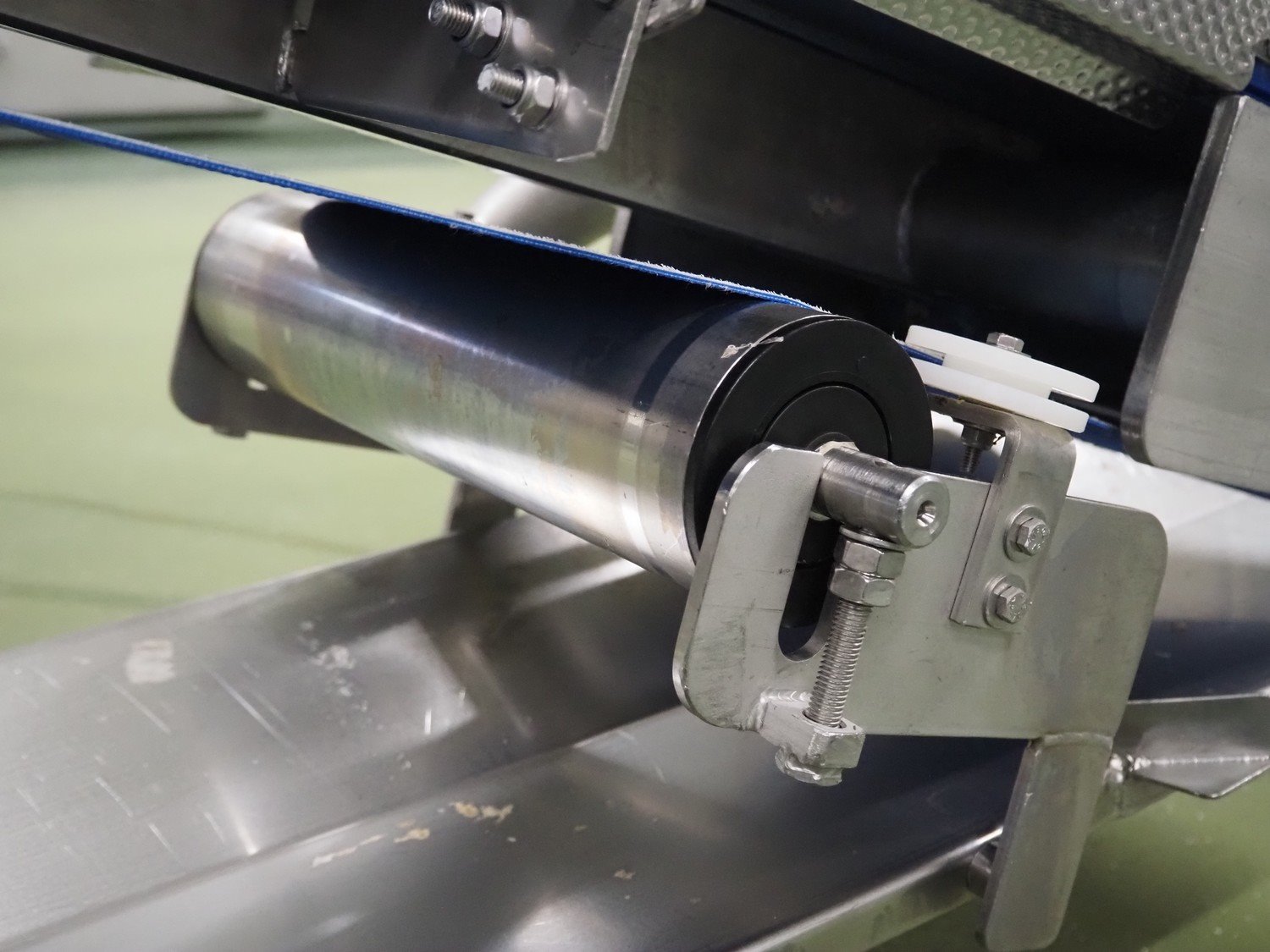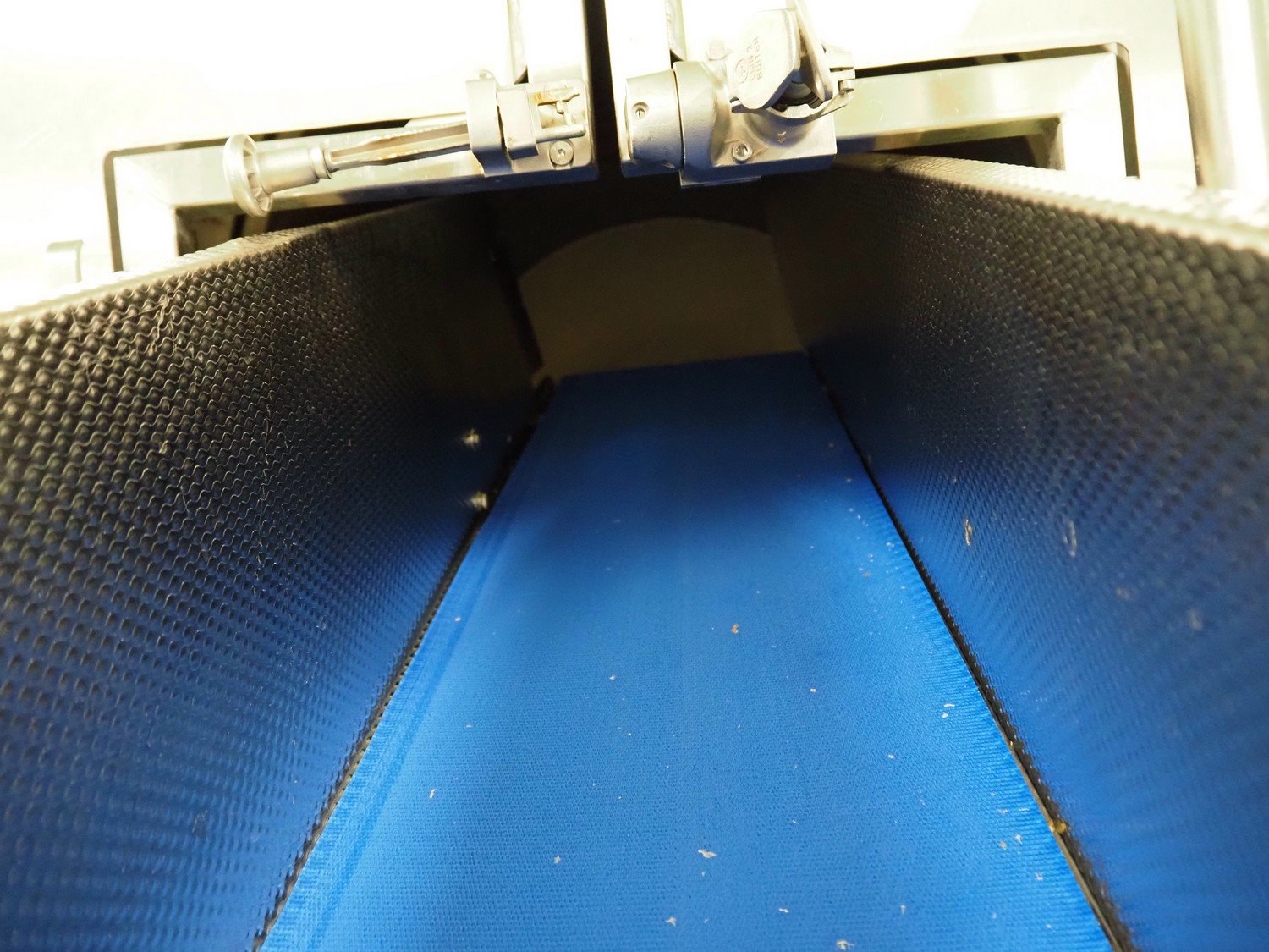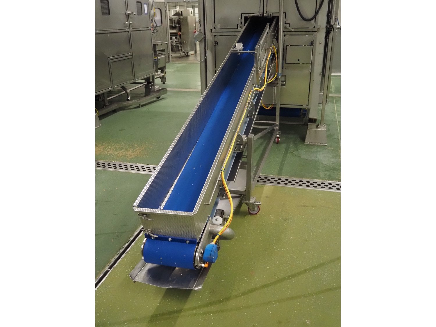 Eillert retractable elevating buffer belt, type: TR-4000, machine number: 438, year of construction: 2006, 230 V, 3 Ph, 2.6 A, 0.37 kW, s/s frame, plastic belt, belt width: 300 mm, elevating height: 1600 mm, total dimensions: 4000 mm x 600 mm x 1900 mm.