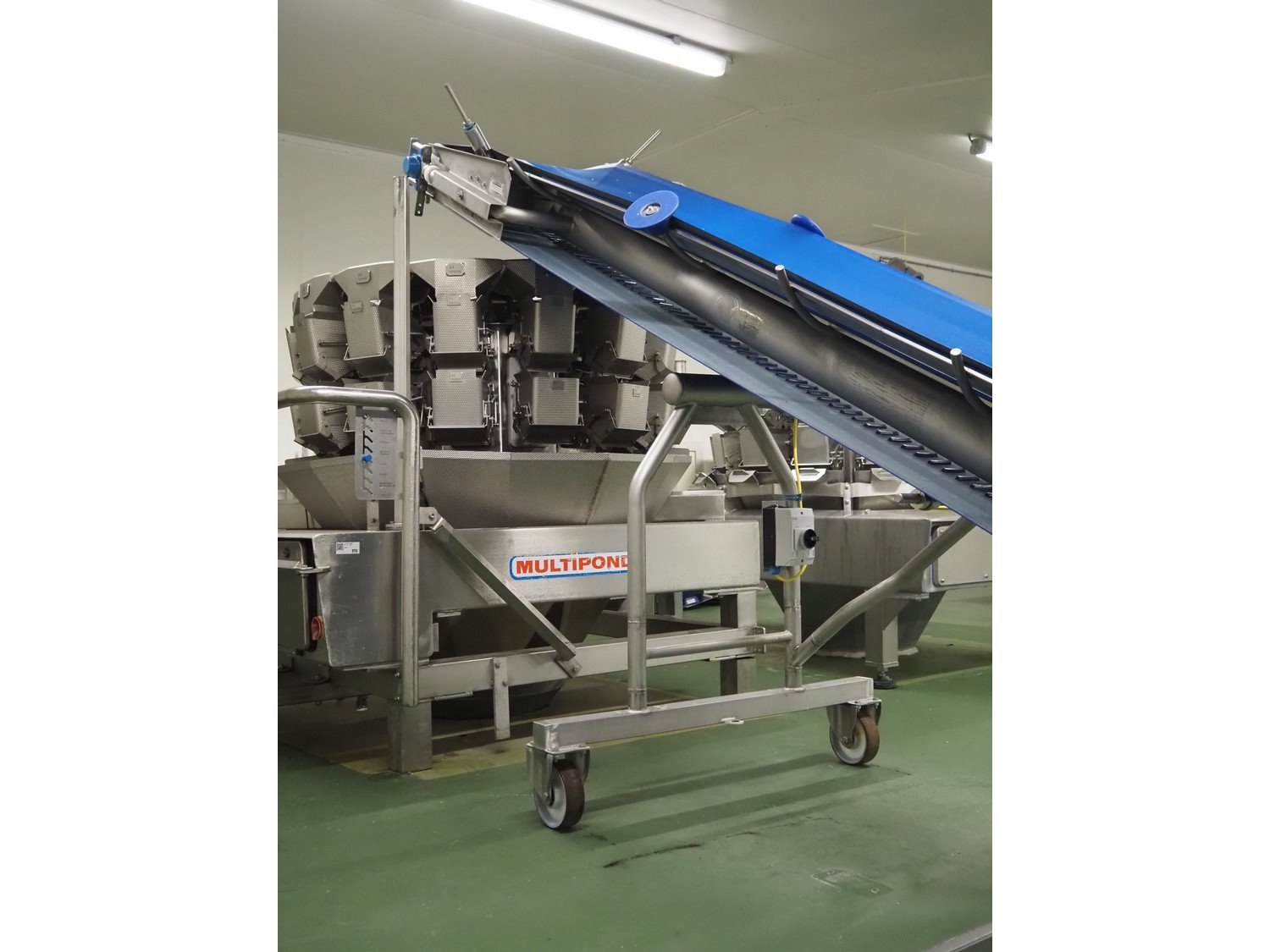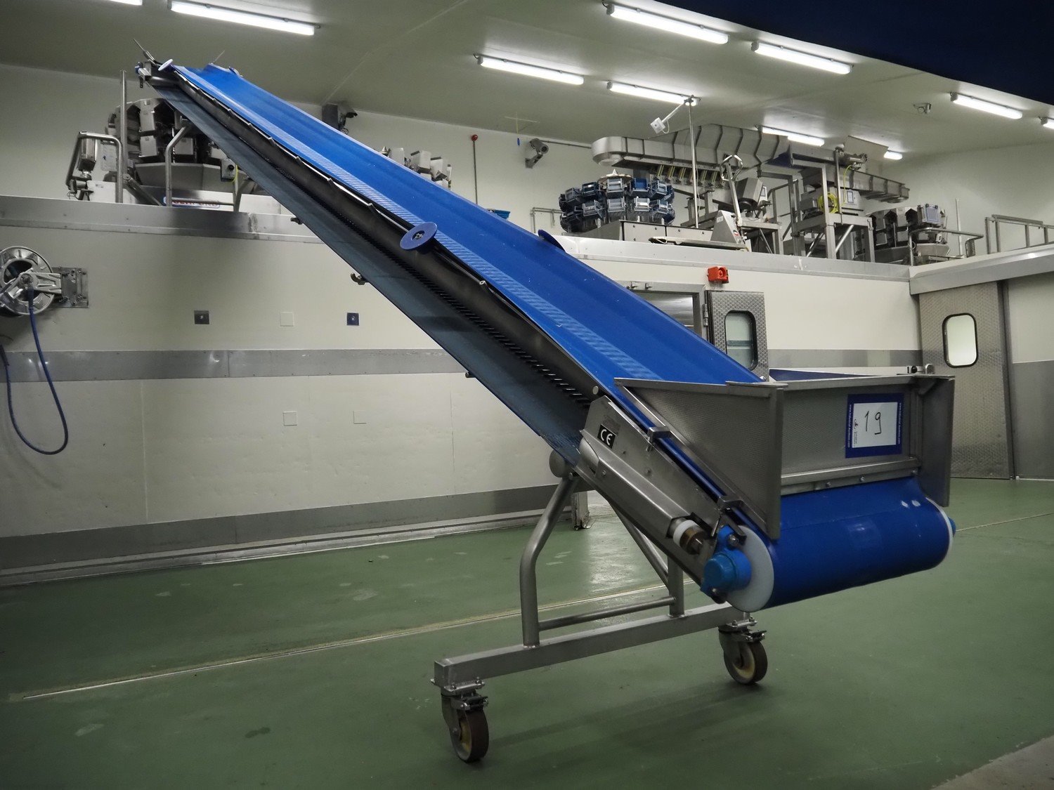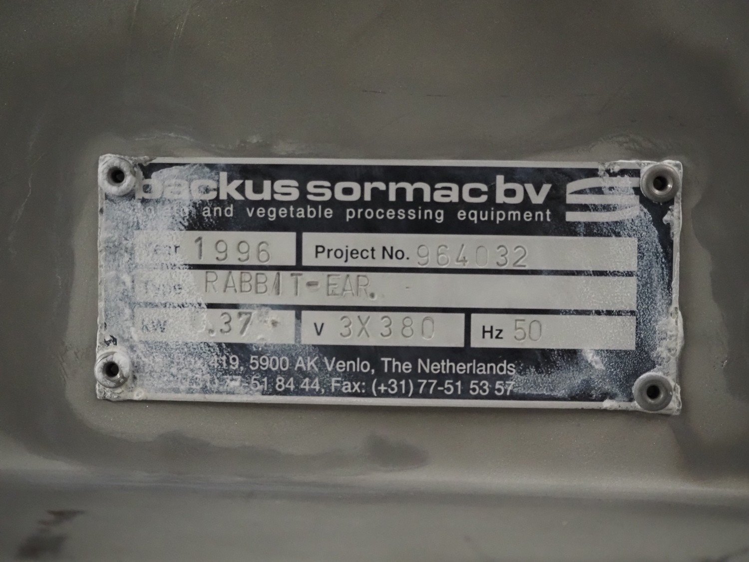 Backus Sormac BV mobile V-elevating belt, type: RABBIT-EAR, year of construction: 1996, 3 x 380 V, 50 Hz, 0.37 kW, s/s frame, plastic belt, belt width: 565 mm, elevating from 600 mm to 4800 mm, total dimensions: 8000 mm x 1200 mm x 4800 mm.