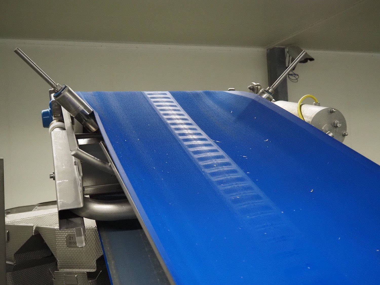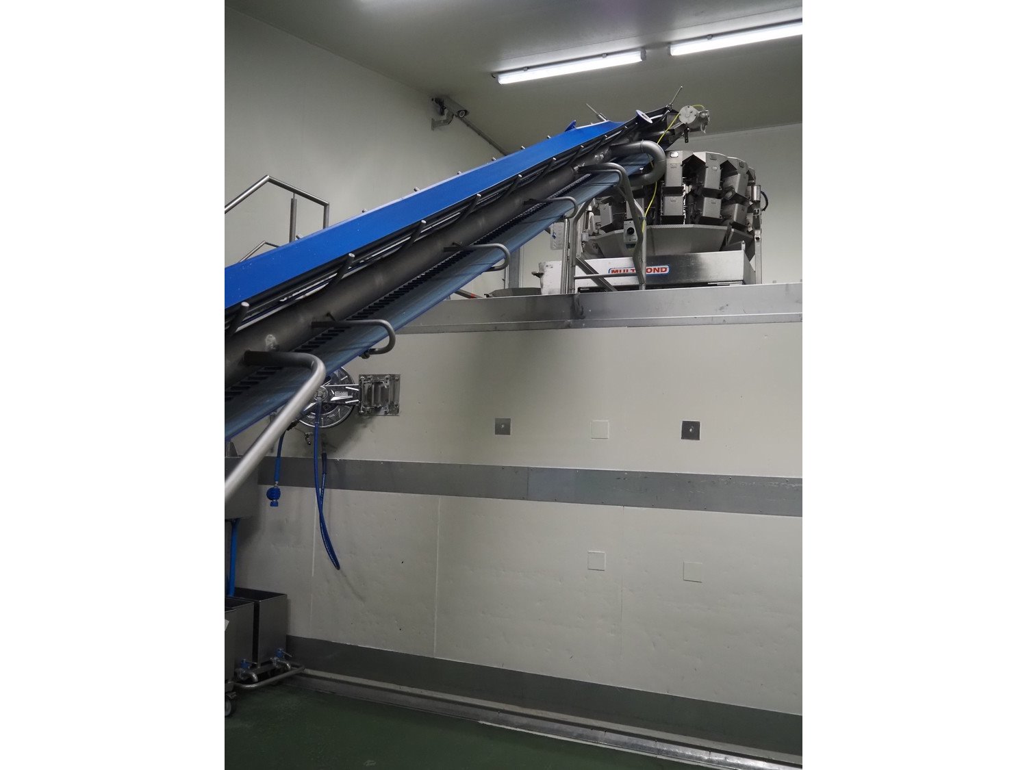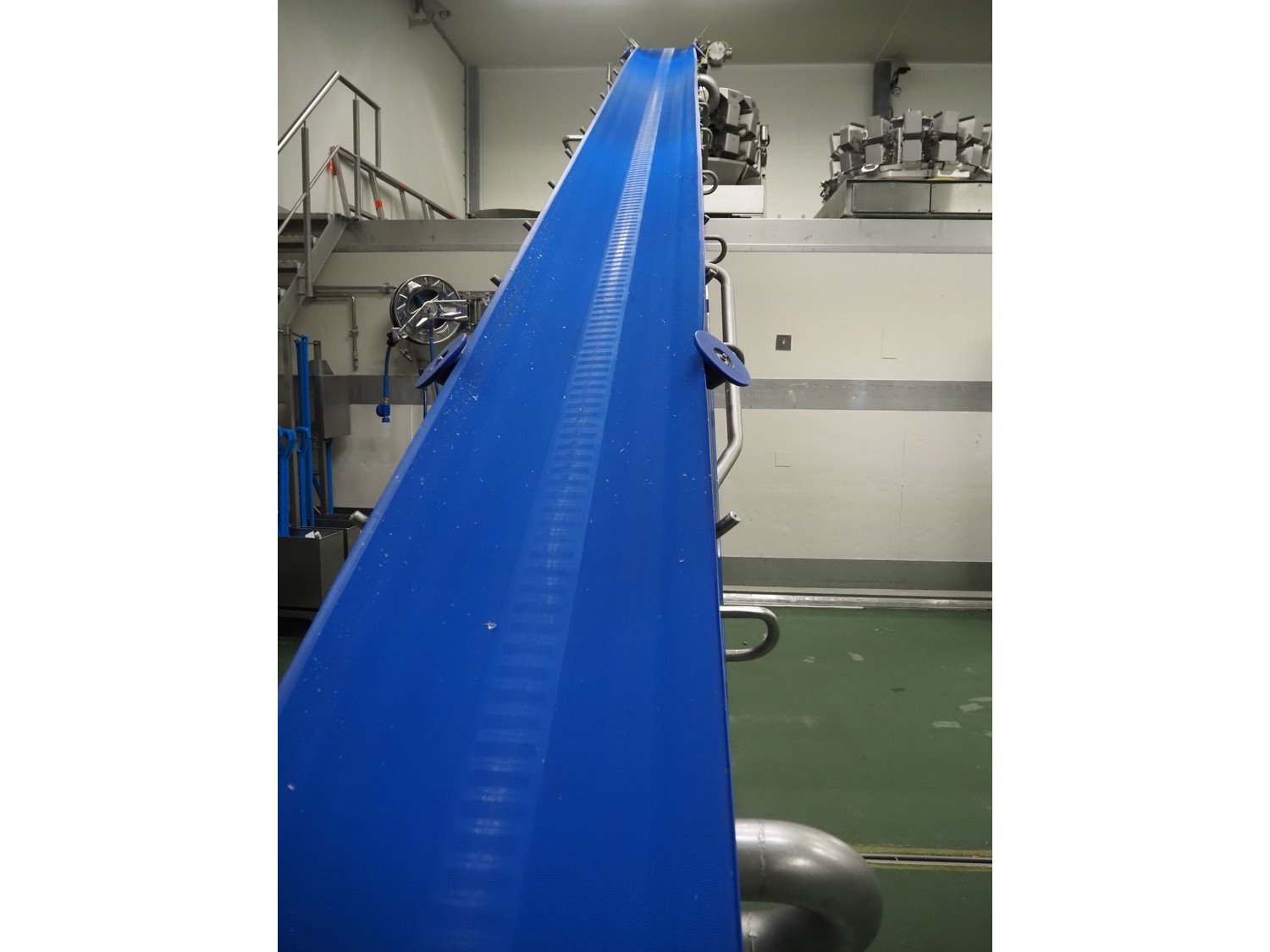Backus Sormac BV mobile V-elevating belt, type: RABBIT-EAR, year of construction: 1996, 3 x 380 V, 50 Hz, 0.37 kW, s/s frame, plastic belt, belt width: 565 mm, elevating from 600 mm to 4800 mm, total dimensions: 8000 mm x 1200 mm x 4800 mm.