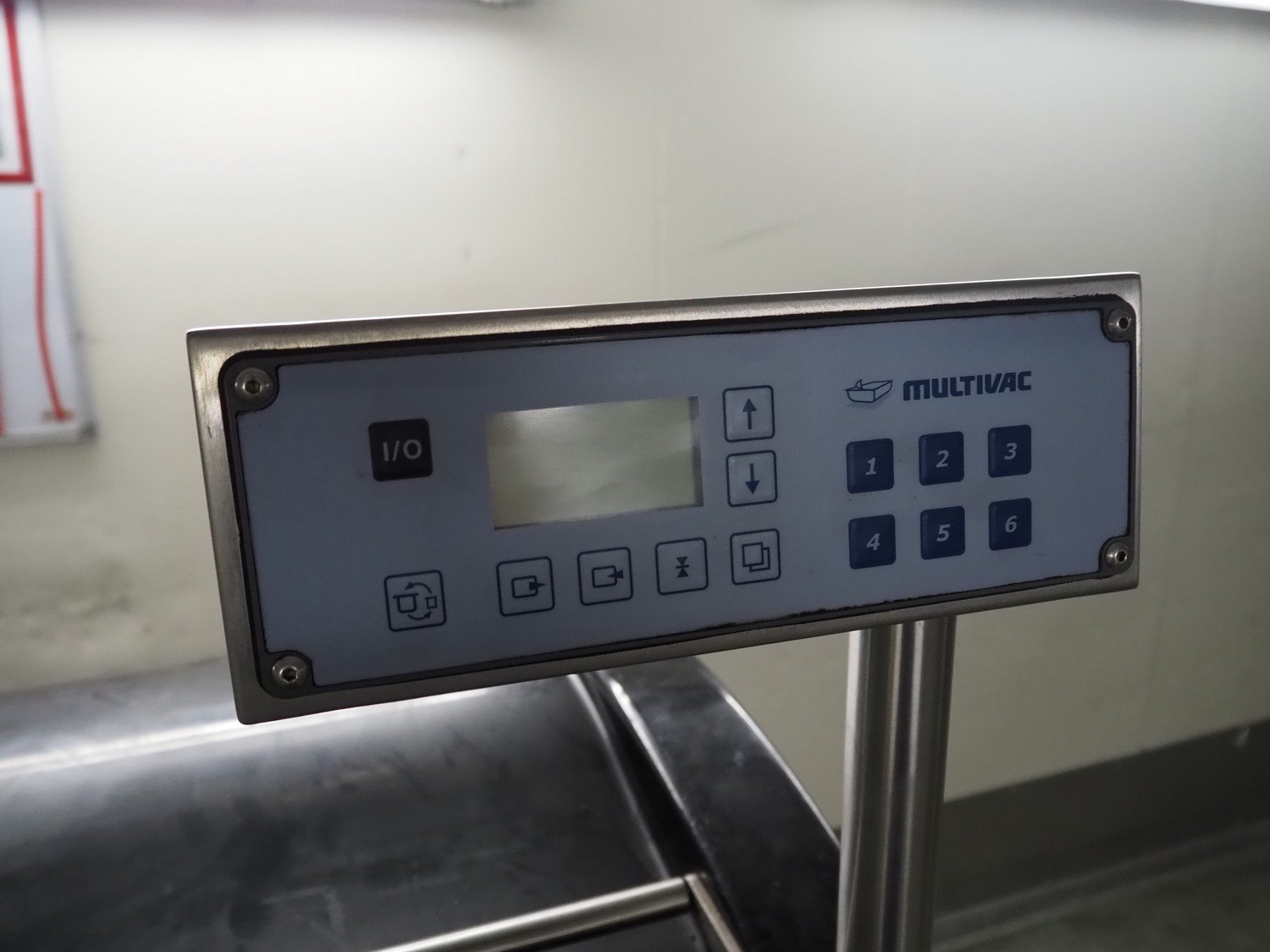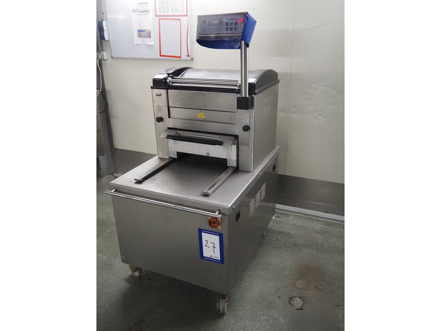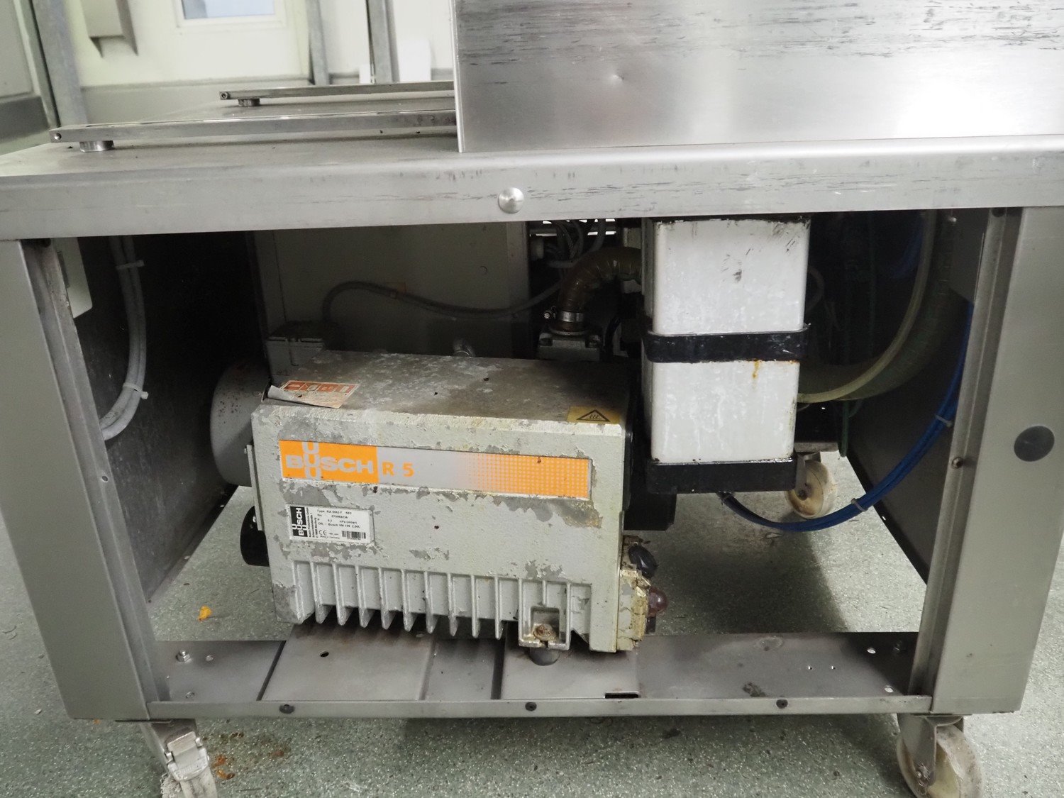 Multivac mobile traysealer, type: T200, machine number: 121012, year of construction: 2008, 400 V, 3 Ph, 50 Hz, 20 A, 3.8 kW, dye: (2x) 245 mm x 150 mm, Busch vacuum pump, type: RA 0063 F, year of construction: 2007, capacity: 63 m³ per hour, total dimensions: 1250 mm x 800 mm x 1610 mm.