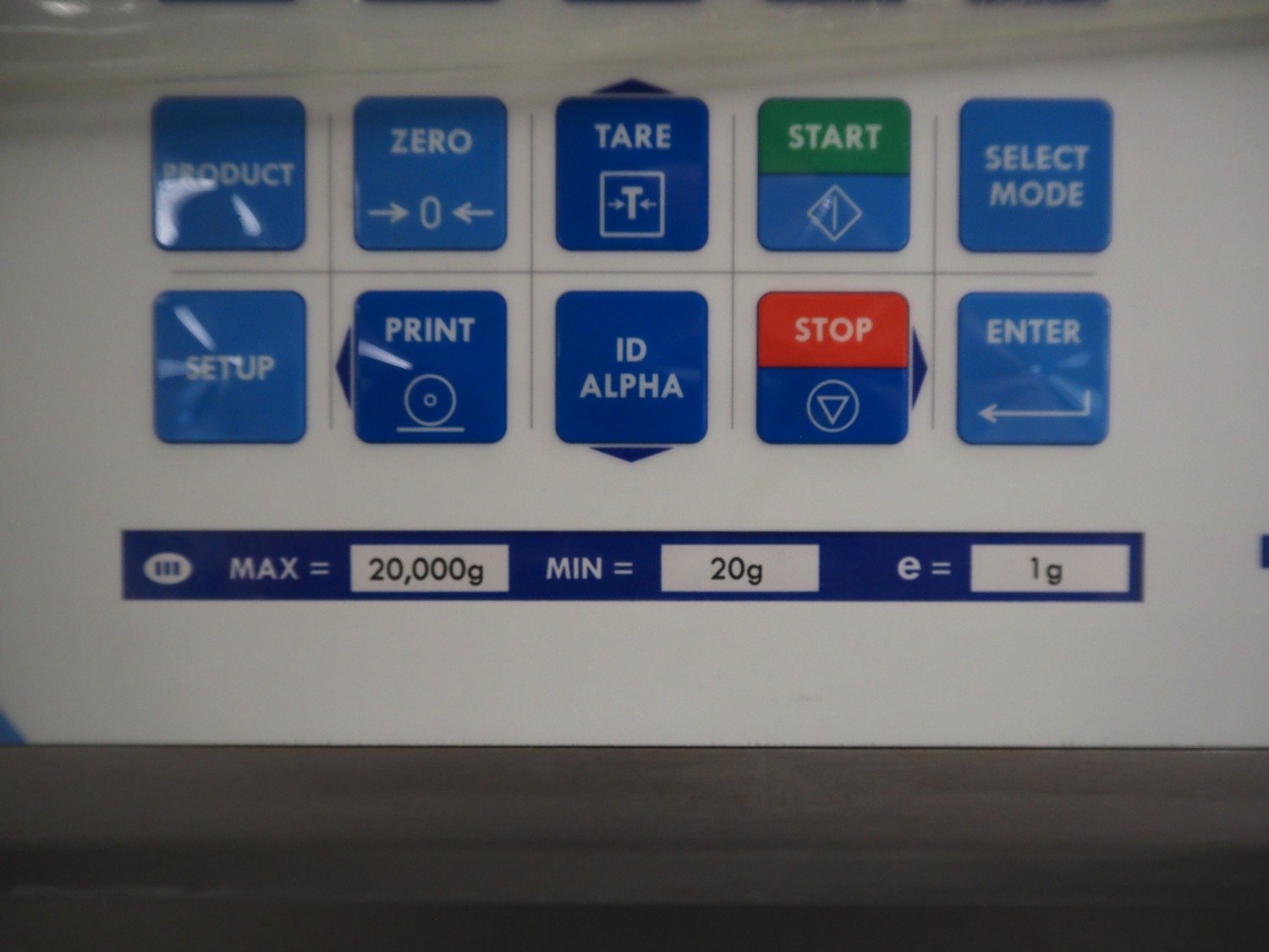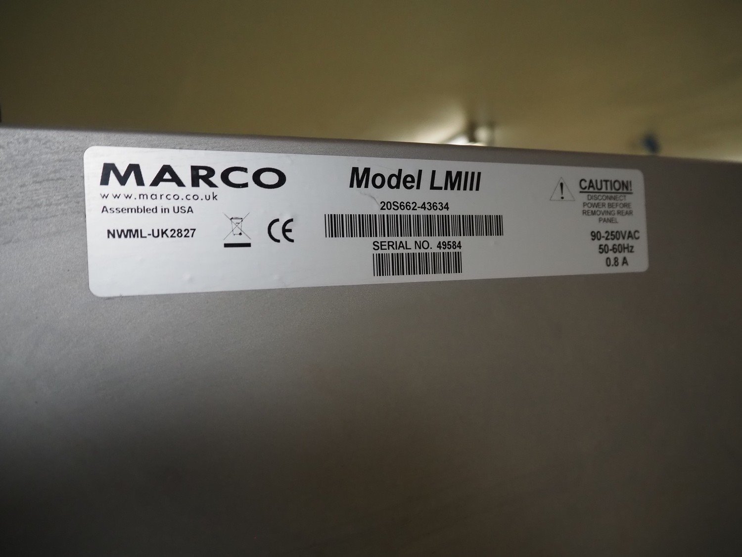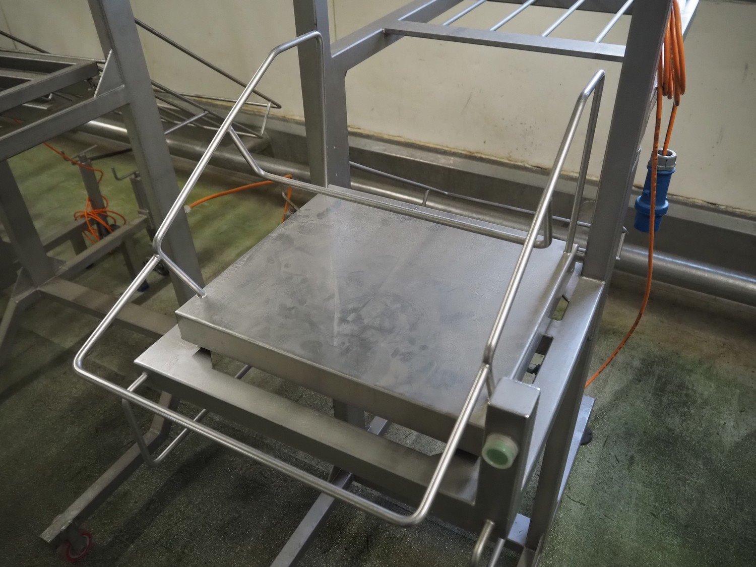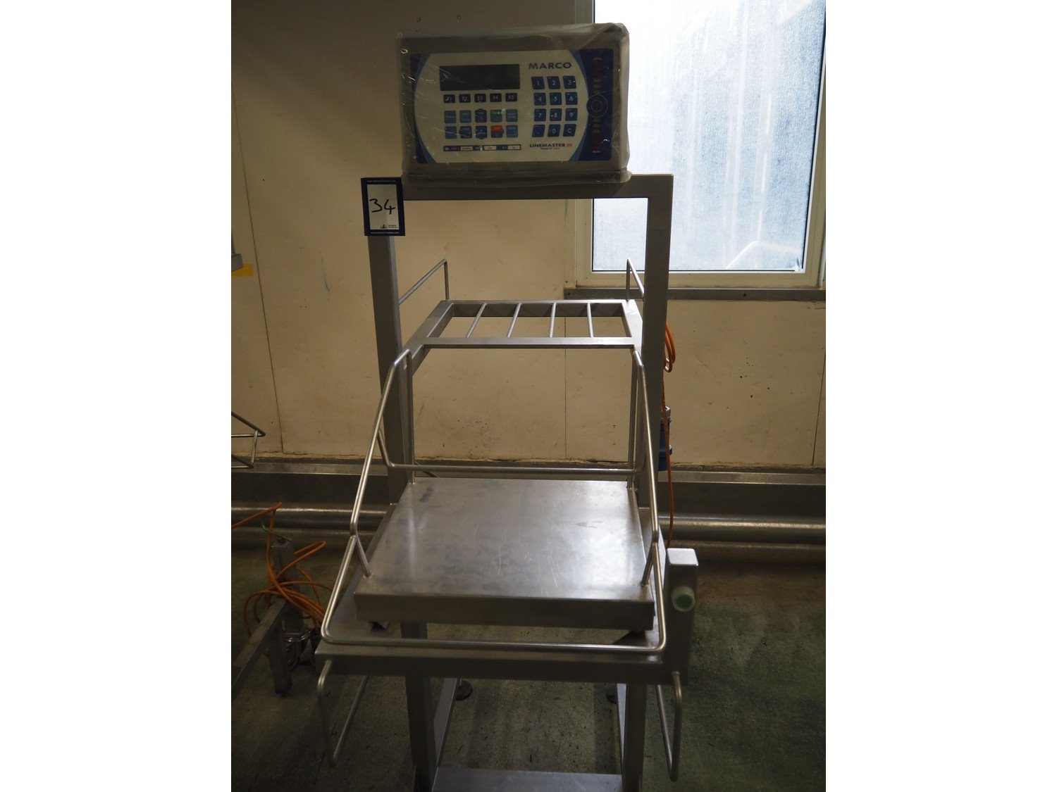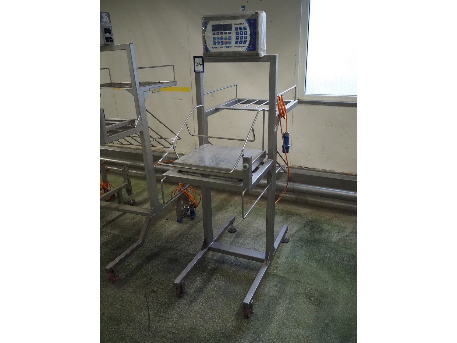 Marco weighing scale for crates on s/s mobile frame, model: LMIII, serial number: 49584, 90-250 V, 50-60 Hz, 0.8 A, maximum: 20000 gram, minimum: 20 gram, e= 1 gram, dimensions scale: 440 mm x 400 mm, total dimensions: 1280 mm x 550 mm x 1780 mm.
