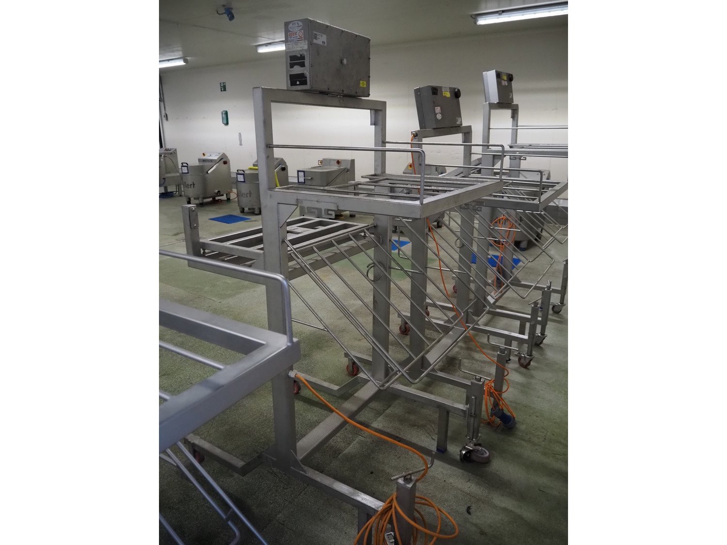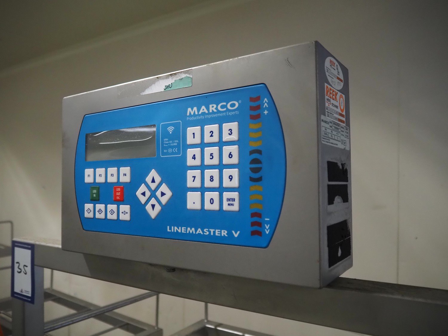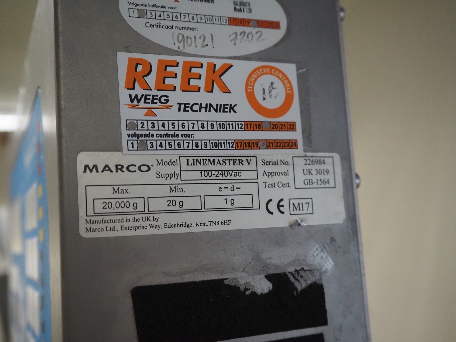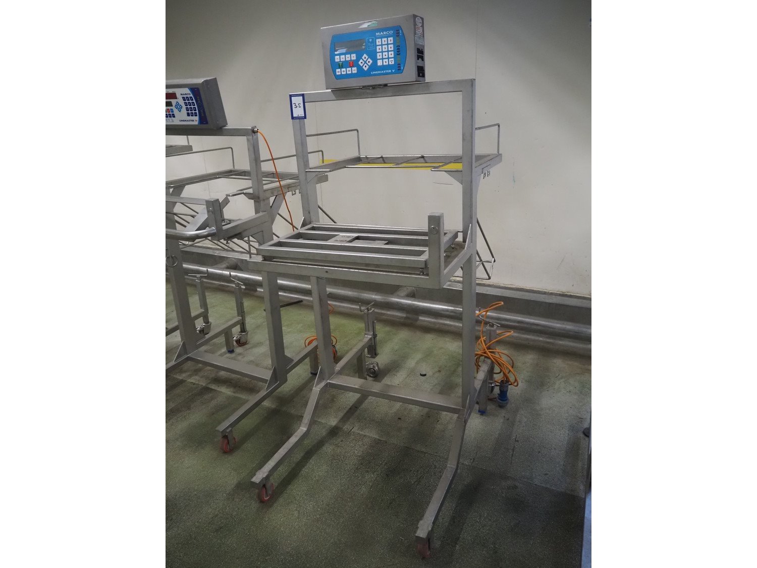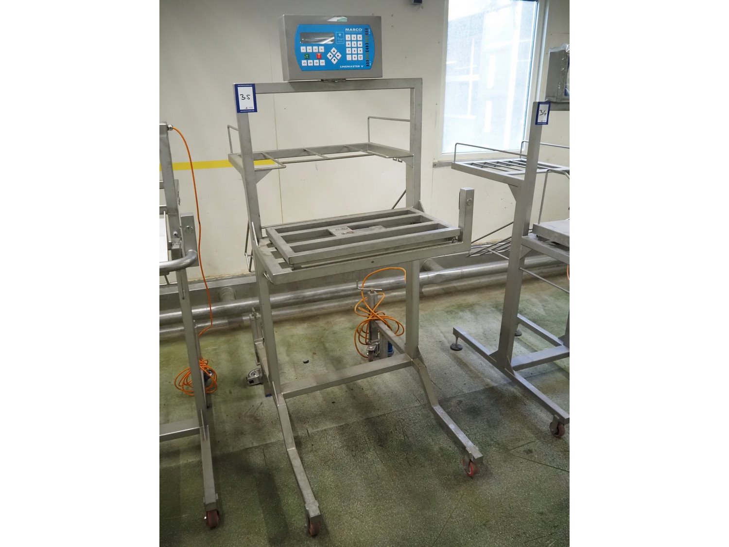 Marco weighing scale for crates on s/s mobile frame, model: LineMaster V, serial number: 226984, year of construction: 2017, 110-230 V, maximum: 20000 gram, minimum: 20 gram, e= 1 gram, dimensions scale: 440 mm x 400 mm, total dimensions: 1280 mm x 550 mm x 1780 mm.