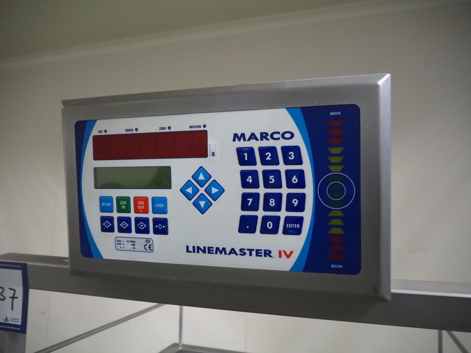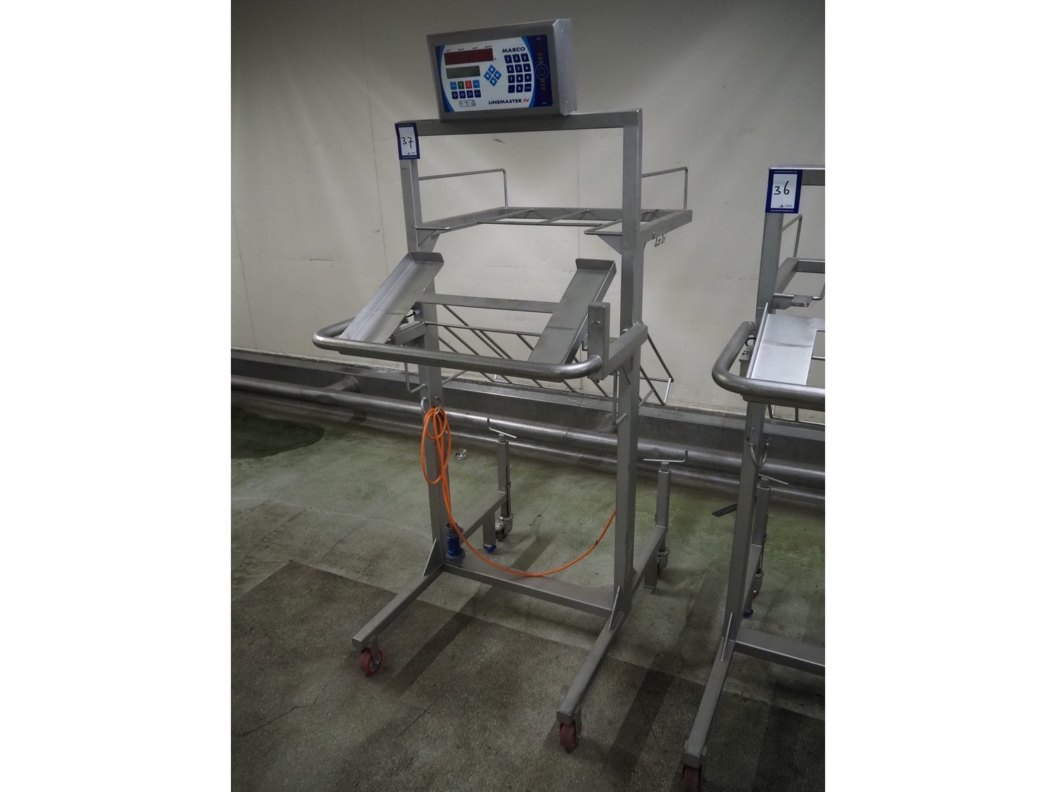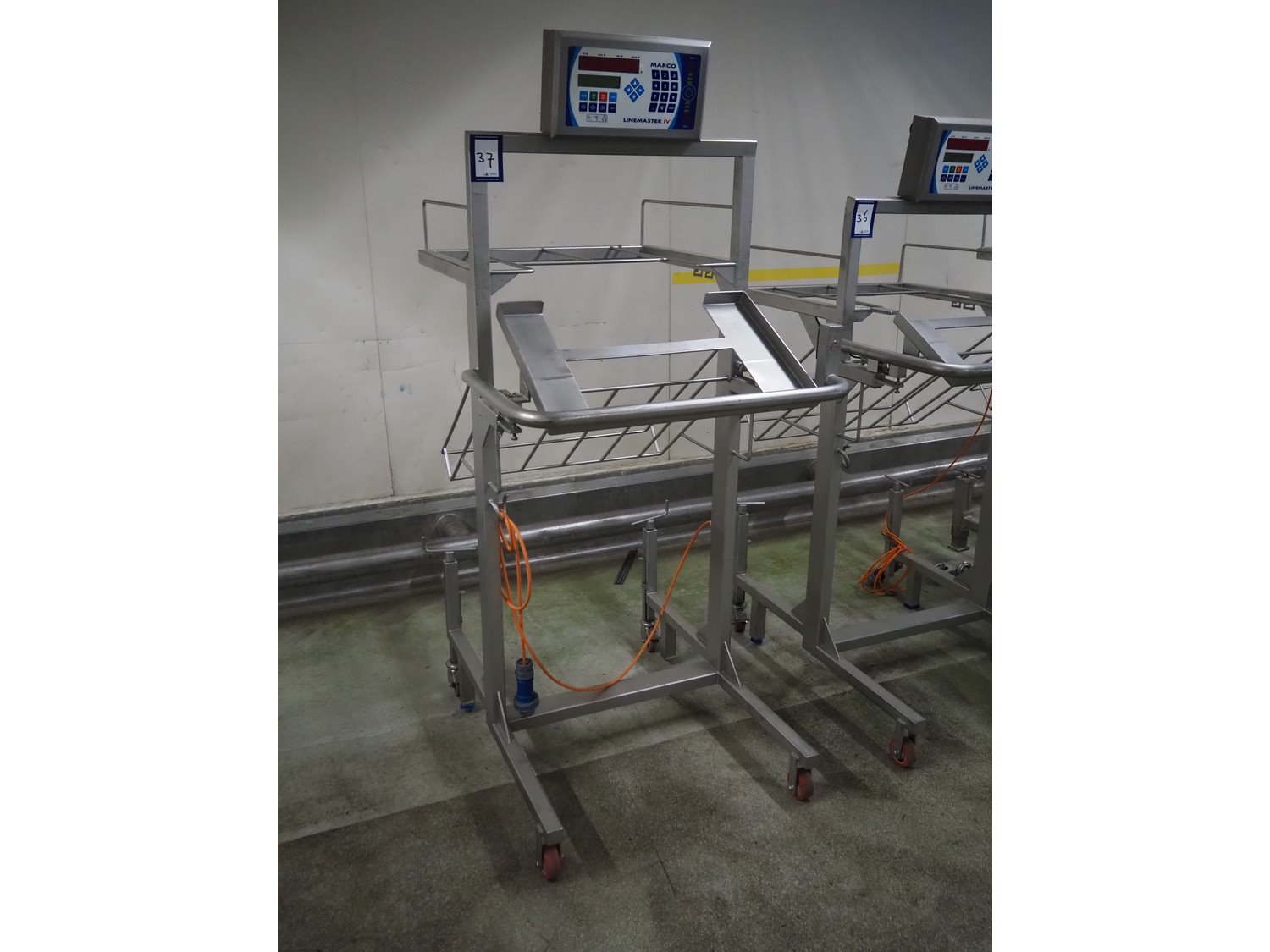Marco weighing scale for crates on s/s mobile frame, model: LineMaster IV, serial number: 169524, 110-230 V, maximum: 20000 gram, minimum: 20 gram, e= 1 gram, dimensions scale: 440 mm x 400 mm, total dimensions: 1280 mm x 550 mm x 1780 mm.