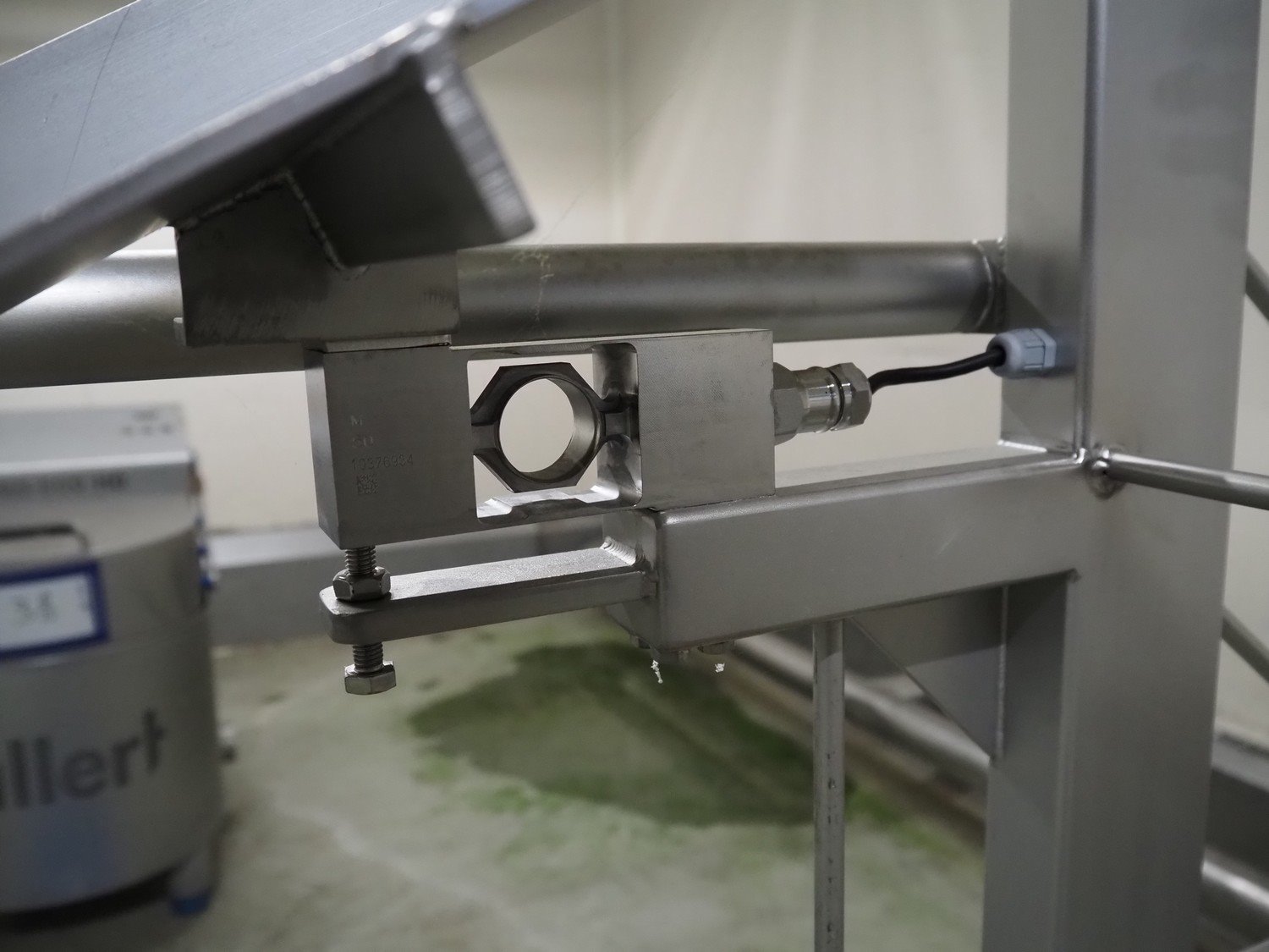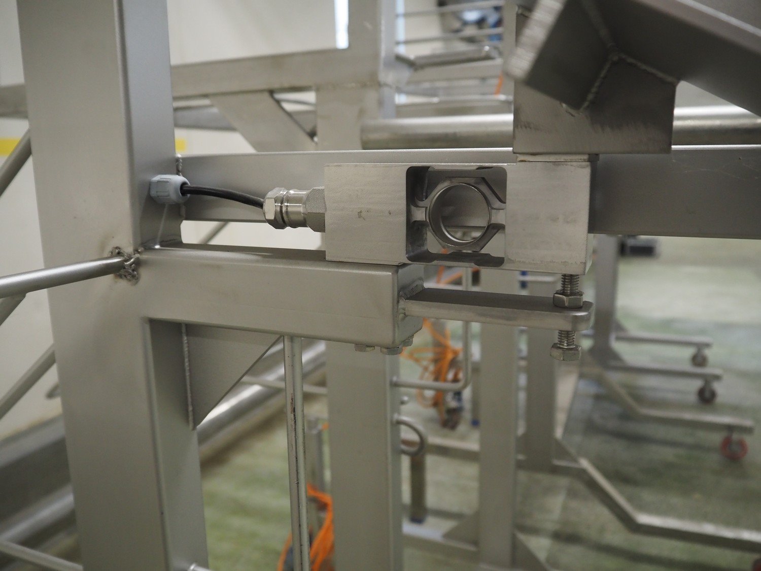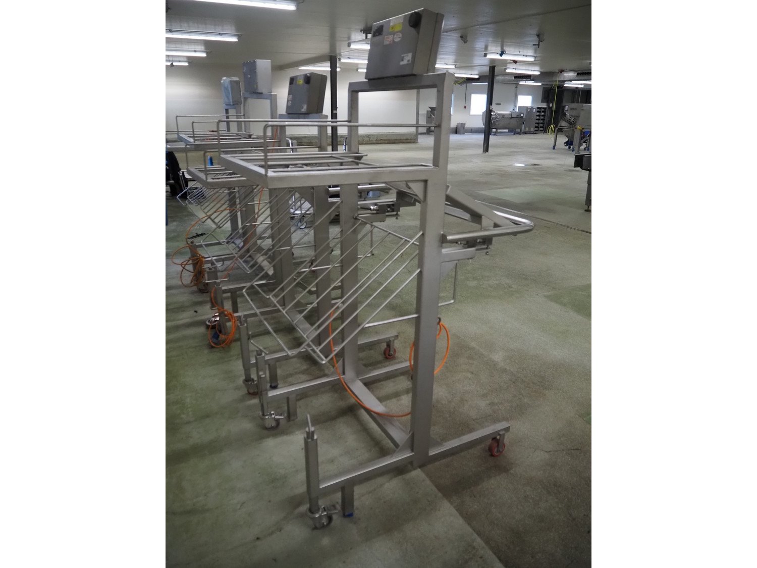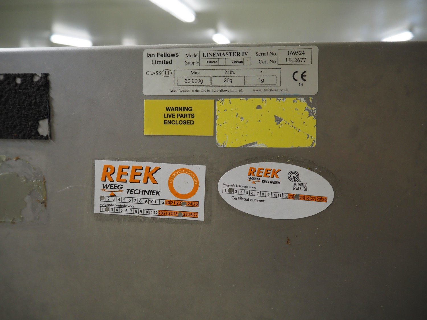 Marco weighing scale for crates on s/s mobile frame, model: LineMaster IV, serial number: 169524, 110-230 V, maximum: 20000 gram, minimum: 20 gram, e= 1 gram, dimensions scale: 440 mm x 400 mm, total dimensions: 1280 mm x 550 mm x 1780 mm.