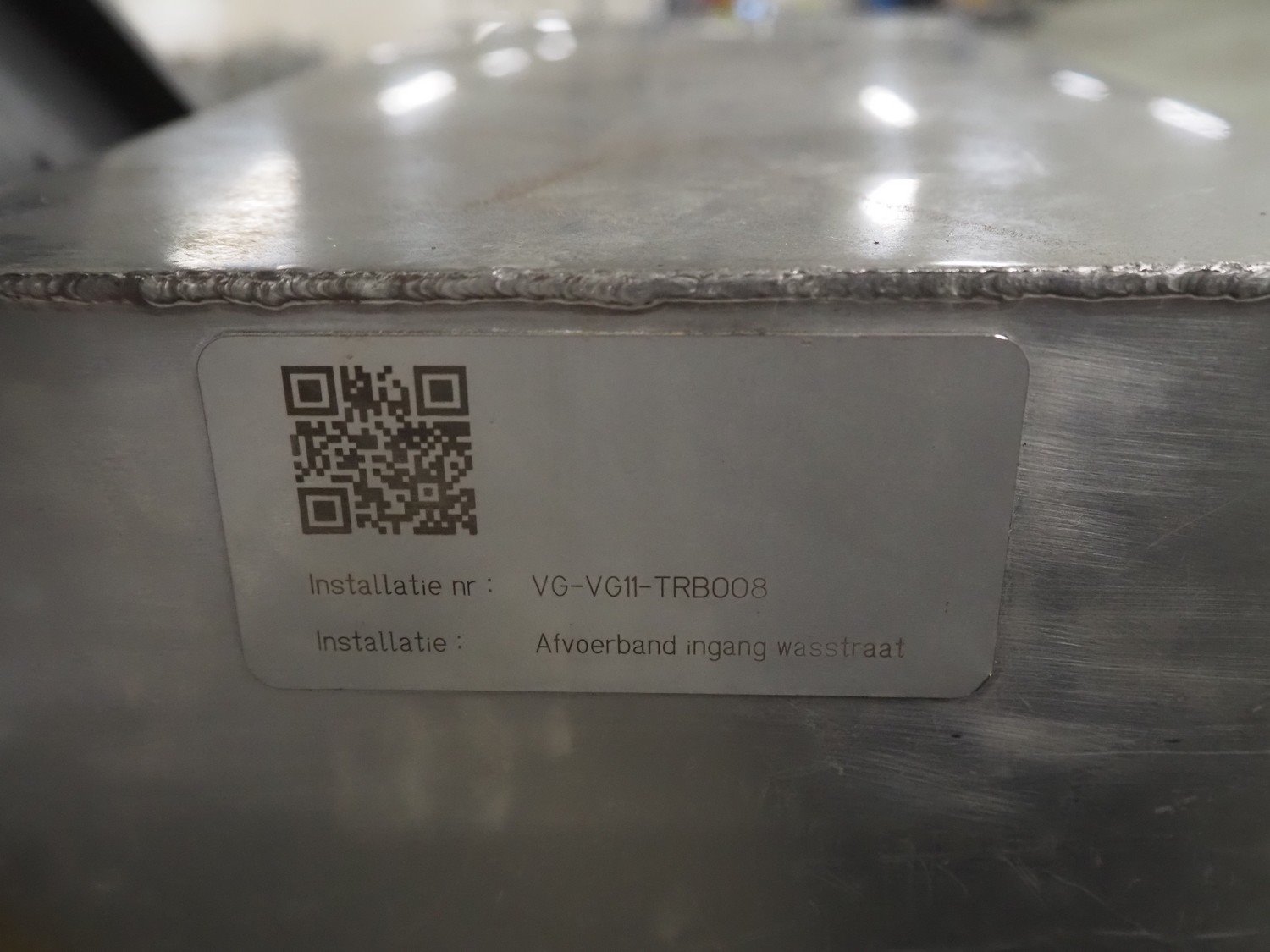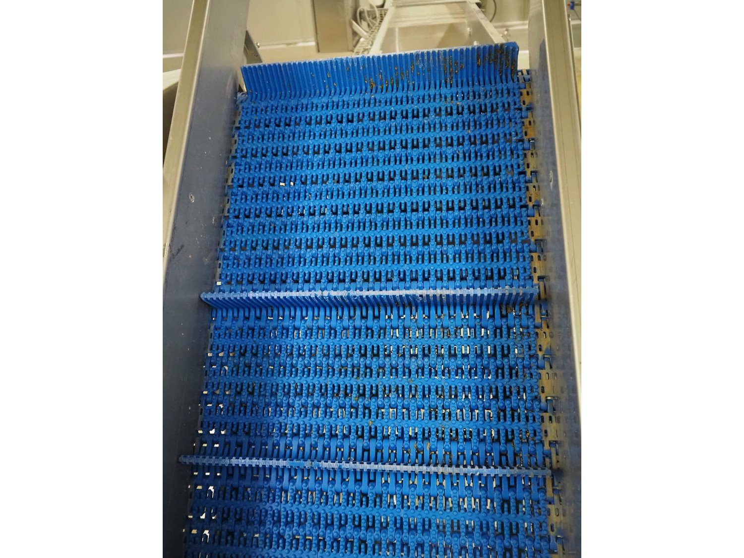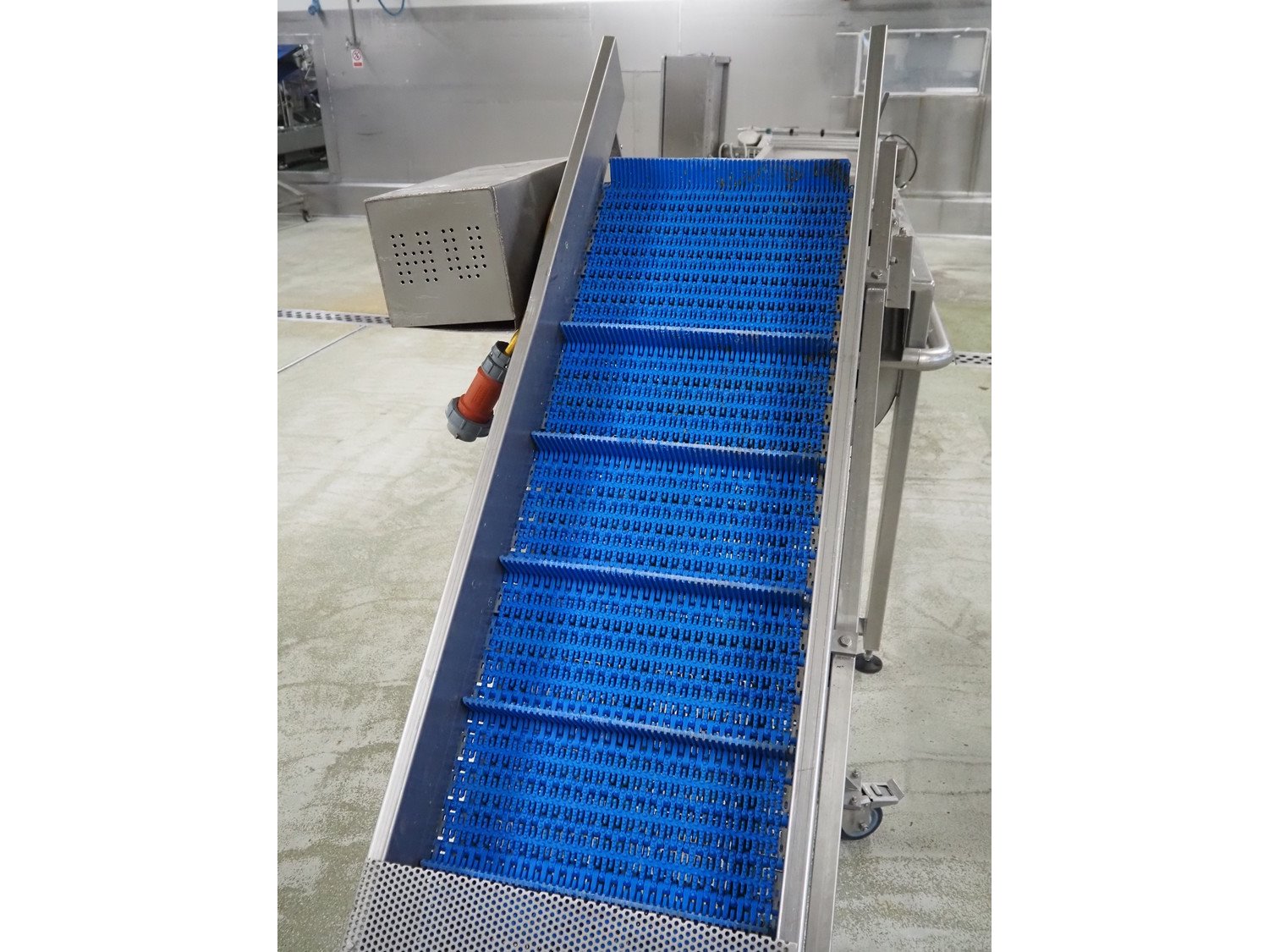 Mobile elevating belt with dividers, s/s frame, plastic mesh belt, belt width: 500 mm, divider height: 50 mm, distance between dividers: 200 mm, elevating height: 1250 mm, total dimensions: 1700 mm x 800 mm x 1550 mm.