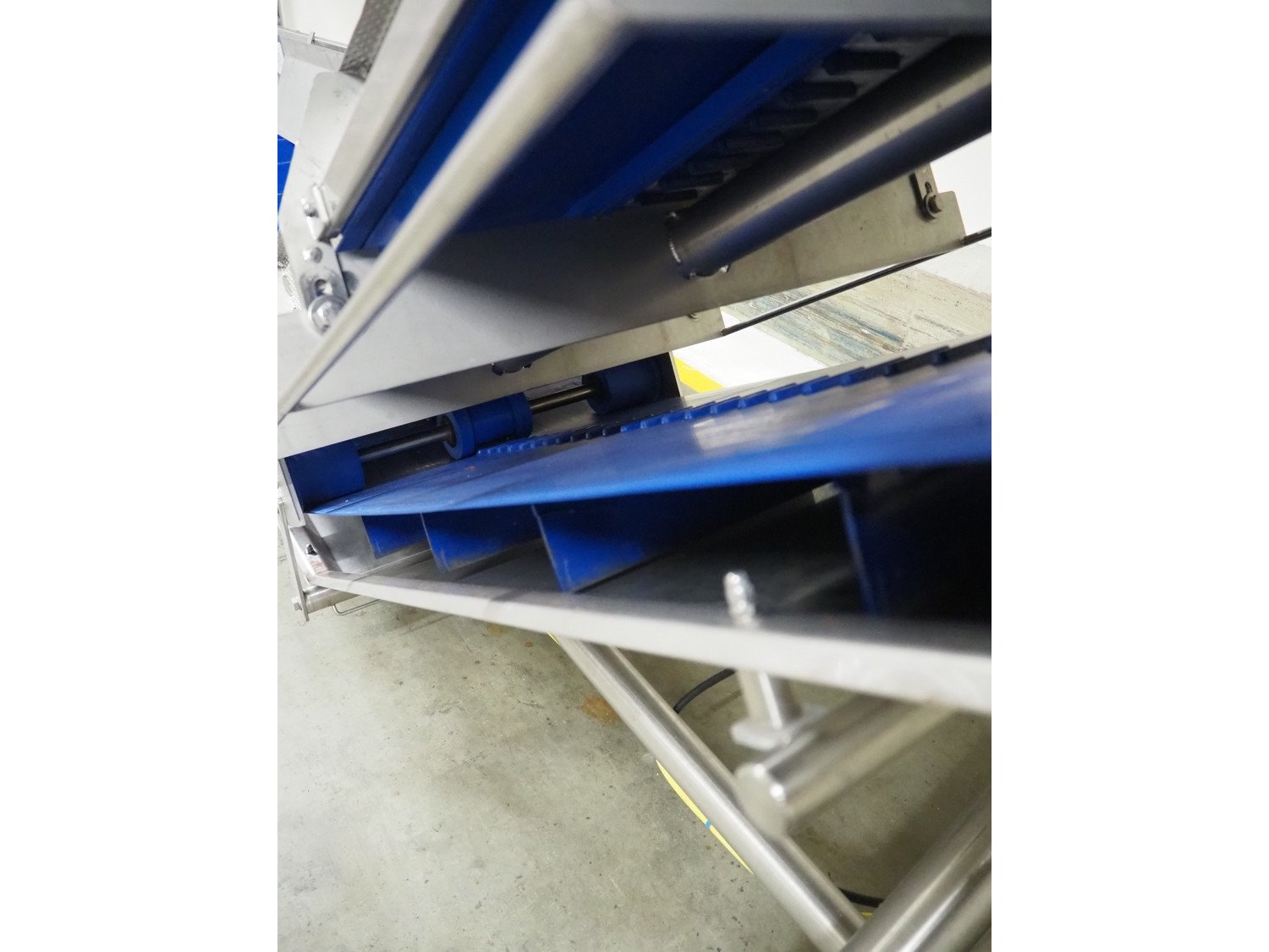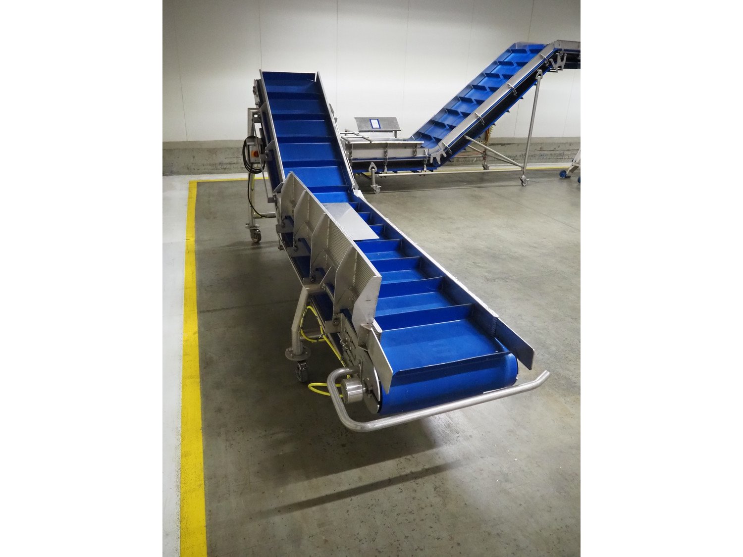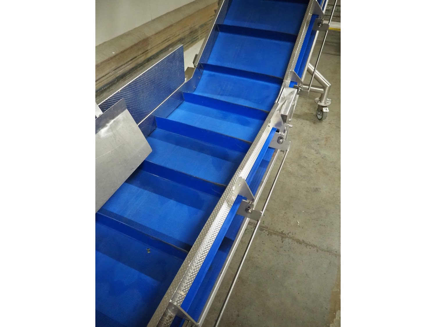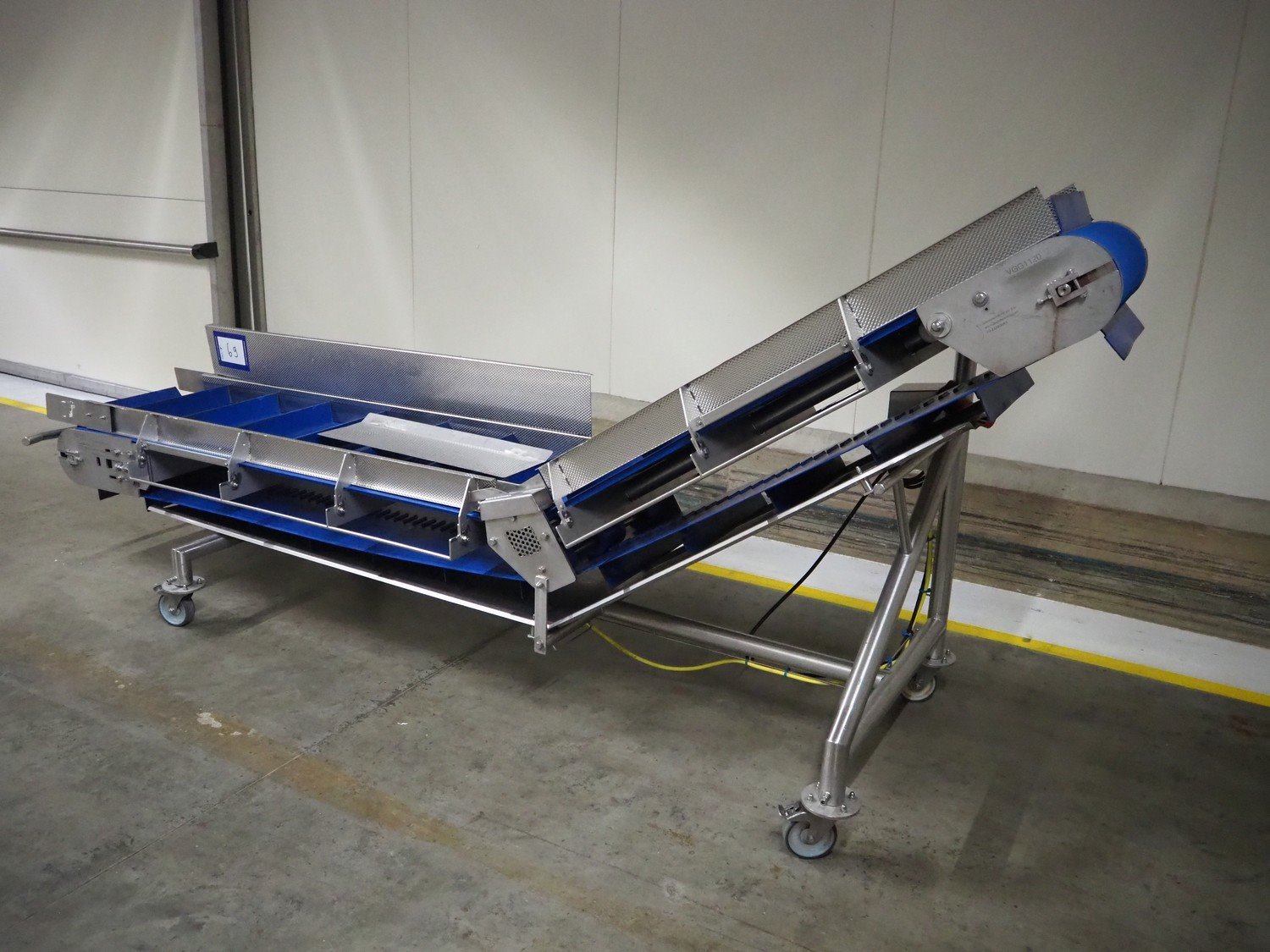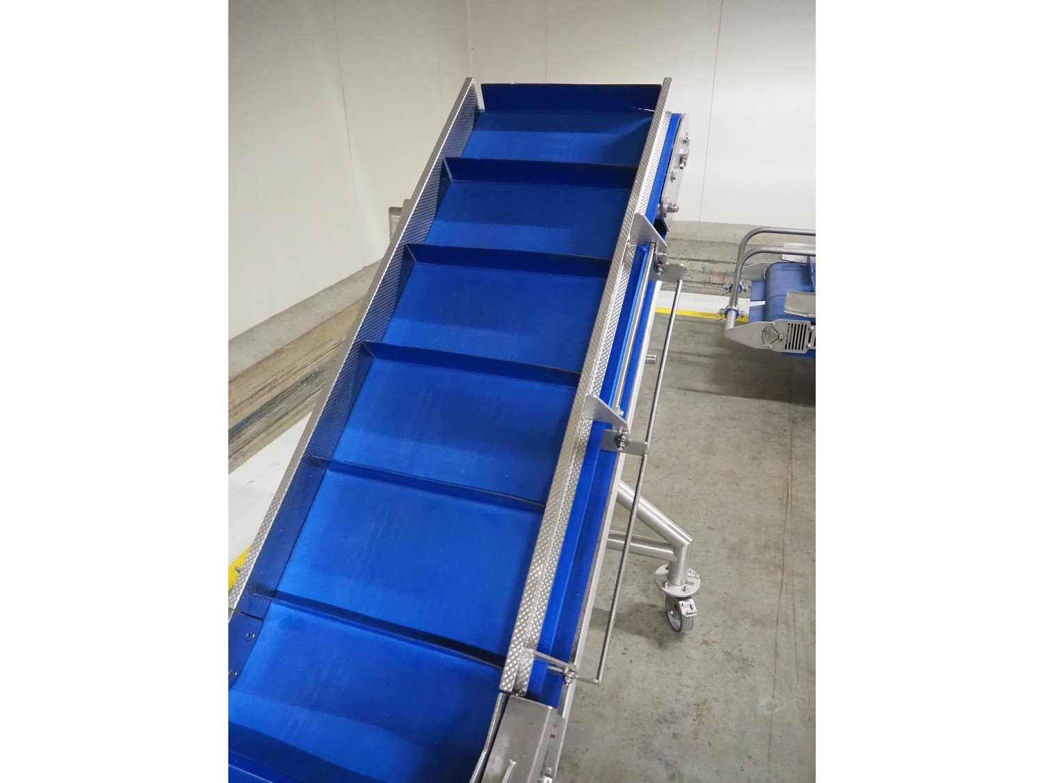 Hermsen RVS mobile elevating belt with dividers, s/s frame, plastic belt, belt width: 600 mm, divider height: 80 mm, distance between dividers: 300 mm, elevating height: 1450 mm, total dimensions: 3800 mm x 1100 mm x 1600 mm.