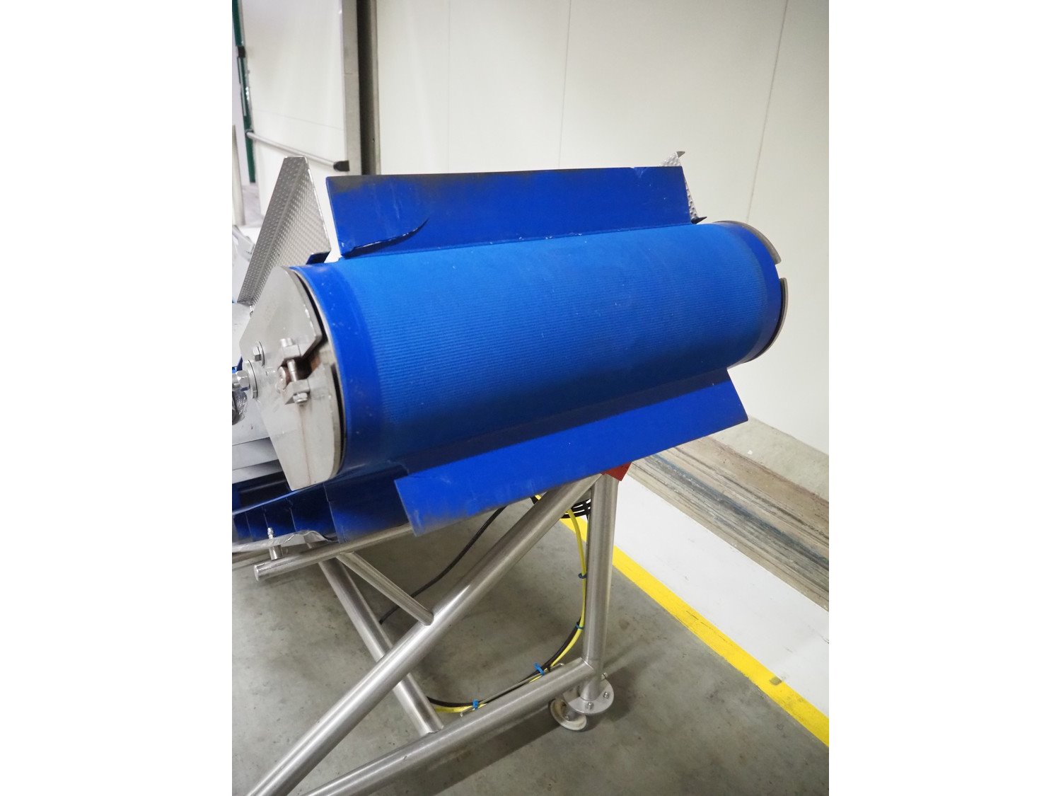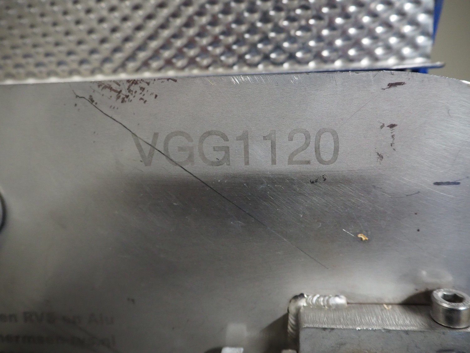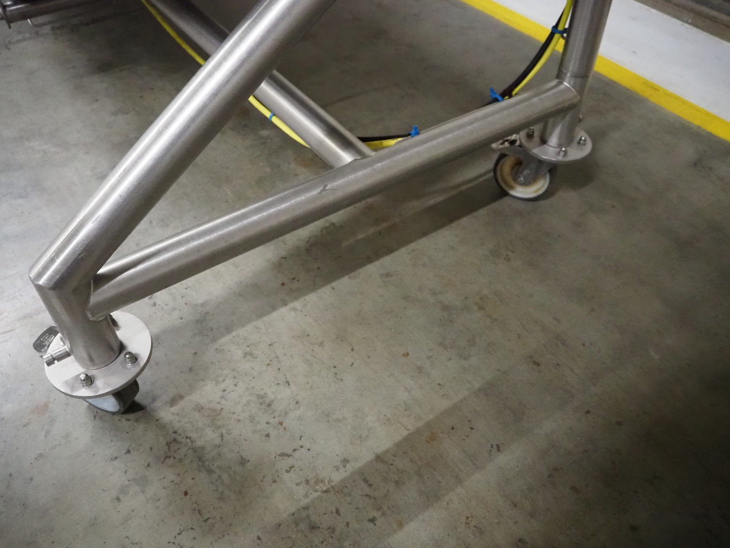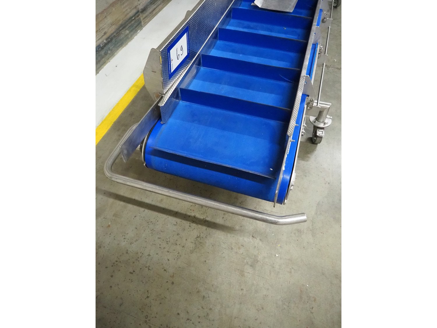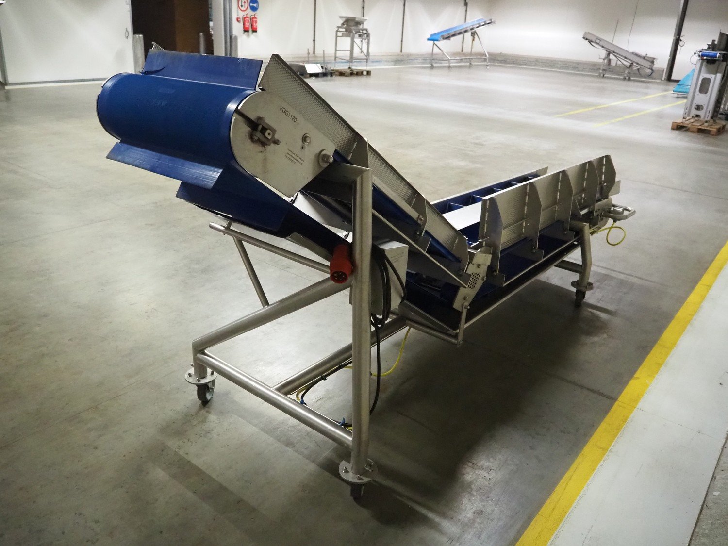 Hermsen RVS mobile elevating belt with dividers, s/s frame, plastic belt, belt width: 600 mm, divider height: 80 mm, distance between dividers: 300 mm, elevating height: 1450 mm, total dimensions: 3800 mm x 1100 mm x 1600 mm.