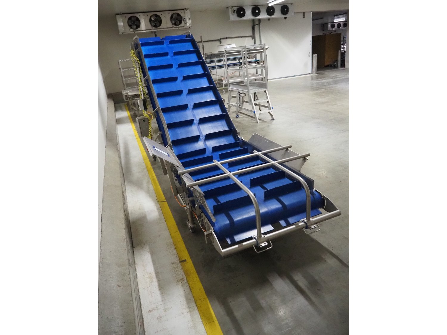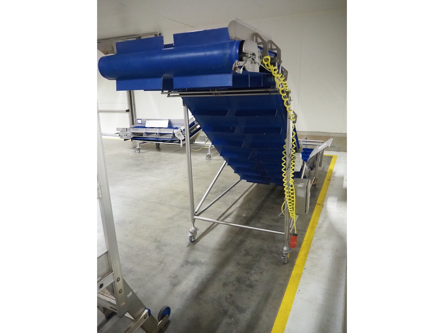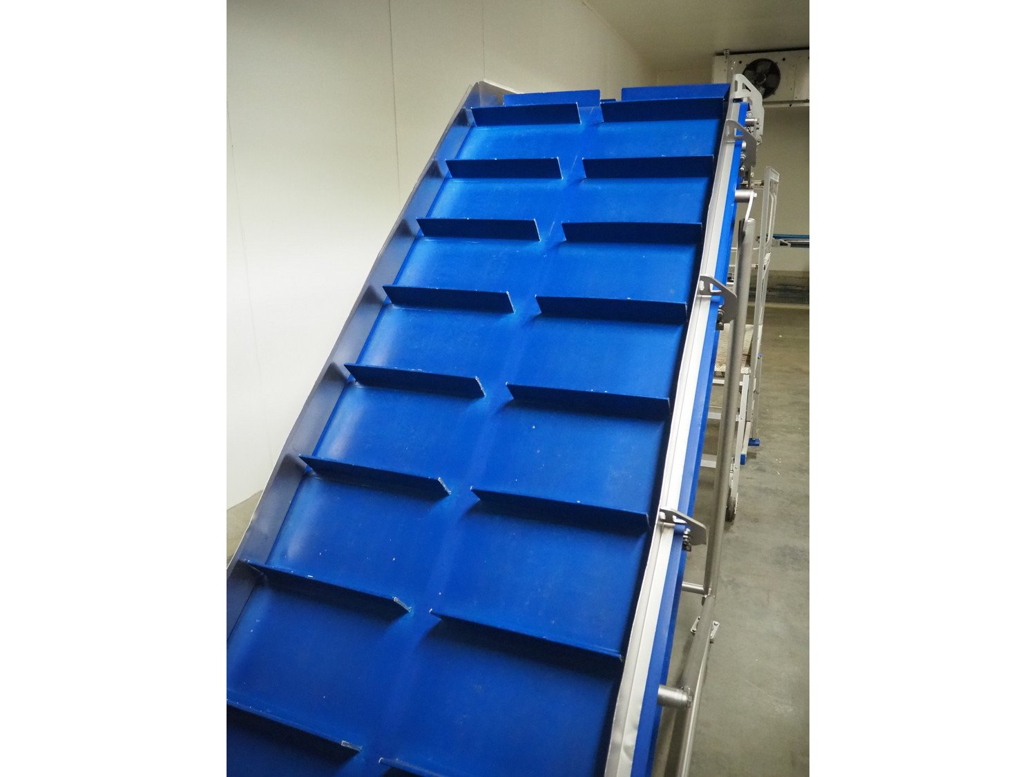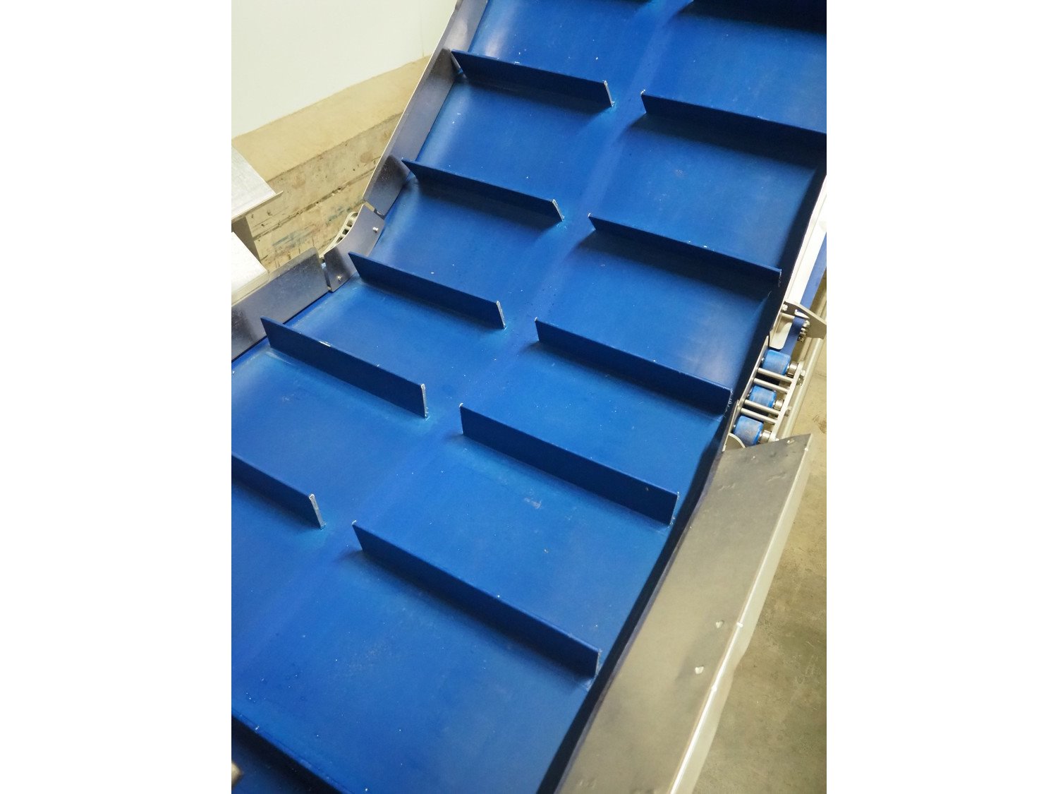 Hitec double lane elevating belt with dividers, type: Outfeed conveyor Z type, serial number: 2013-0228/WN1098, year of construction: 2014, 0.37 kW, s/s frame, plastic belt, belt width: 1000 mm, divider height: 80 mm, distance between dividers: 270 mm, elevating height: 1900 mm, total dimensions: 4800 mm x 1300 mm x 2100 mm.