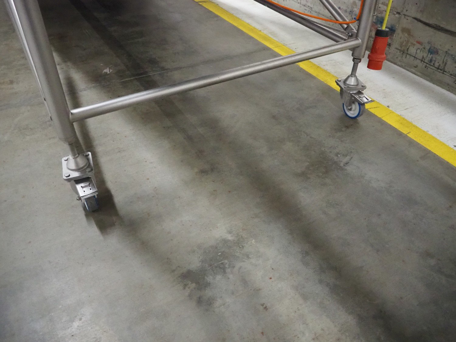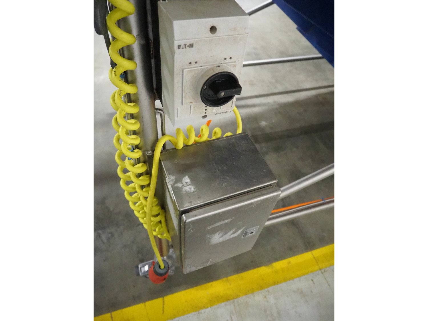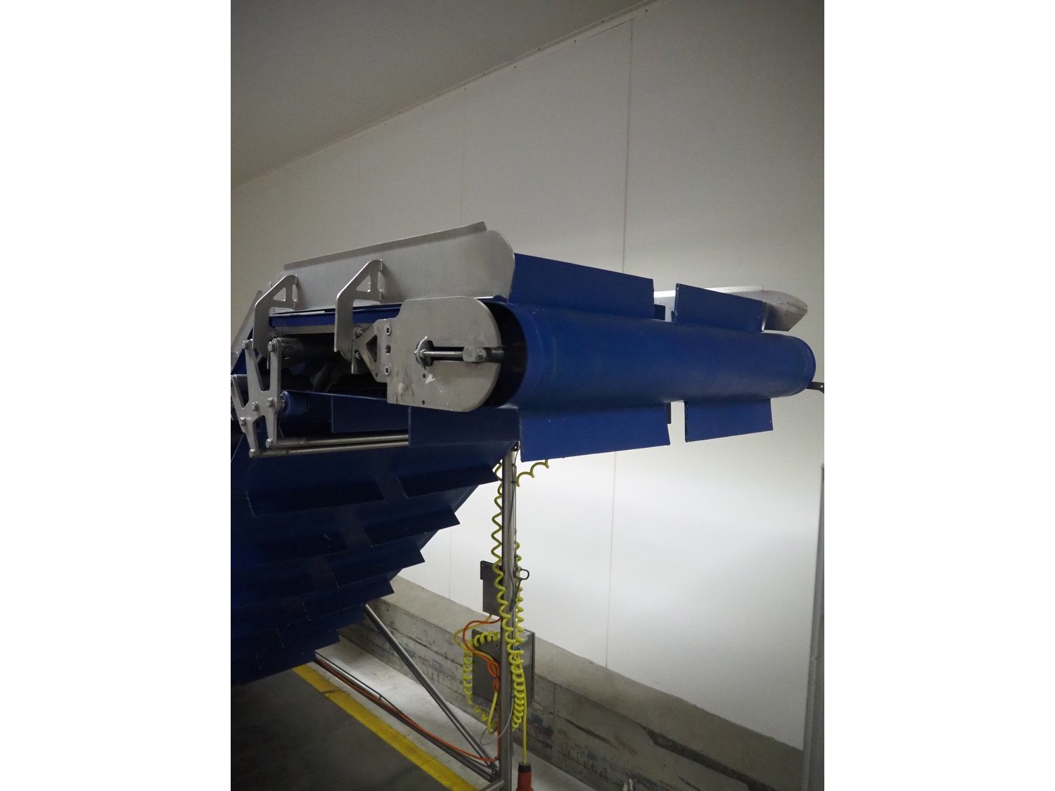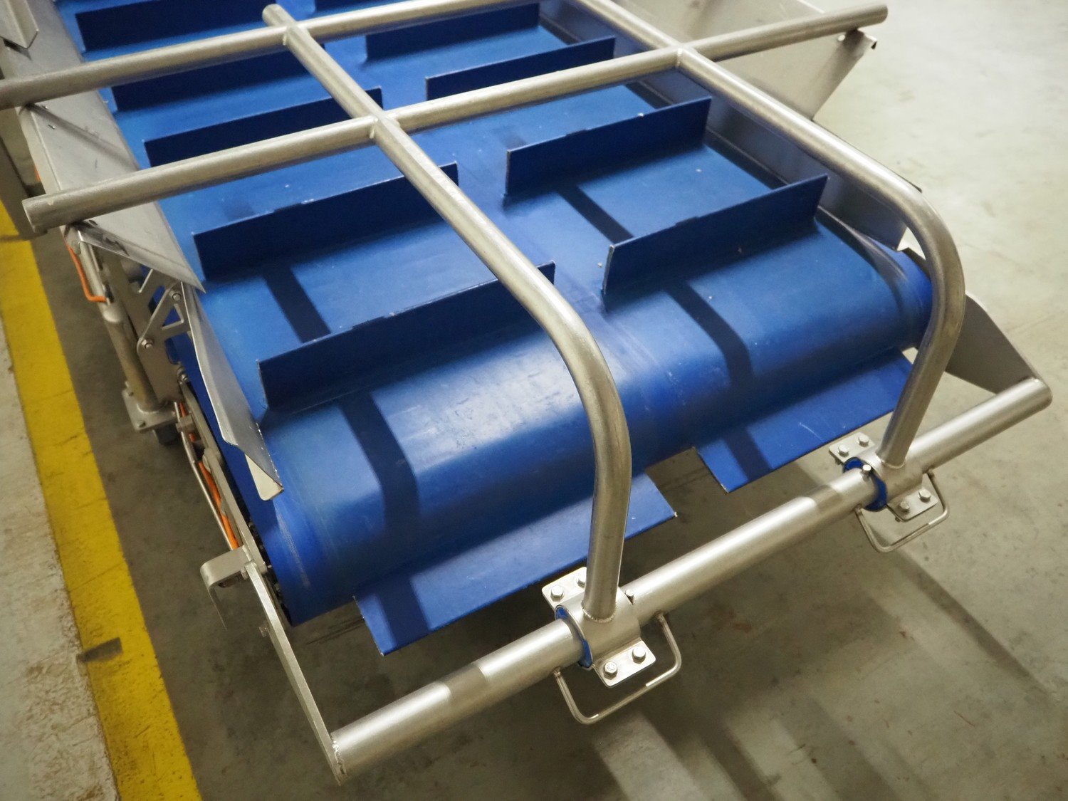 Hitec double lane elevating belt with dividers, type: Outfeed conveyor Z type, serial number: 2013-0228/WN1098, year of construction: 2014, 0.37 kW, s/s frame, plastic belt, belt width: 1000 mm, divider height: 80 mm, distance between dividers: 270 mm, elevating height: 1900 mm, total dimensions: 4800 mm x 1300 mm x 2100 mm.