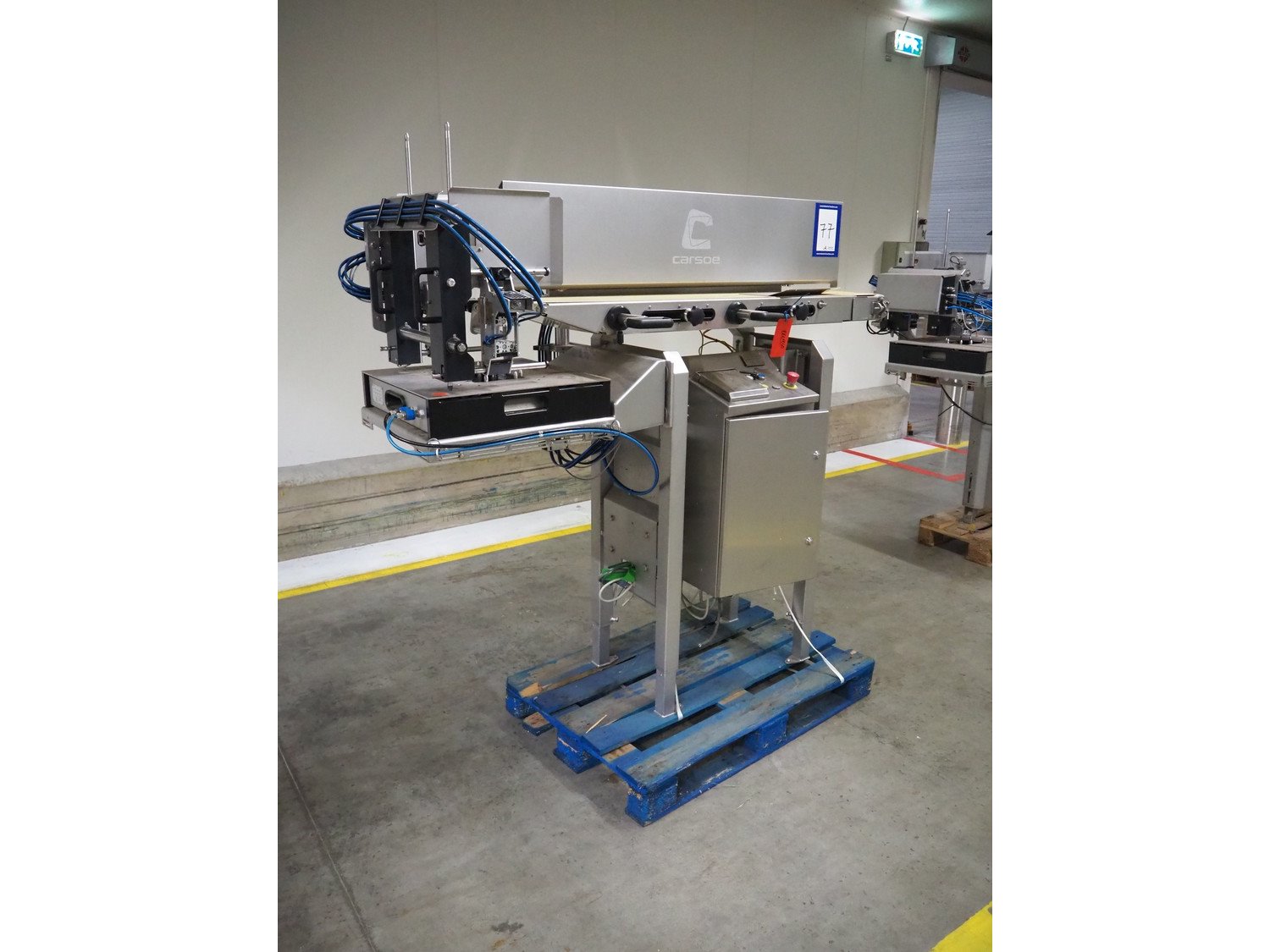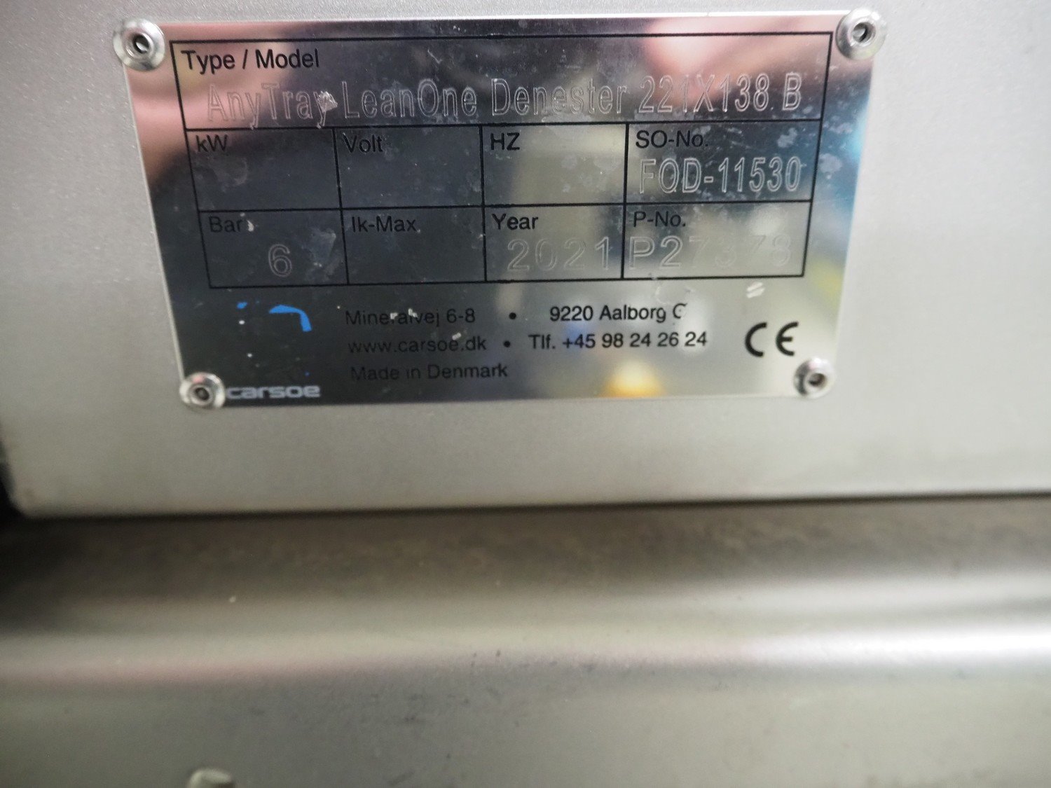 Carsoe tray denester, type/model: ANYTRAY BUFFER 1500 CLEANLINE RIGHT, year of construction: 2021, 1 x 230 V, 50 Hz, 0.46 kW, plastic belt, belt width: 270 mm, Carsoe tray dispenser, type/model: ANYTRAY LEANONE DENESTER 221 x 138 B, year of construction: 2021, total dimensions: 1900 mm x 700 mm x 1700 mm.