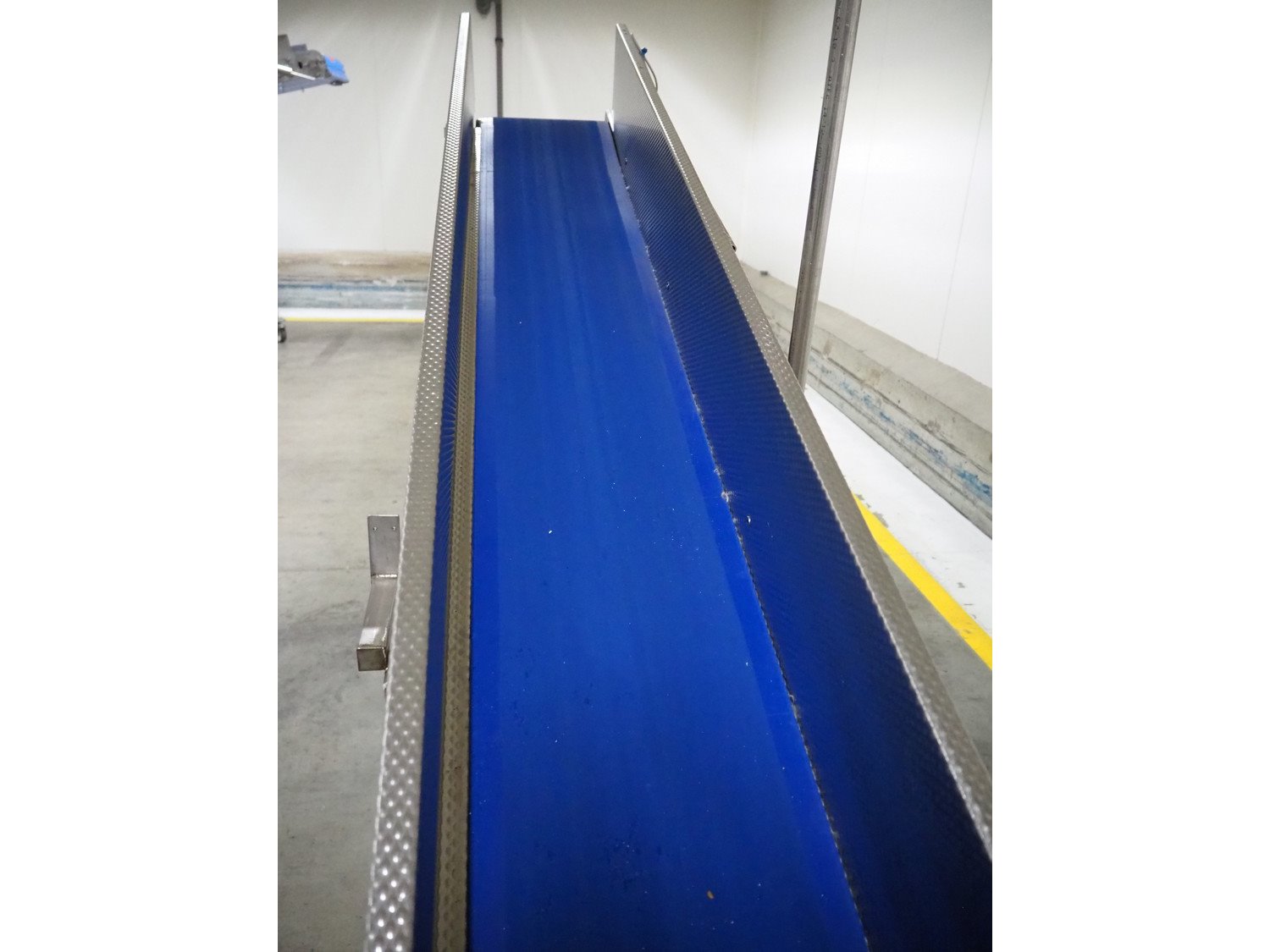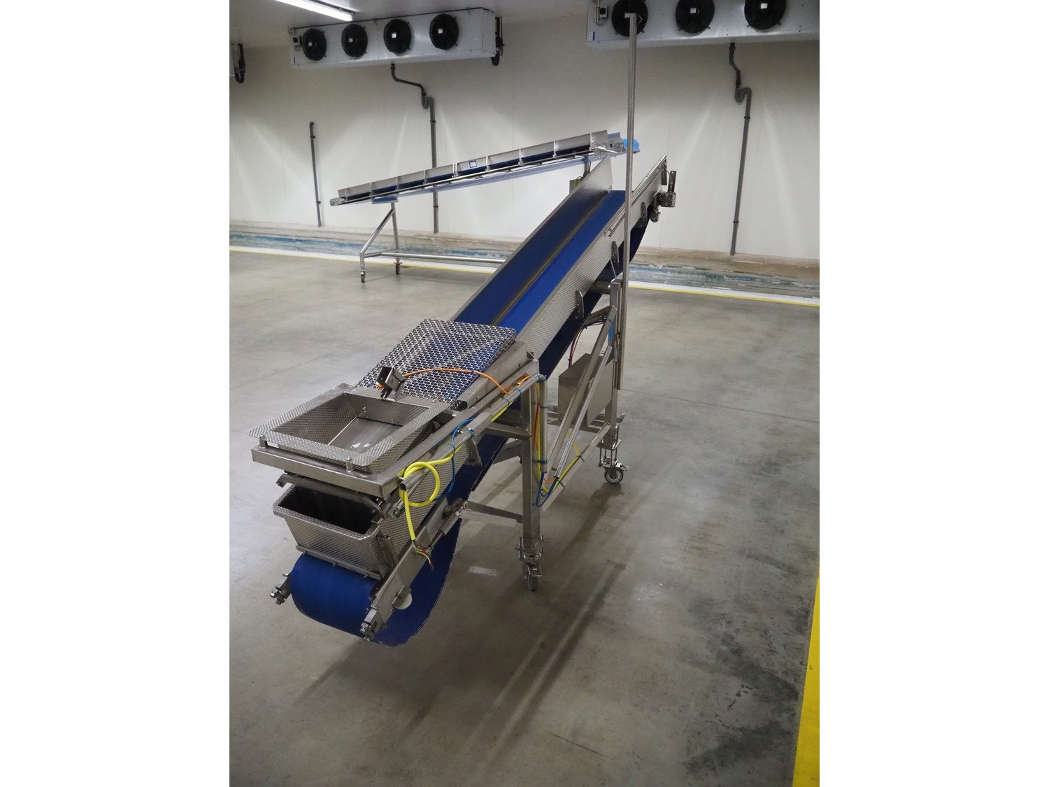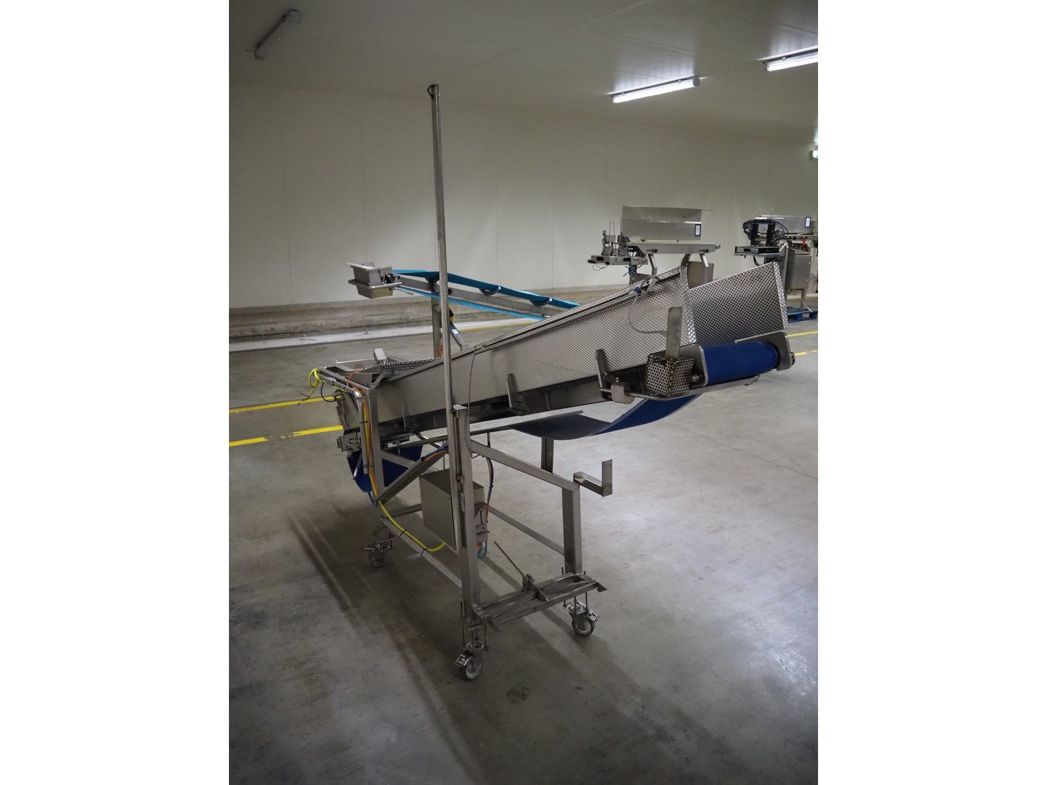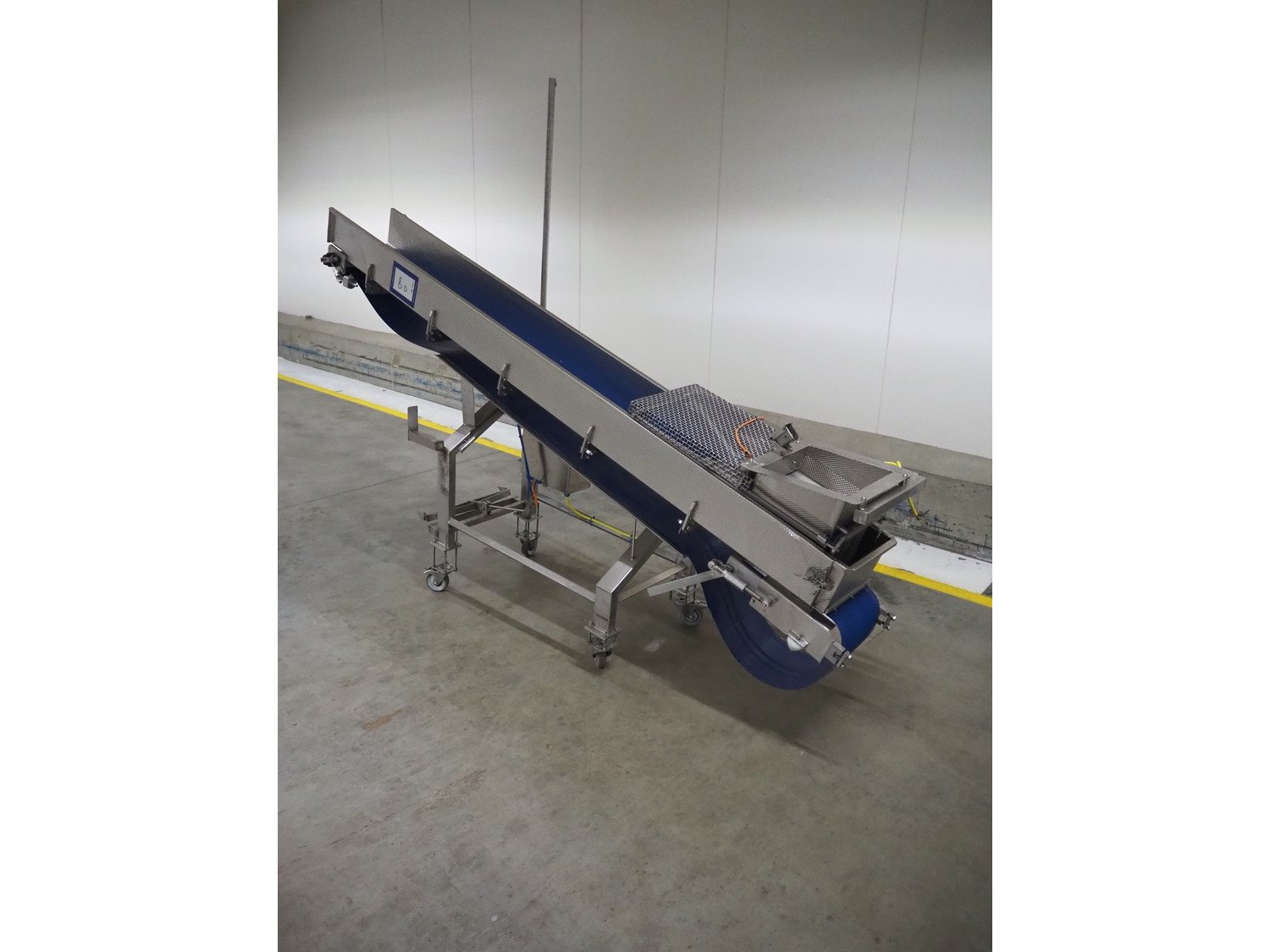 Eillert mobile elevating belt with infeed hopper, type: TR 3000, 230 V, 1.6 A, plastic belt, belt width: 280 mm, elevating height: 1450 mm, total dimensions: 2900 mm x 700 mm x 1700 mm.