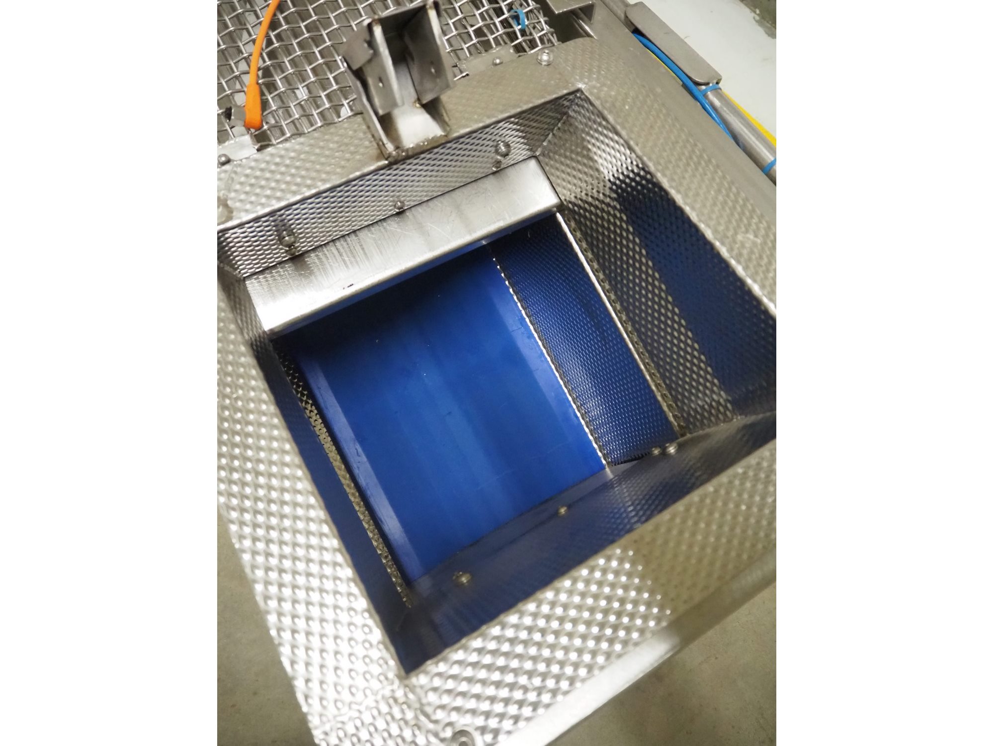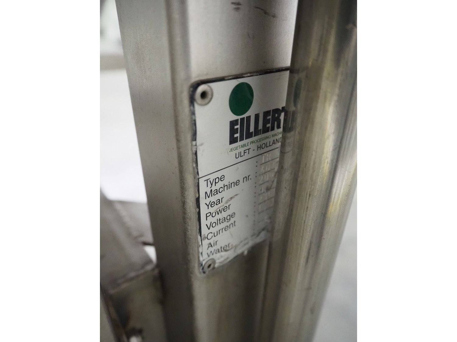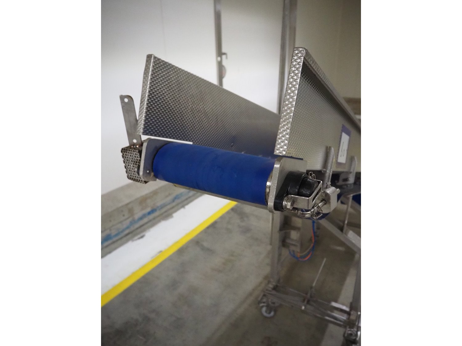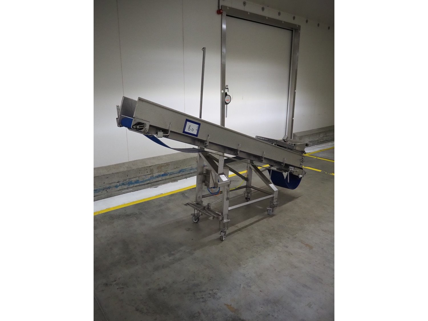 Eillert mobile elevating belt with infeed hopper, type: TR 3000, 230 V, 1.6 A, plastic belt, belt width: 280 mm, elevating height: 1450 mm, total dimensions: 2900 mm x 700 mm x 1700 mm.