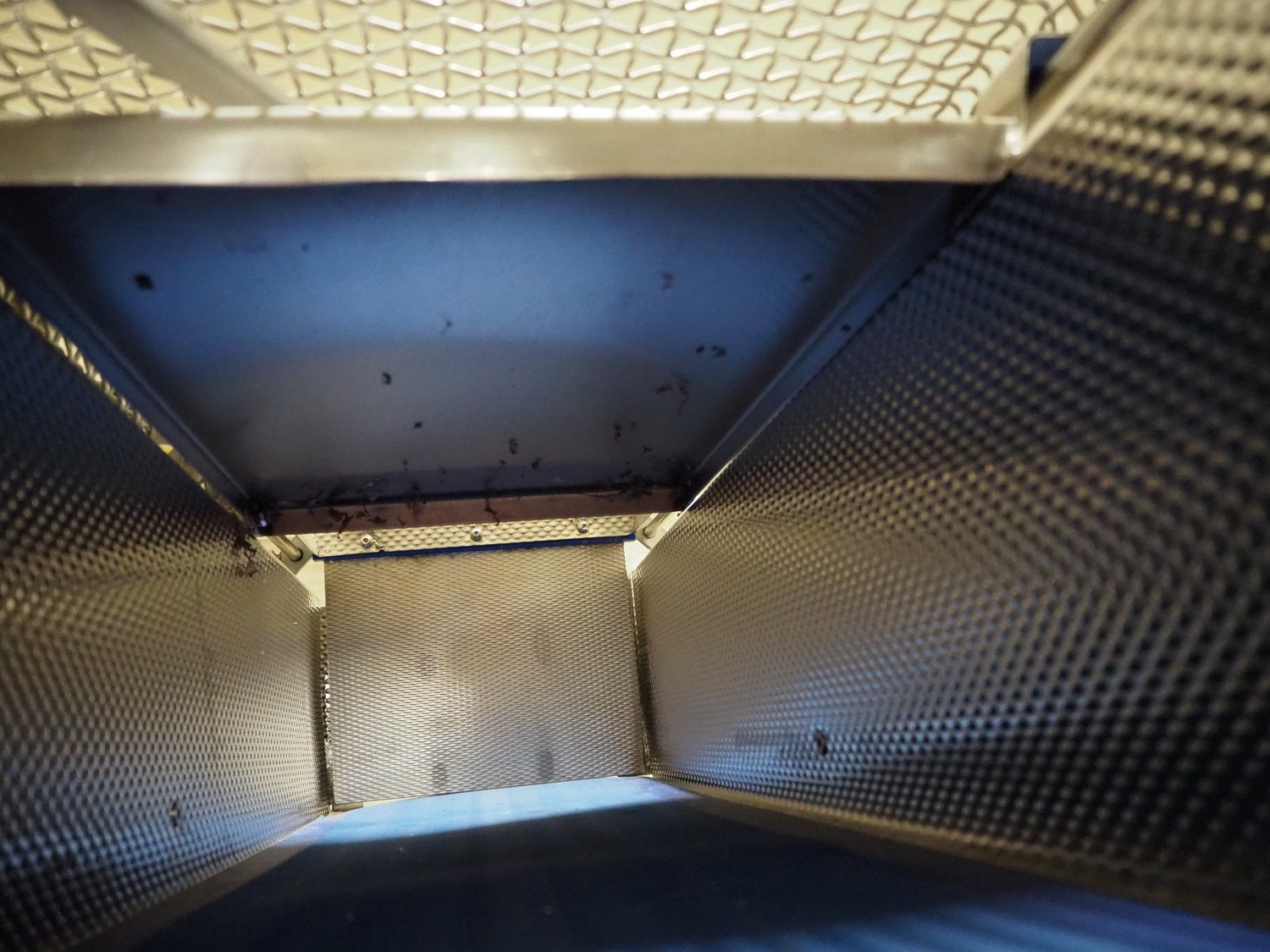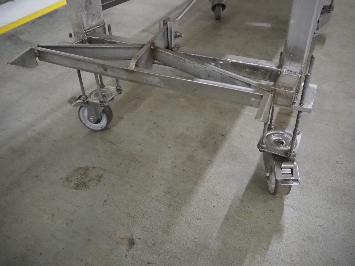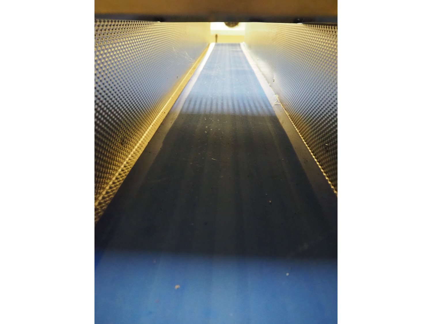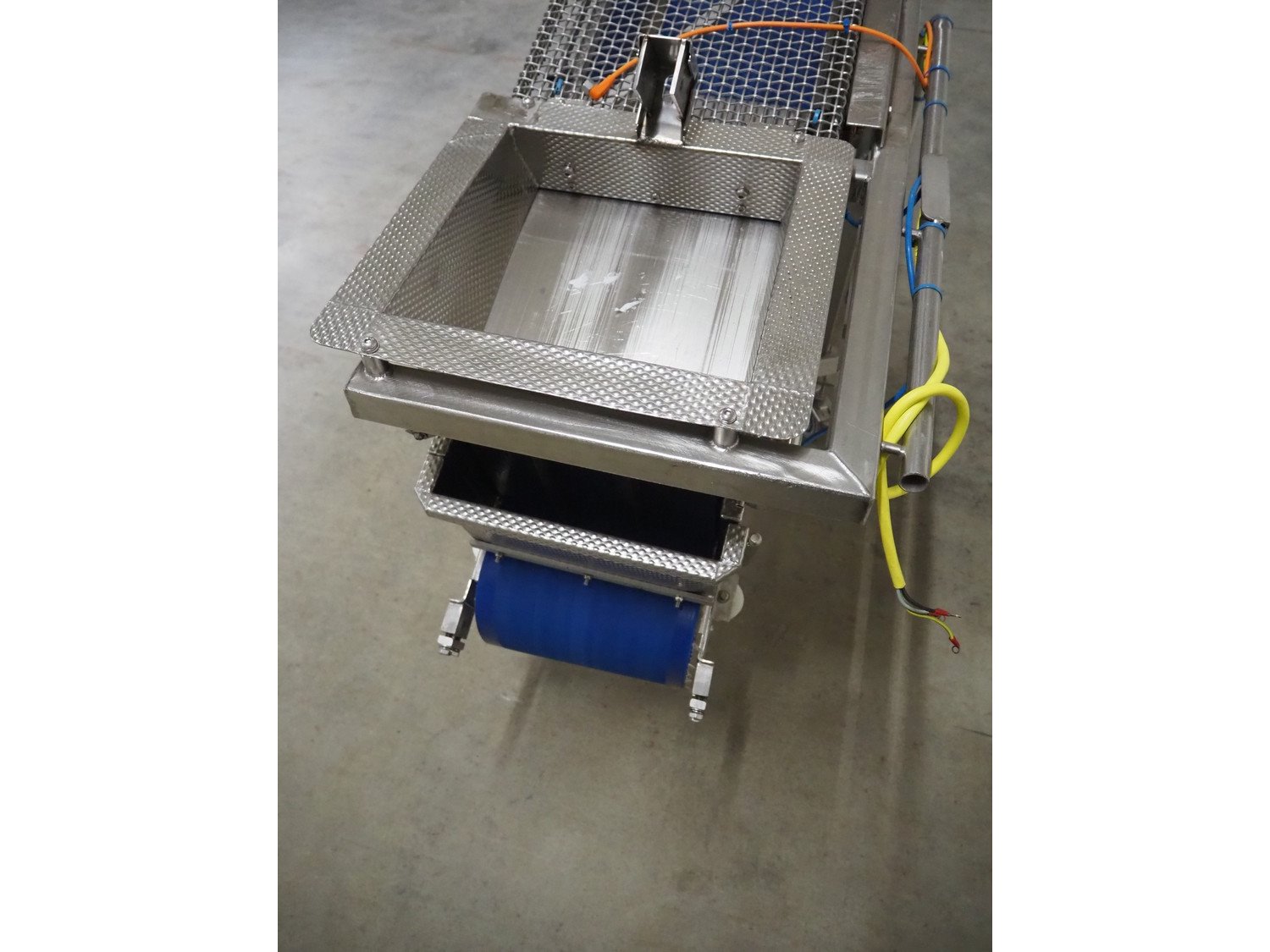 Eillert mobile elevating belt with infeed hopper, type: TR 3000, 230 V, 1.6 A, plastic belt, belt width: 280 mm, elevating height: 1450 mm, total dimensions: 2900 mm x 700 mm x 1700 mm.