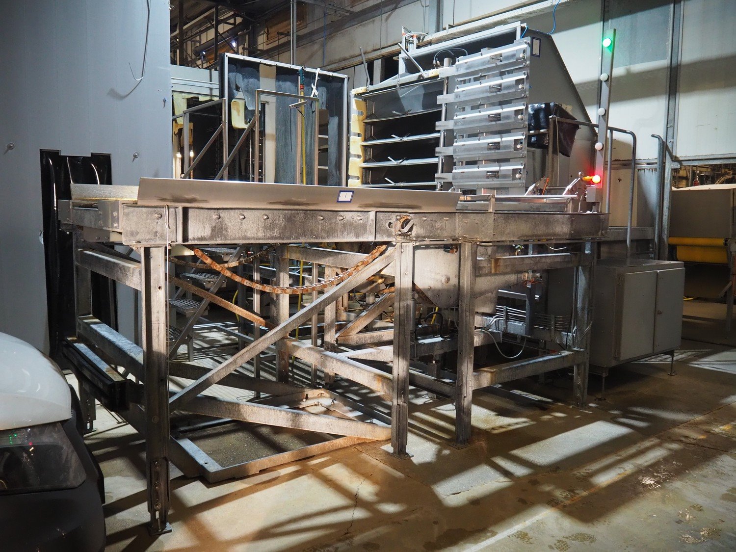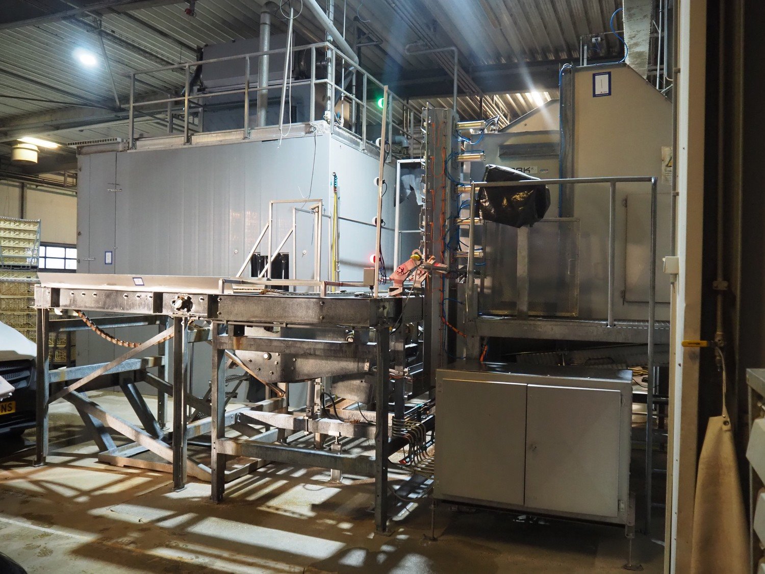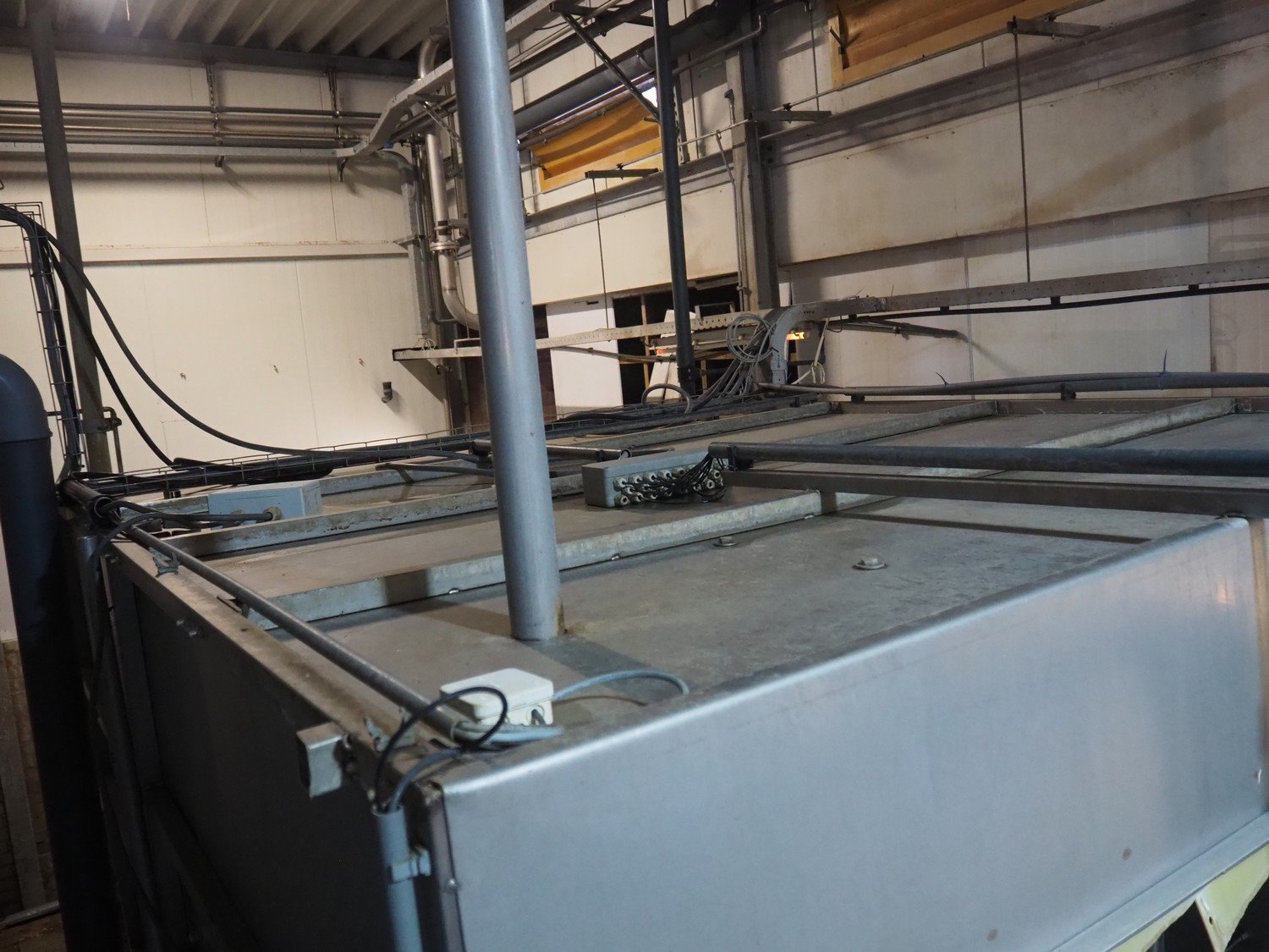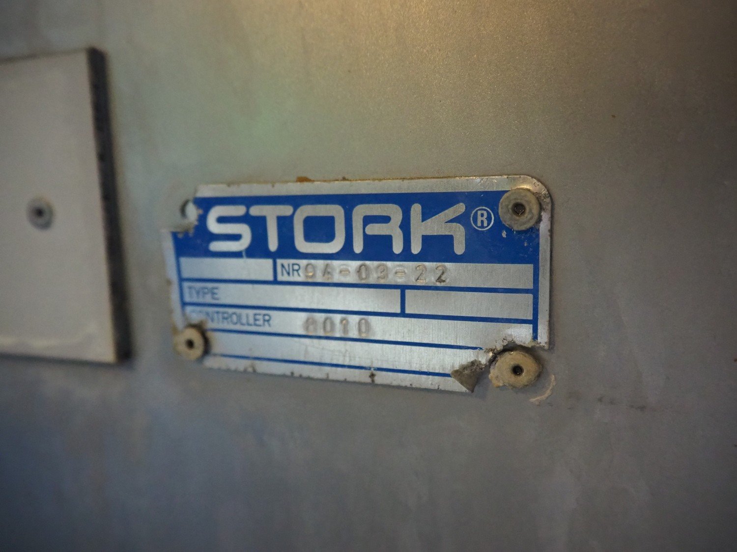 Stork live-bird unloading system with crate washing machine, number: 94-03-22, total belt width: 1200 mm, plastic outfeed belt, belt width: 1600 mm, clearance washing machine: 1200 mm x 1400 mm, total dimensions: 10000 mm x 2600 mm x 3400 mm. Important! A bid on a lot is including professional dismantling. Pickup of the lots on 12 December 2025 at pre-specified times.