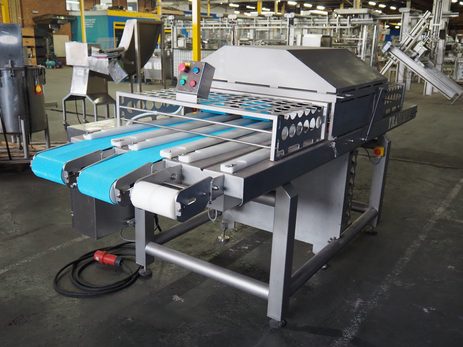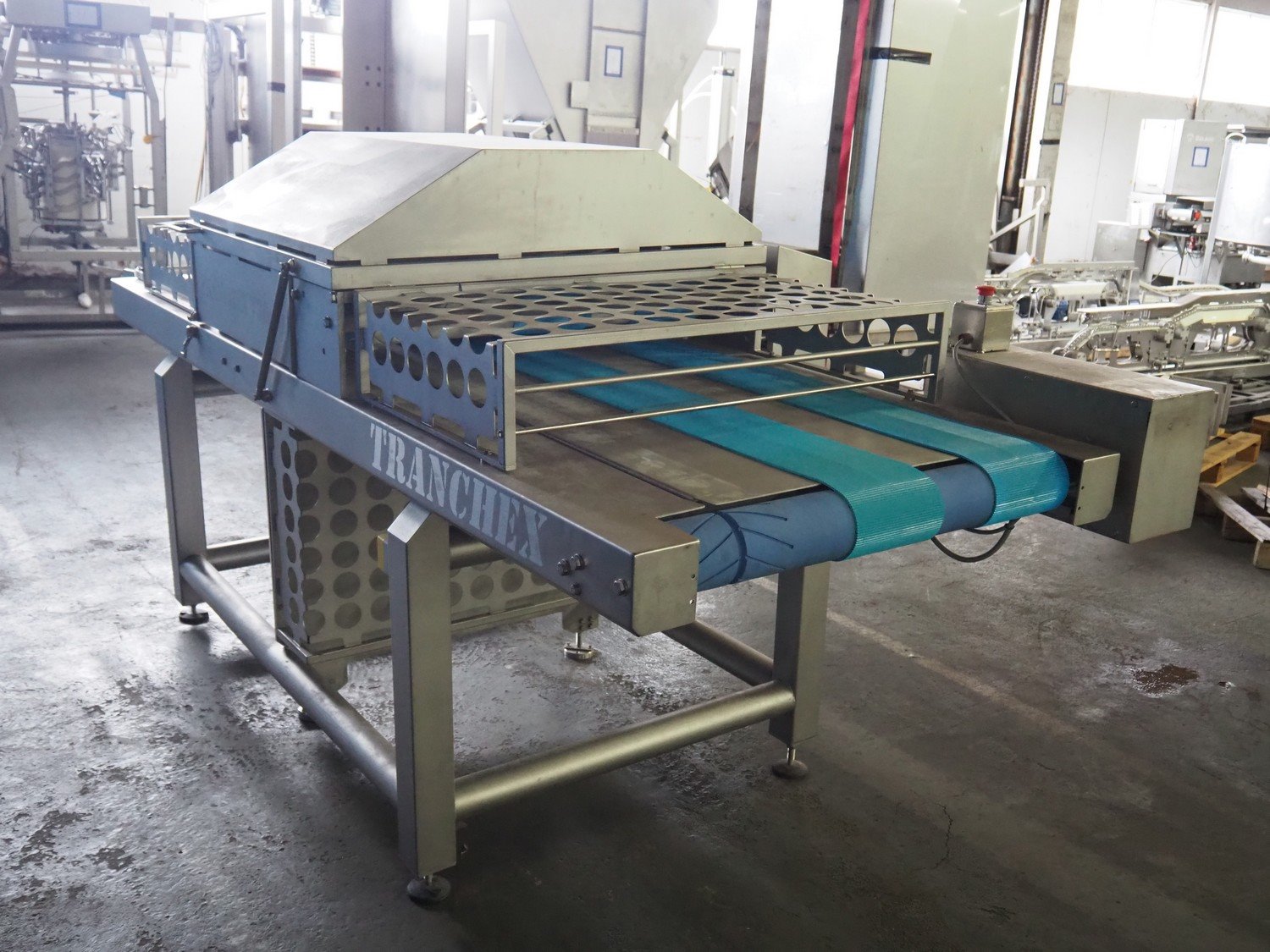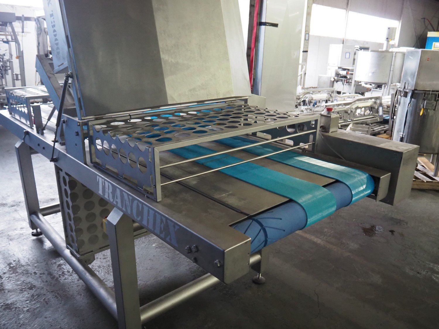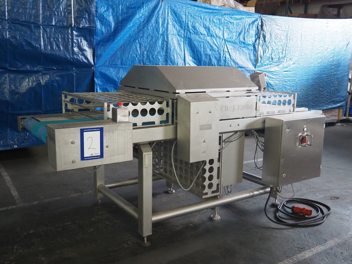 Thielemann Tranchex 3-lane horizontal breast fillet slicer, type: T3000, number: 2022, plastic belts, belt width: 180 mm, total dimensions: 2950 mm x 1250 mm x 1400 mm. 1 belt missing.