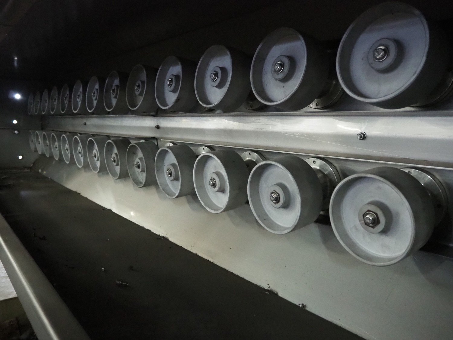 Meyn plucker, machine number: 32436, year of construction: 1989, 64 plucker heads, dimensions: 4800 mm x 2200 mm x 2100 mm. Including pallet with 8 motors, and pallet crate with plastic plucker fingers, dimensions: (1x) 1200 mm x 800 mm x 400 mm, (1x) 1500 mm x 1200 mm x 700 mm.