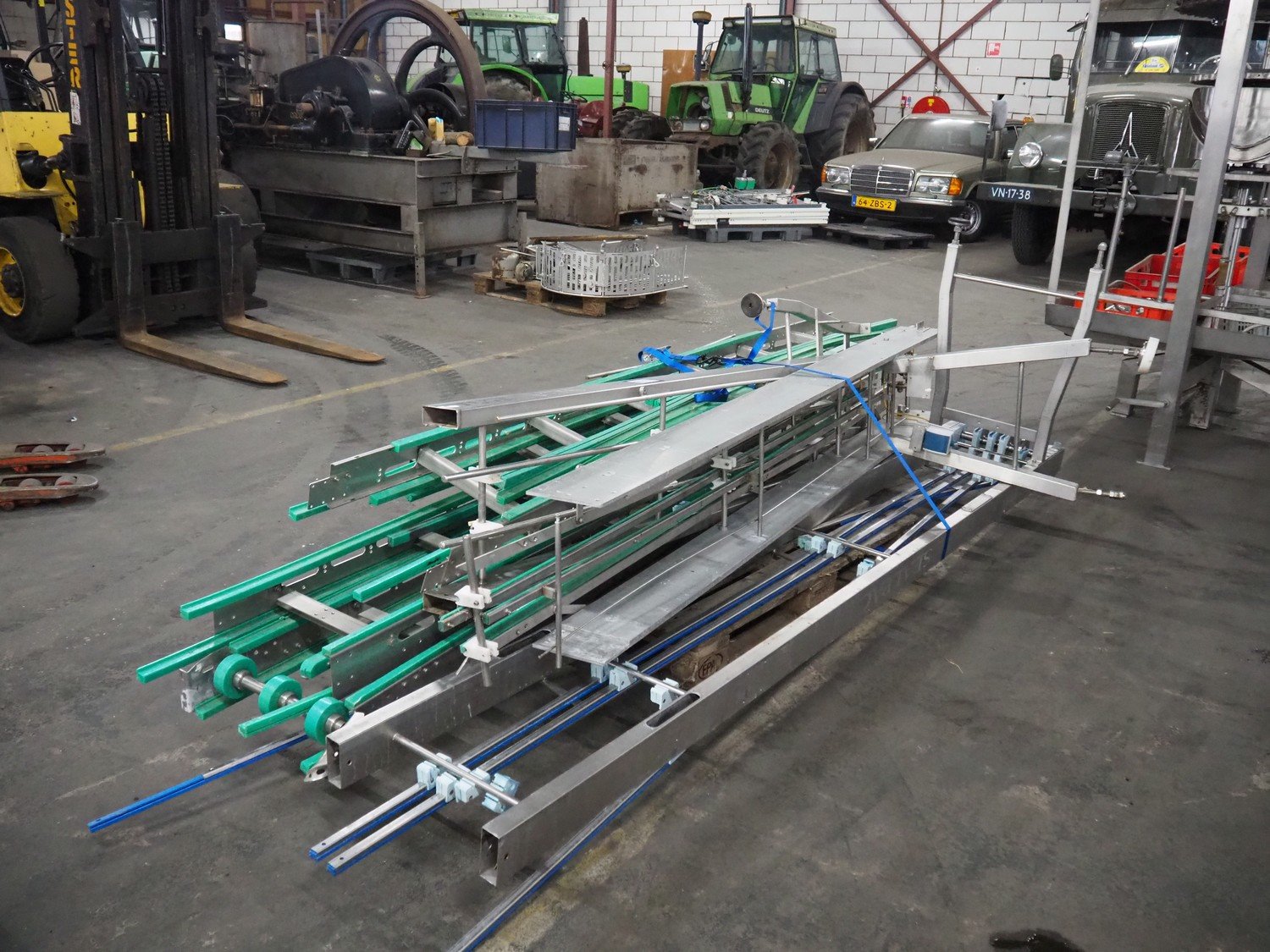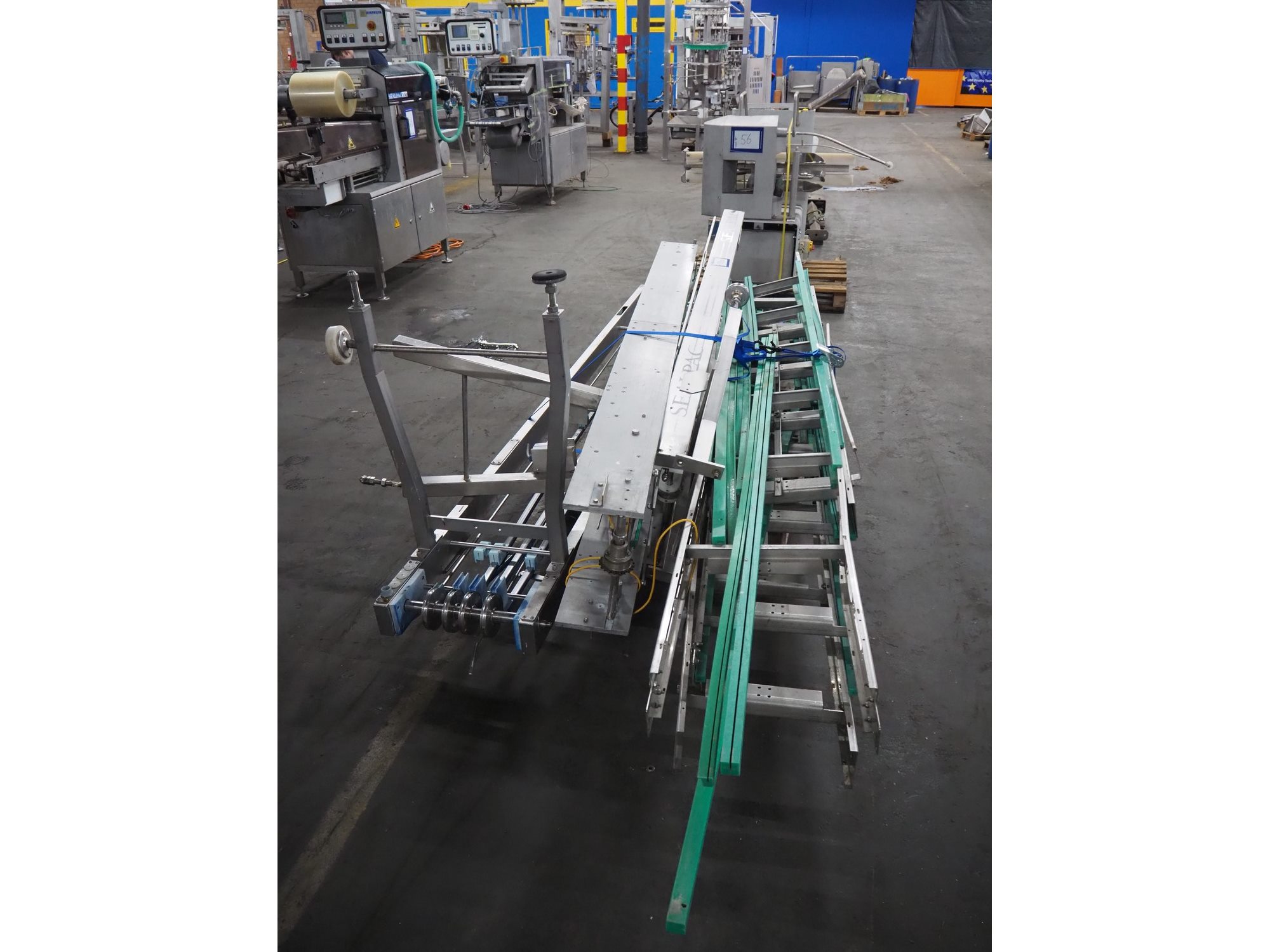 Pallet with various conveyors for Sealpac traysealer, dimensions: 3850 mm x 1700 mm x 1030 mm.