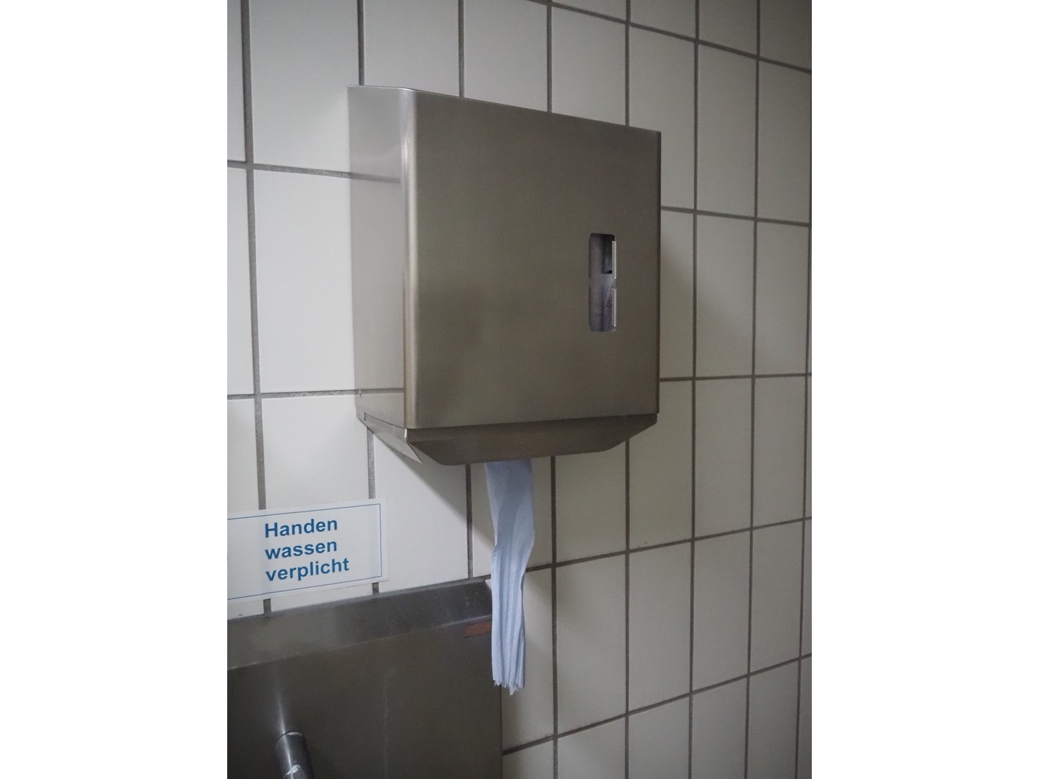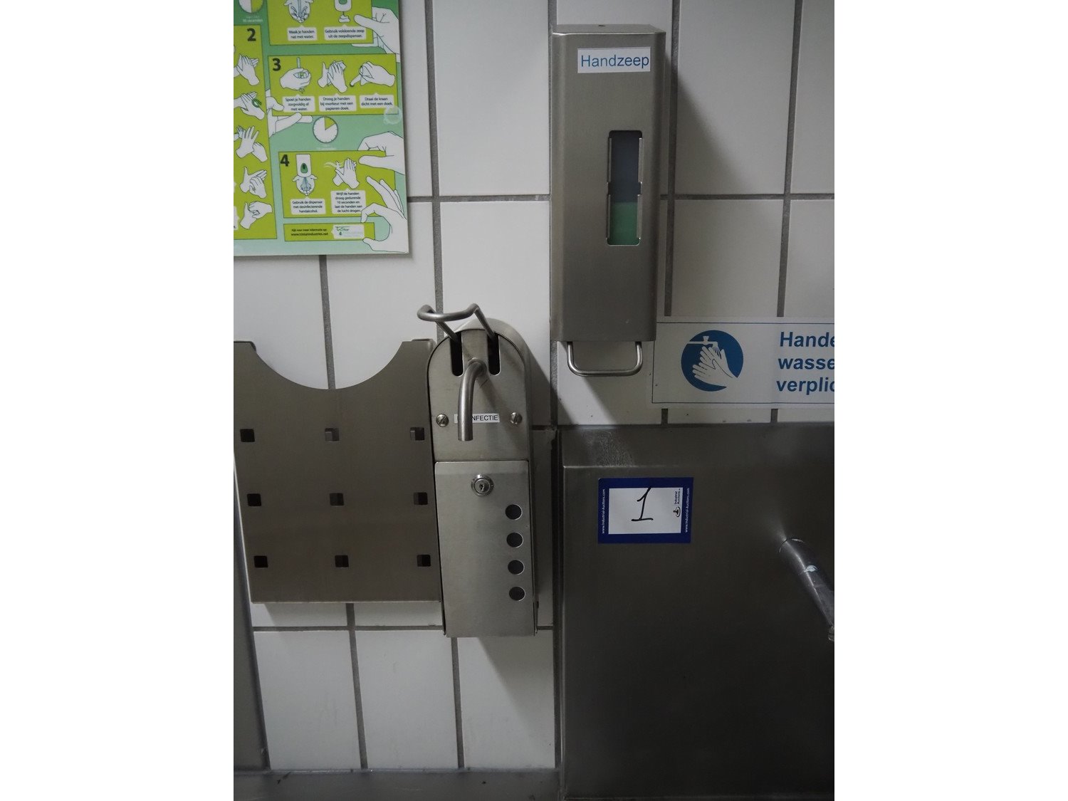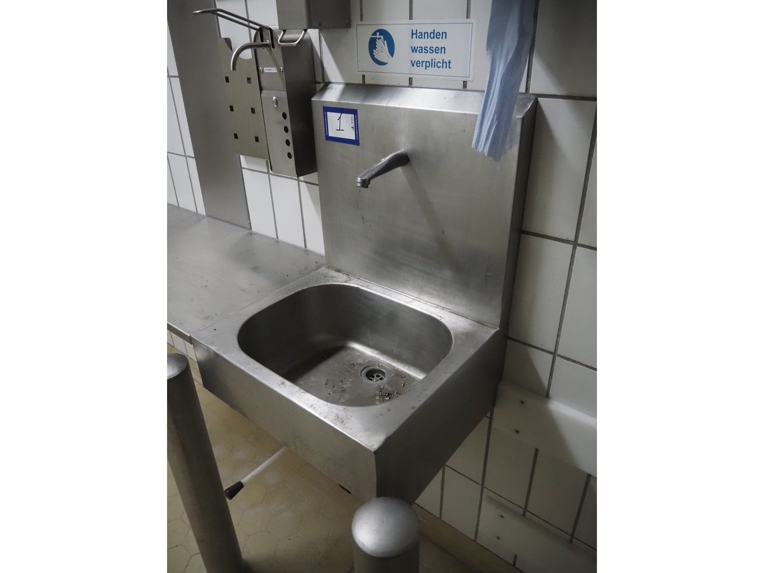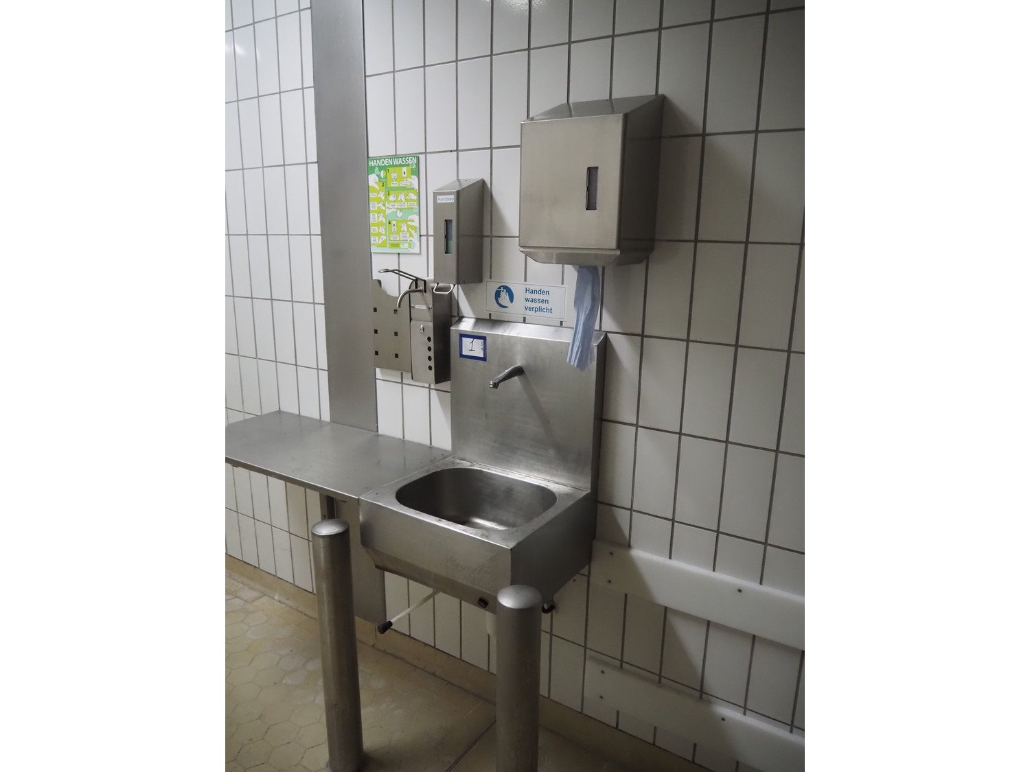 Nieros s/s sink with s/s table, knee control, total dimensions: 1430 mm x 450 mm x 680 mm. Including 2 s/s soap dispensers and s/s paper dispenser.