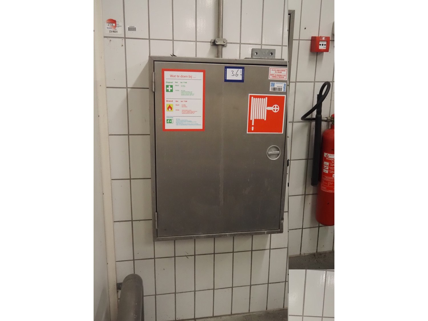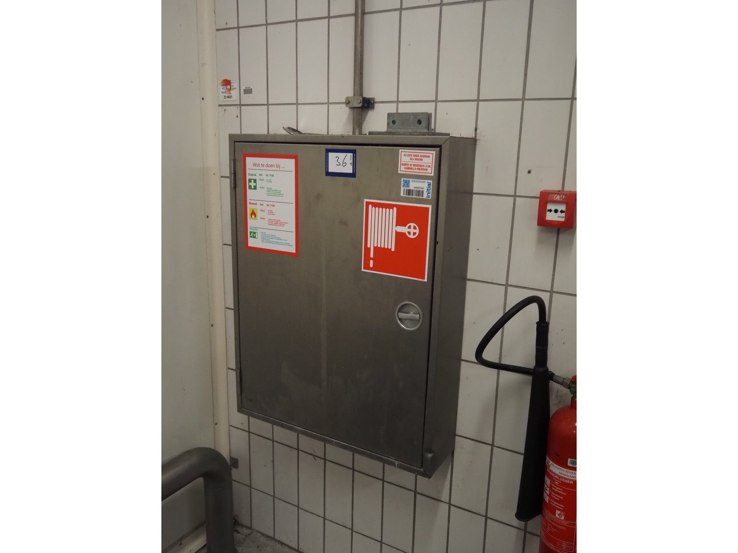 S/s cabinet with Gloria Smeba fire hose reel, dimensions: 730 mm x 180 mm x 940 mm.