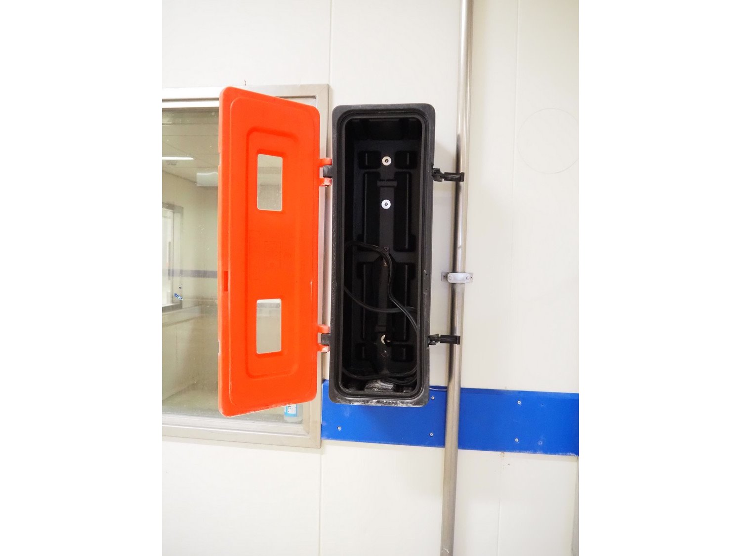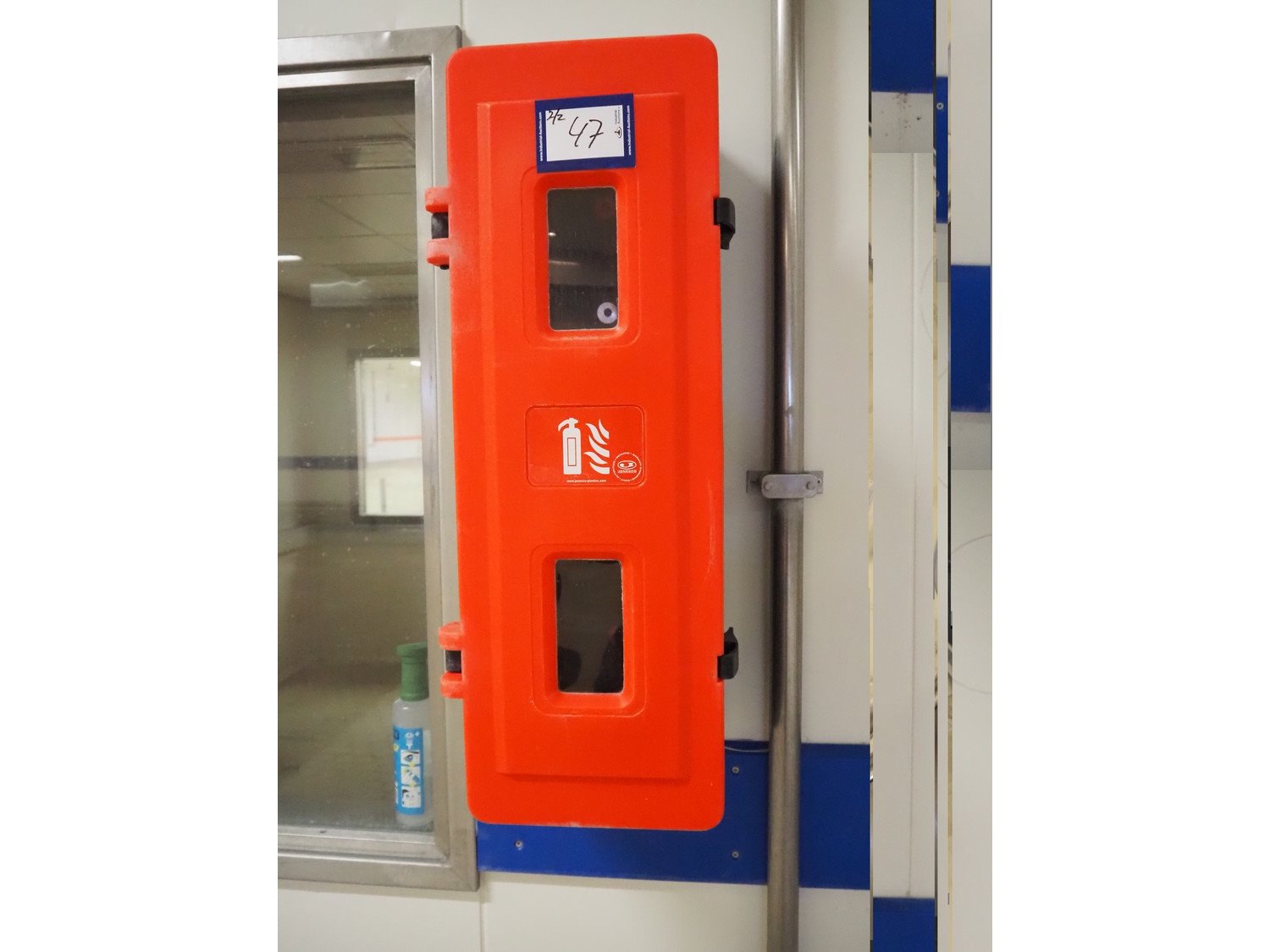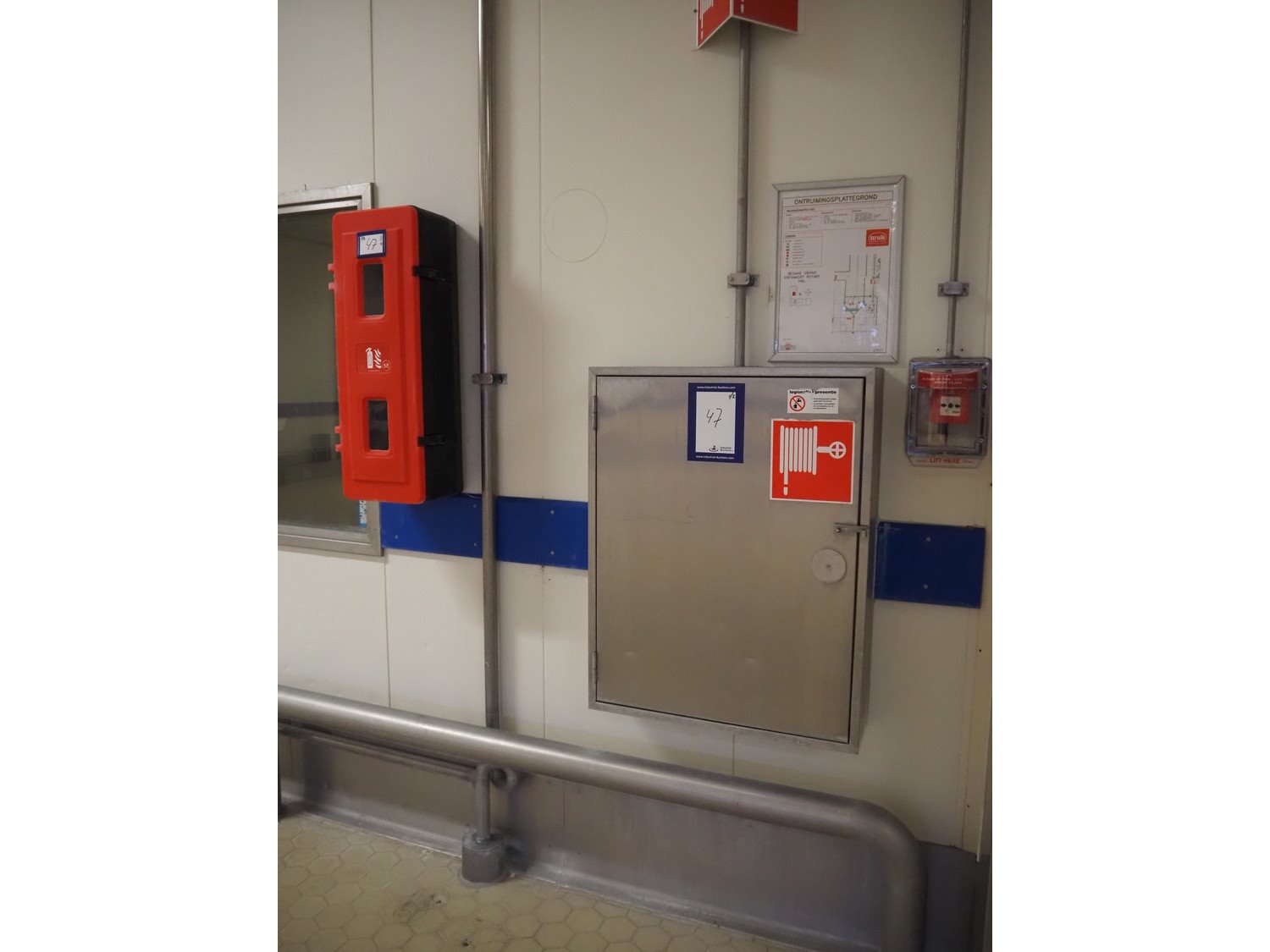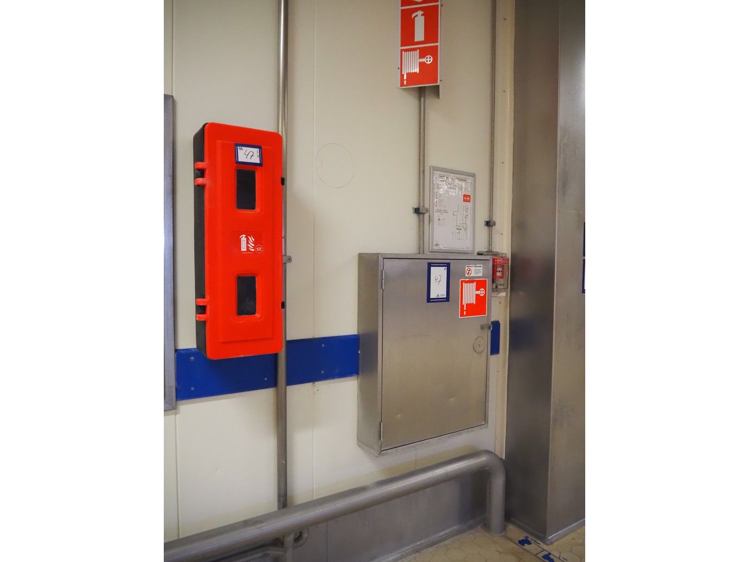 S/s cabinet with BTN fire hose reel and plastic fire extinguisher cabinet, dimensions fire hose reel: 730 mm x 180 mm x 940 mm, dimensions fire extinguisher cabinet: 320 mm x 270 mm x 830 mm. Fire extinguisher is missing.